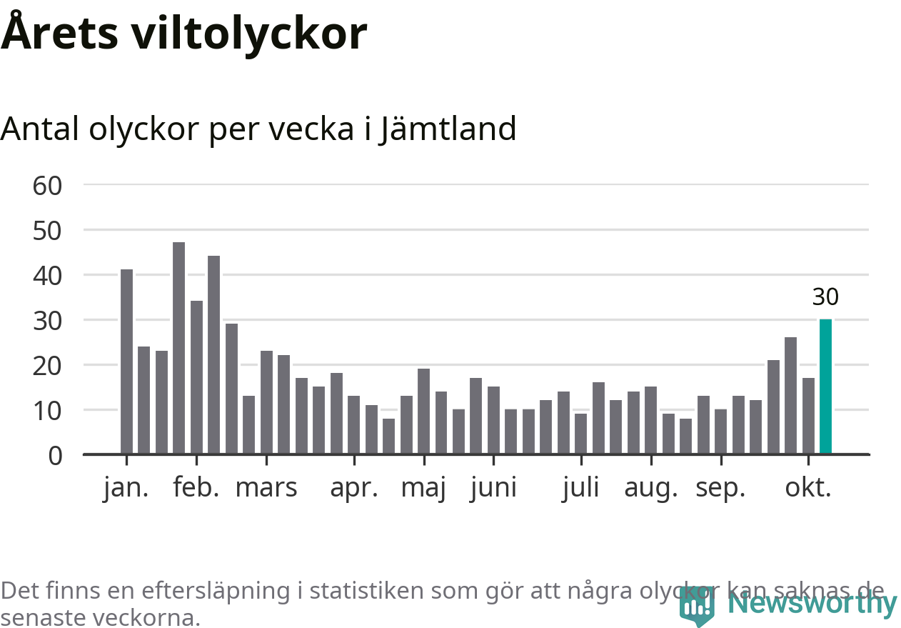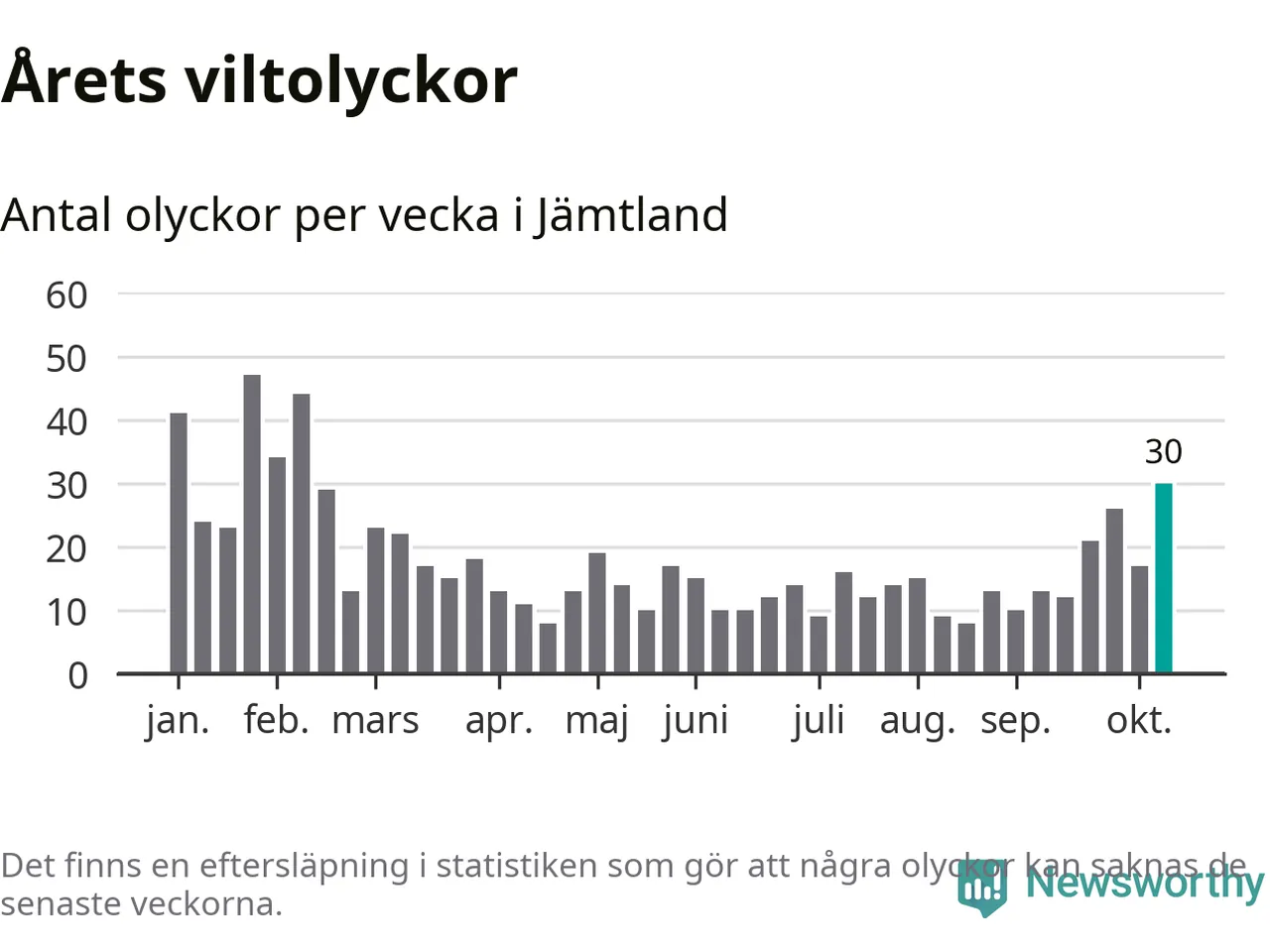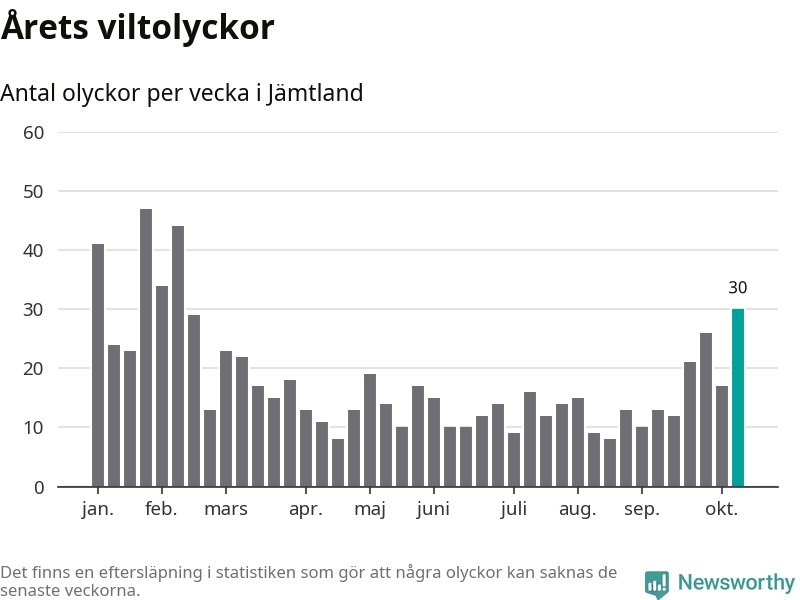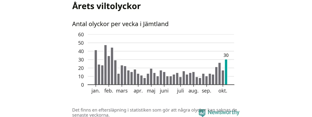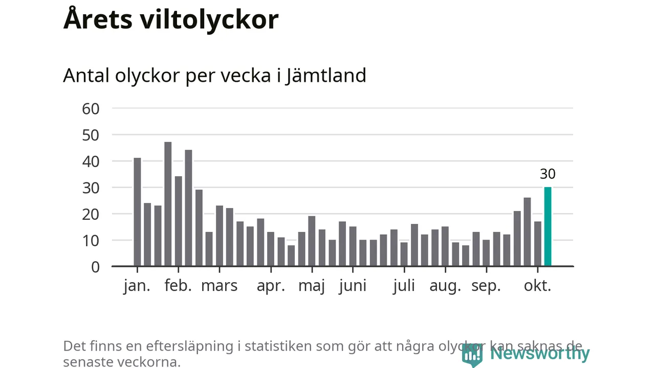 Hittills har 30 viltolyckor rapporterats in i Jämtlands län från vecka 42. Se listan här.