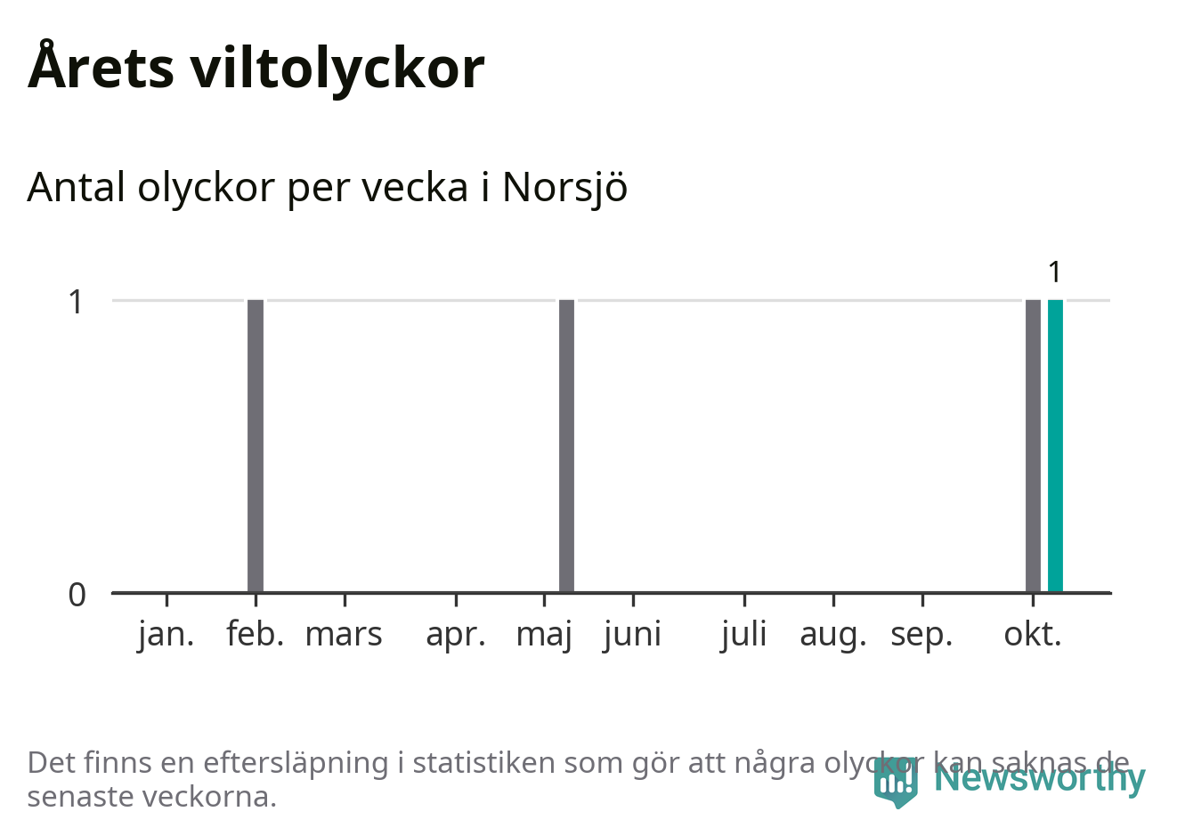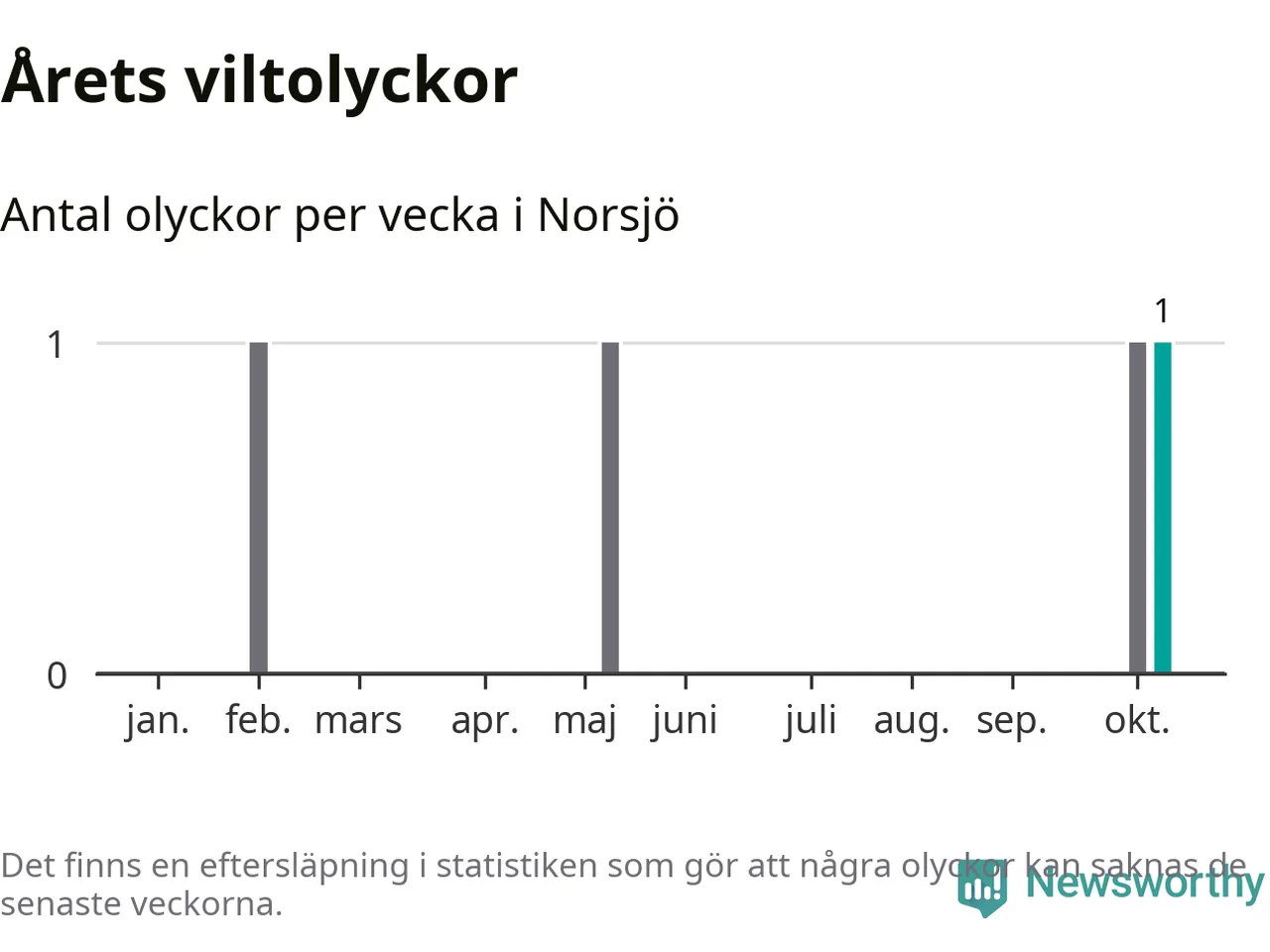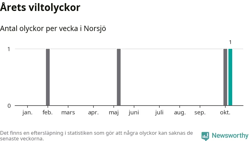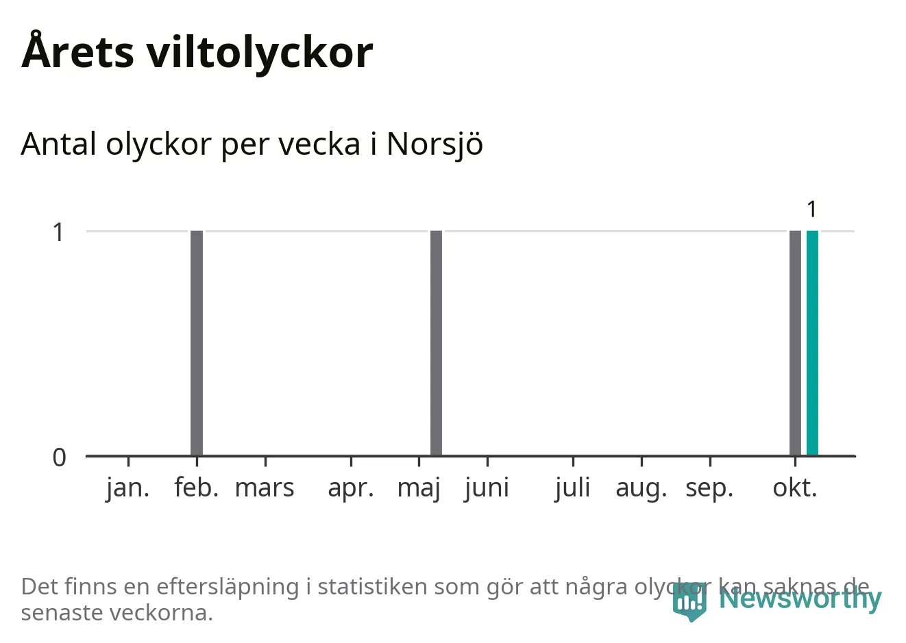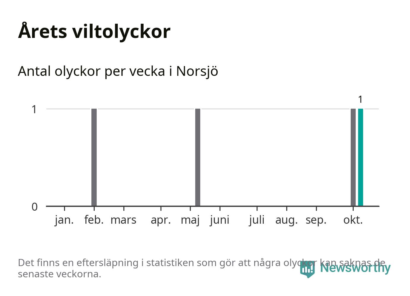 Från förra veckan (vecka 42) har hittills en viltolycka rapporterats in i Norsjö kommun.