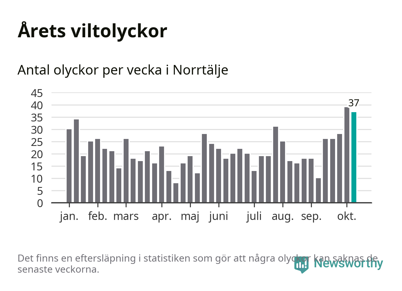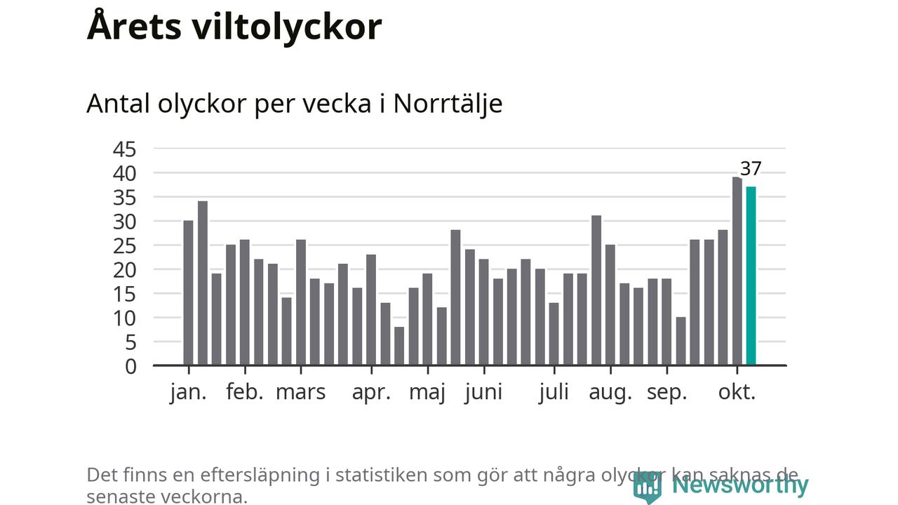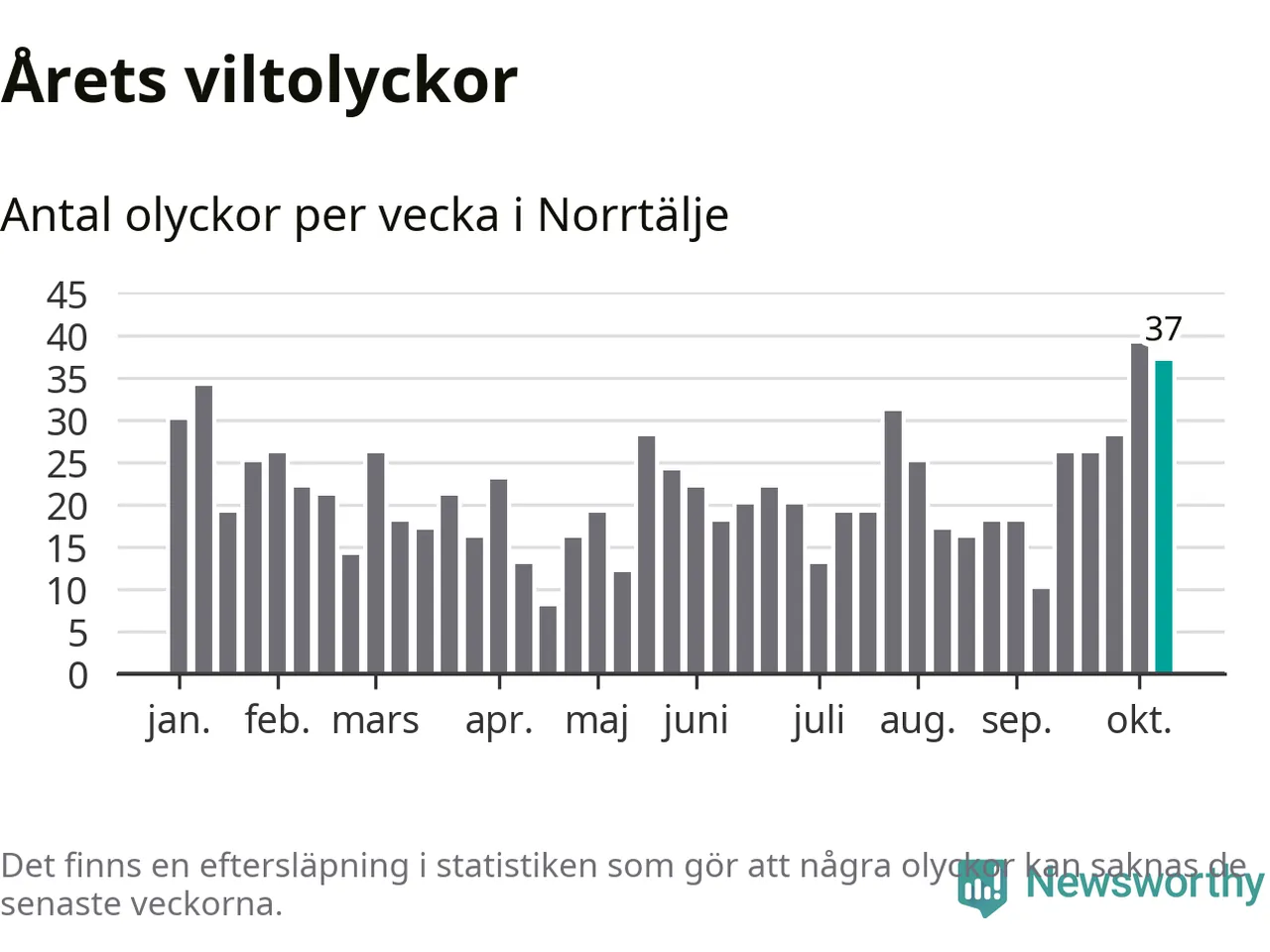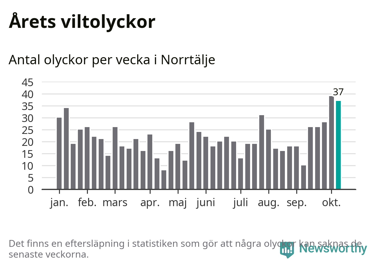 Hittills har 37 viltolyckor rapporterats in i Norrtälje kommun från vecka 42. Det är en av de högsta siffrorna för en enskild vecka på över tio år.