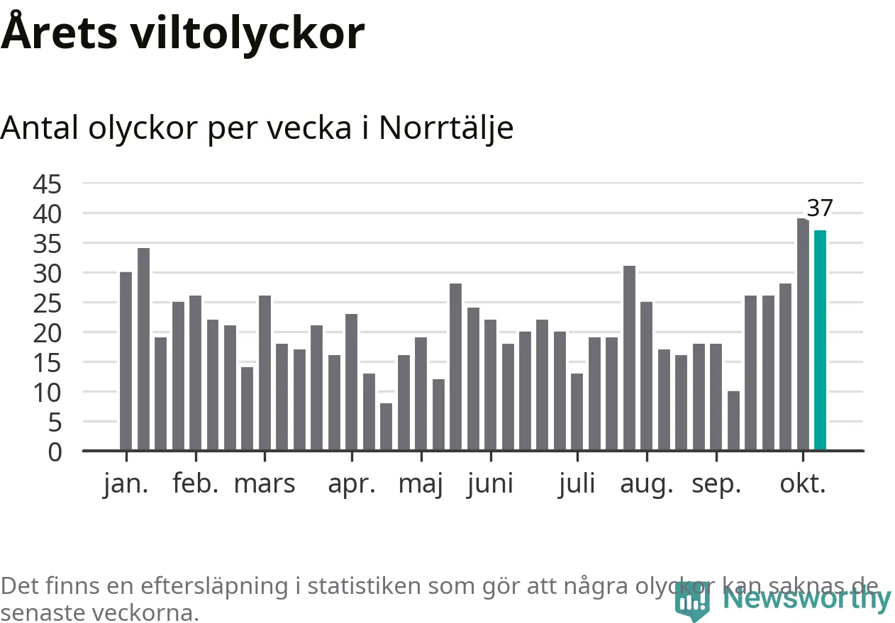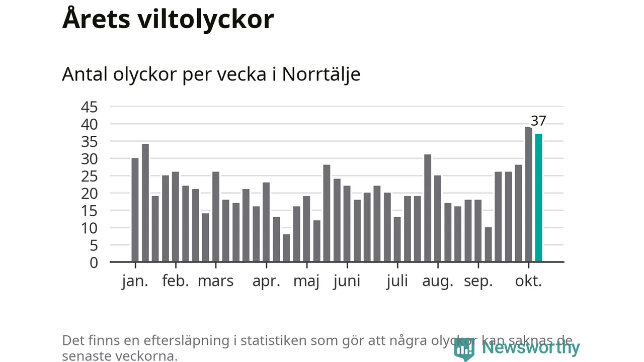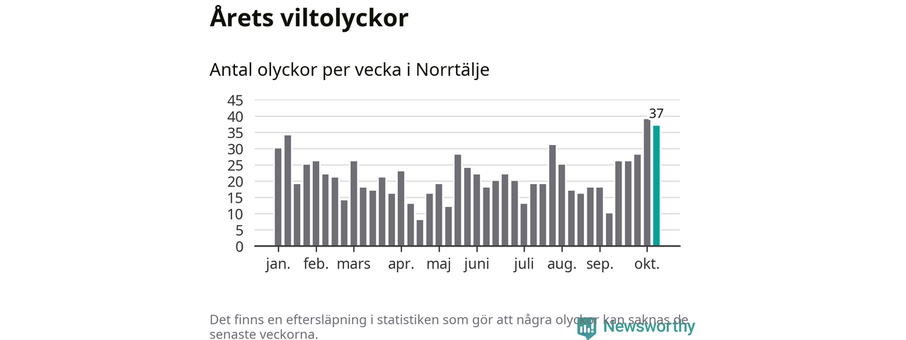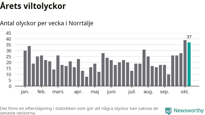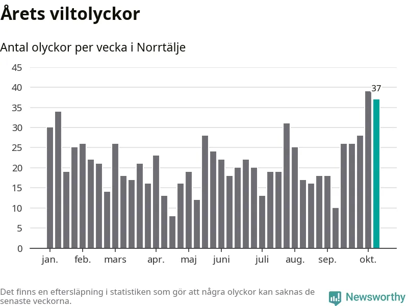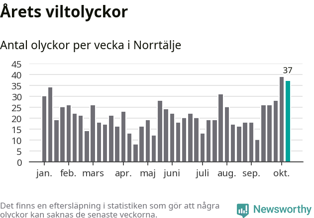 Hittills har 37 viltolyckor rapporterats in i Norrtälje kommun från vecka 42. Det är en av de högsta siffrorna för en enskild vecka på över tio år.