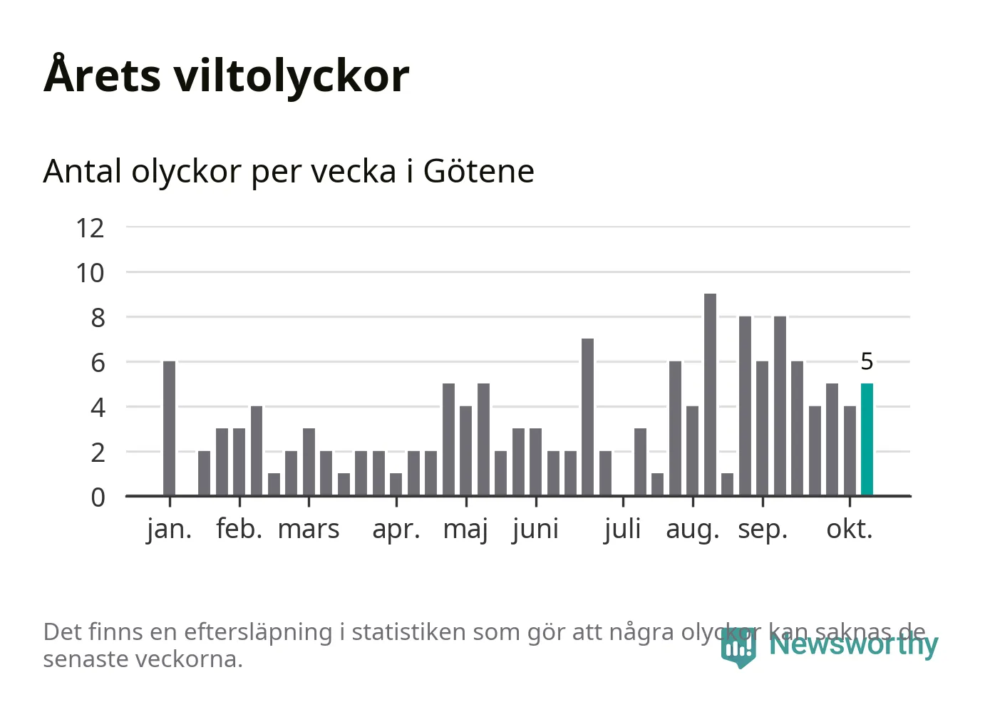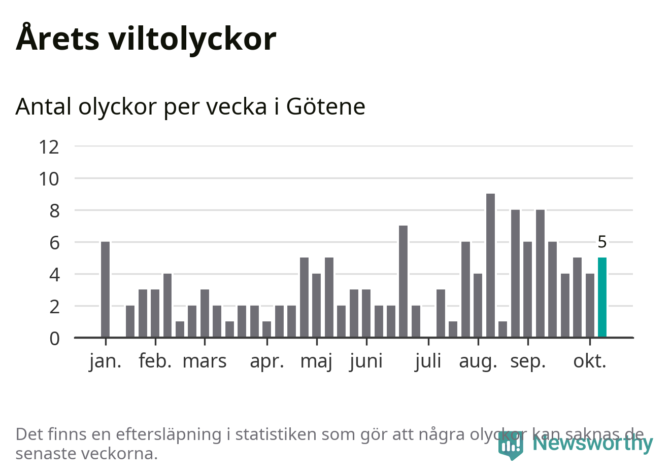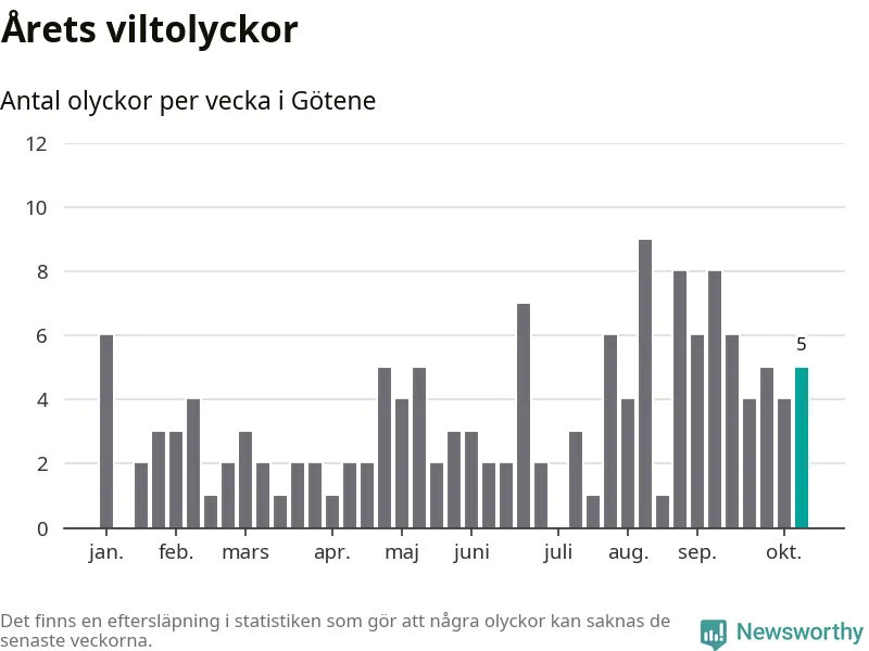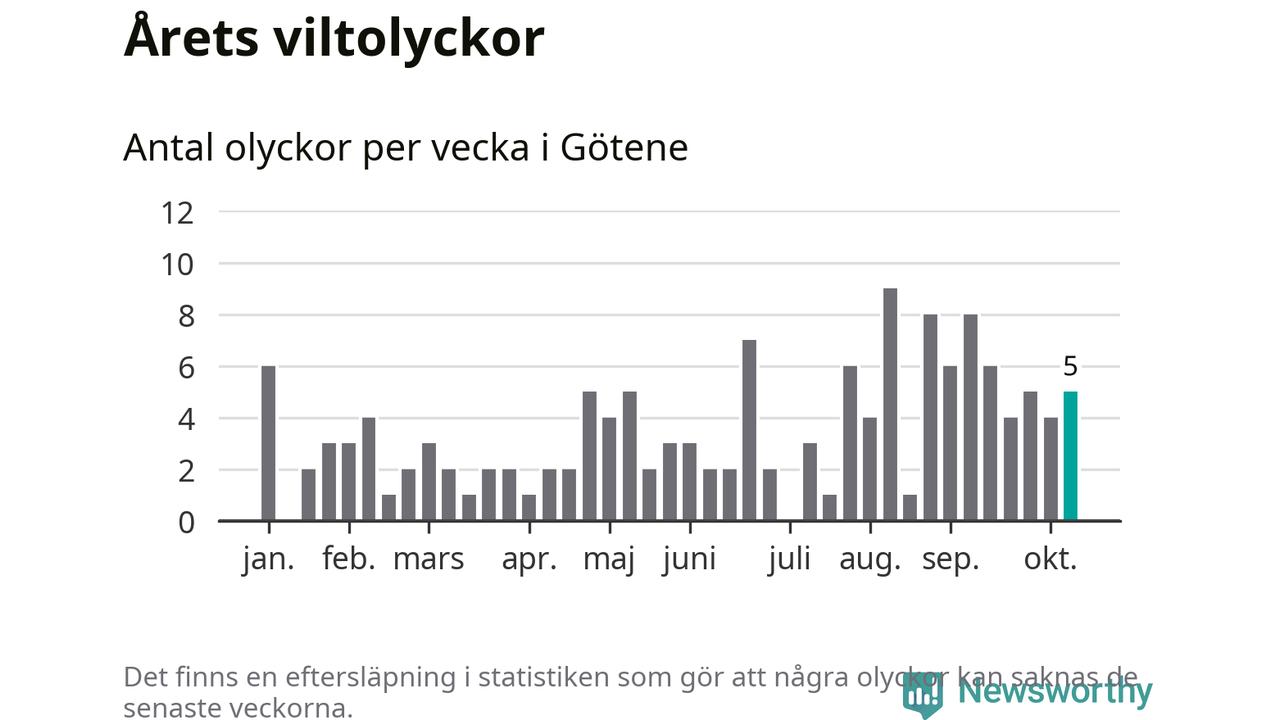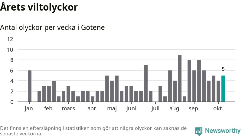 Hittills har fem viltolyckor rapporterats in i Götene kommun från vecka 42. Se listan här.