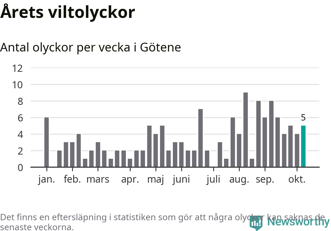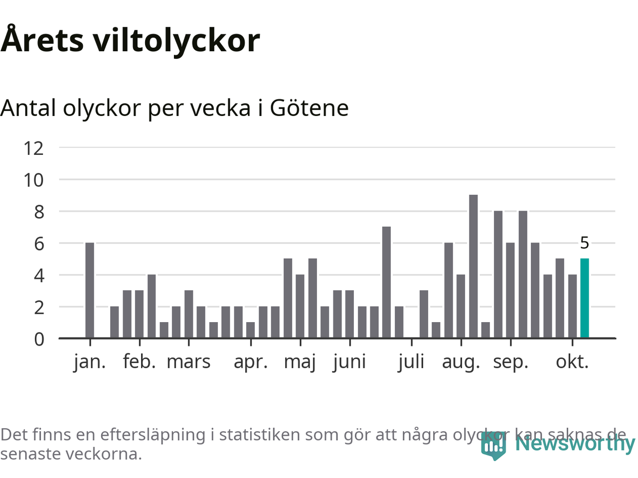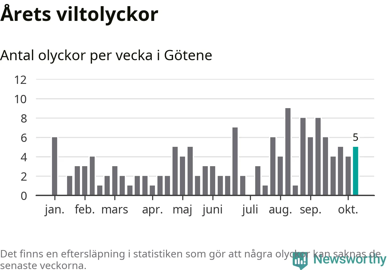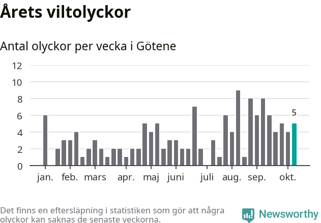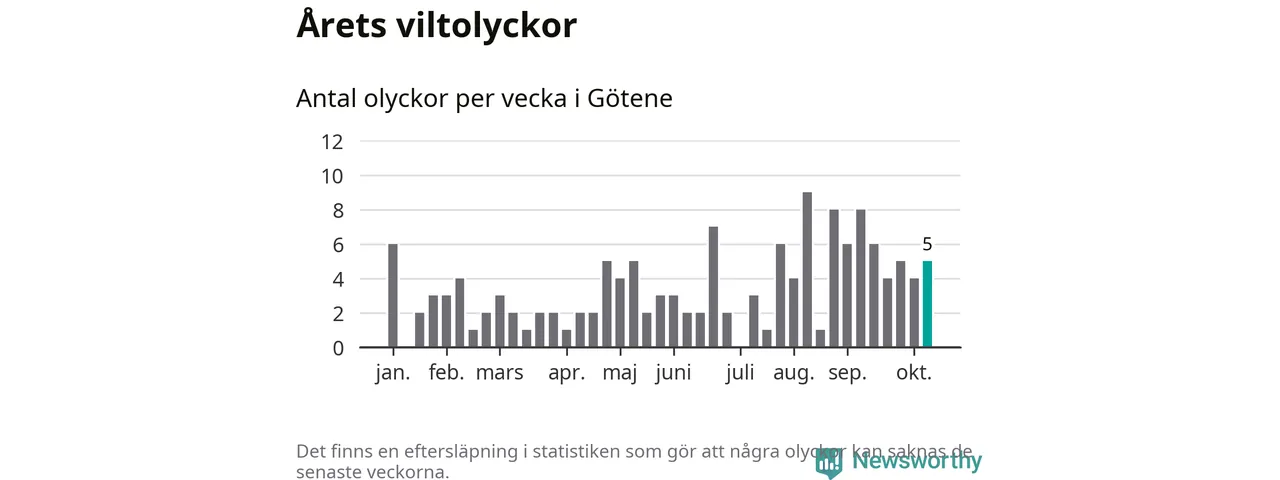 Hittills har fem viltolyckor rapporterats in i Götene kommun från vecka 42. Se listan här.