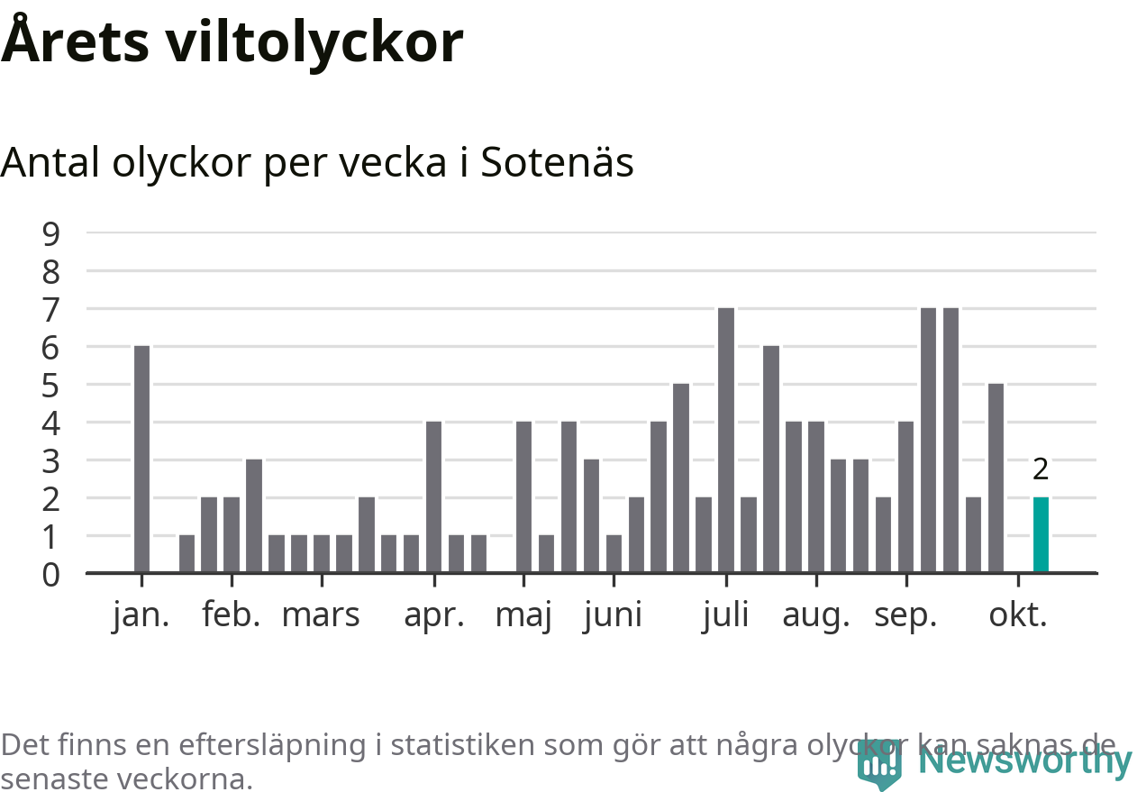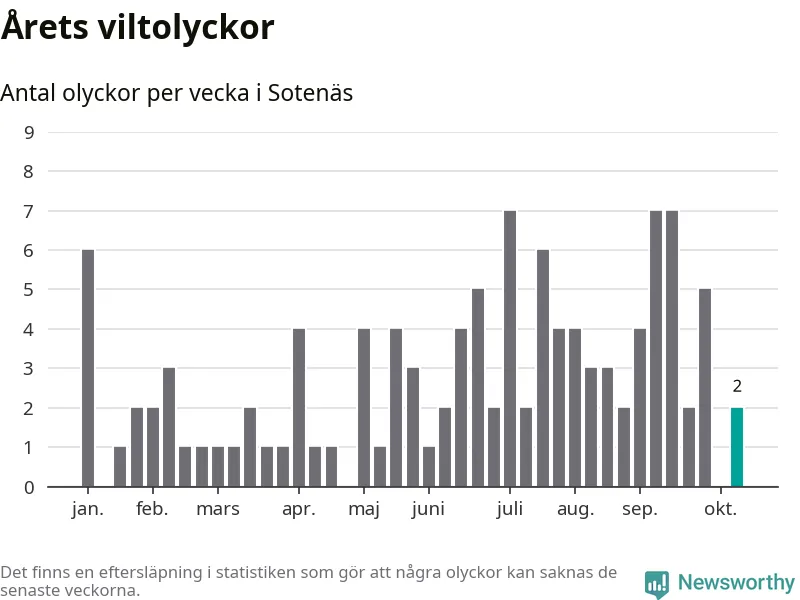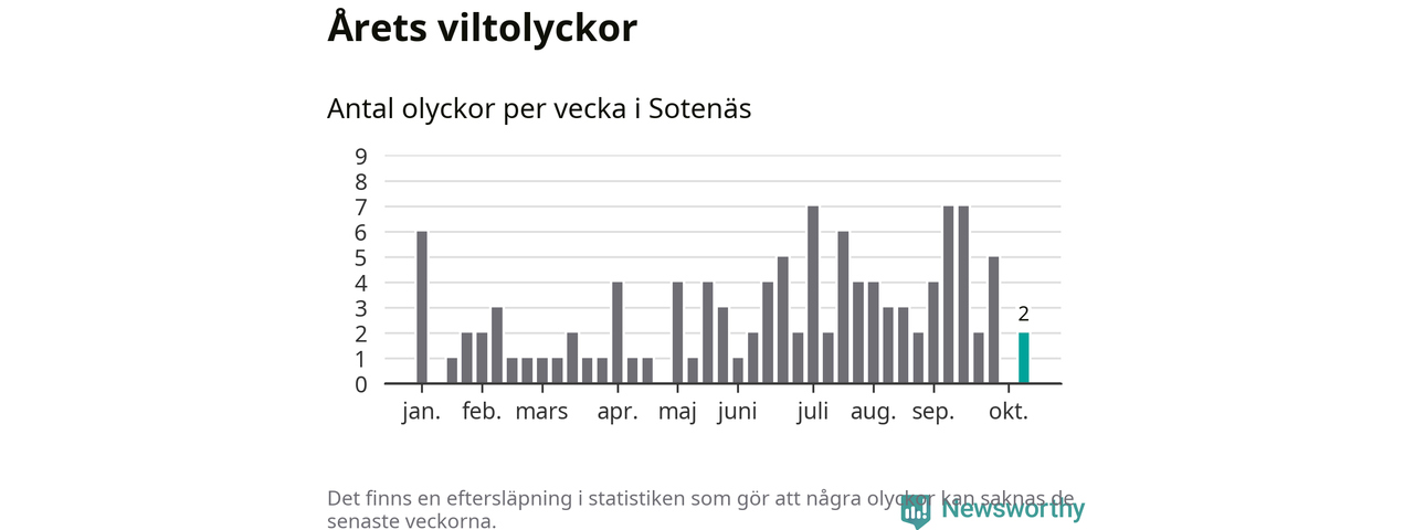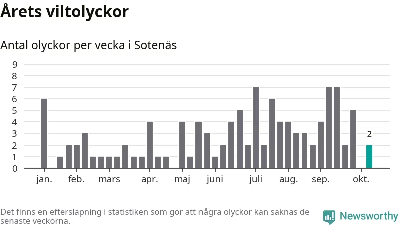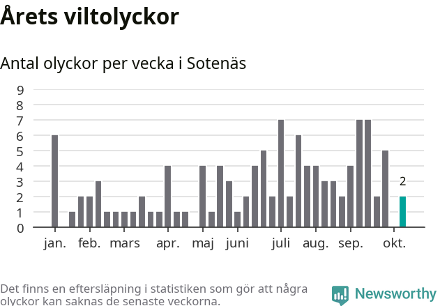 Hittills har två viltolyckor rapporterats in i Sotenäs kommun från vecka 42. Se listan här.