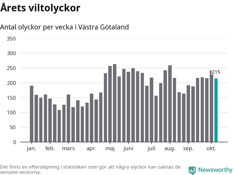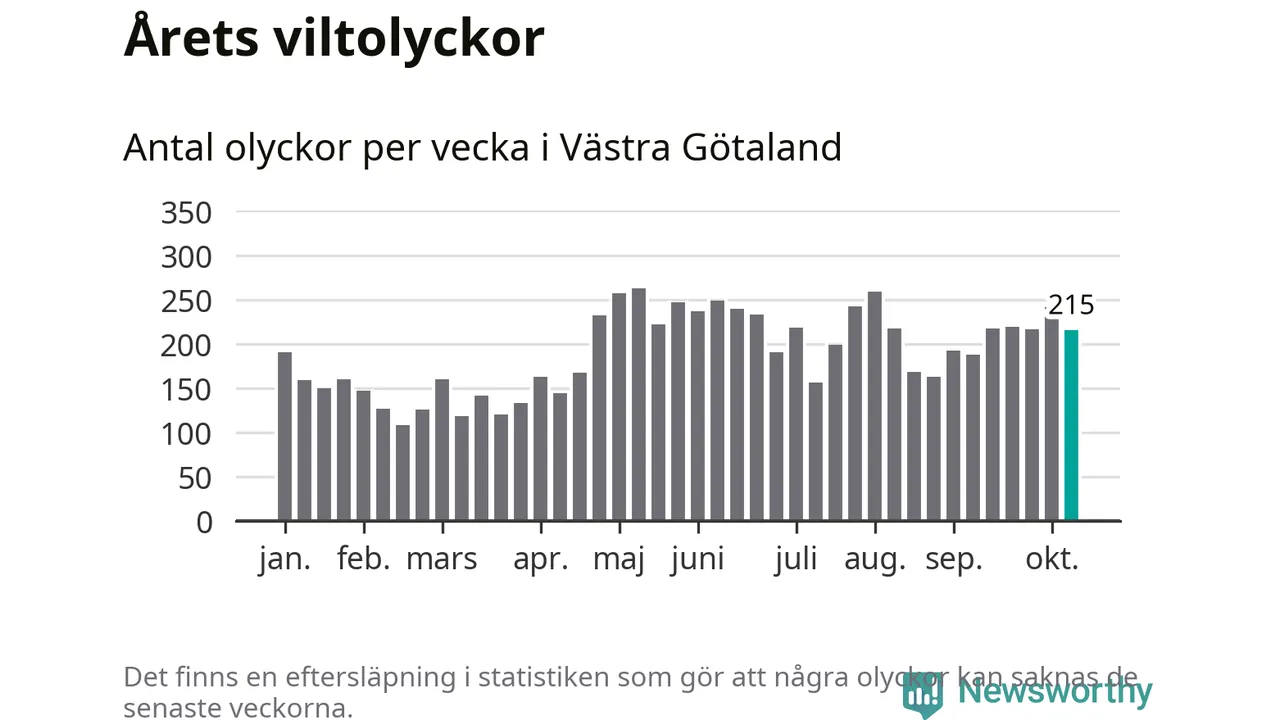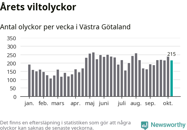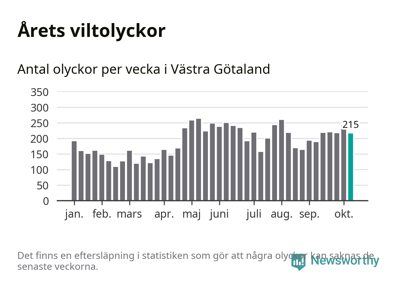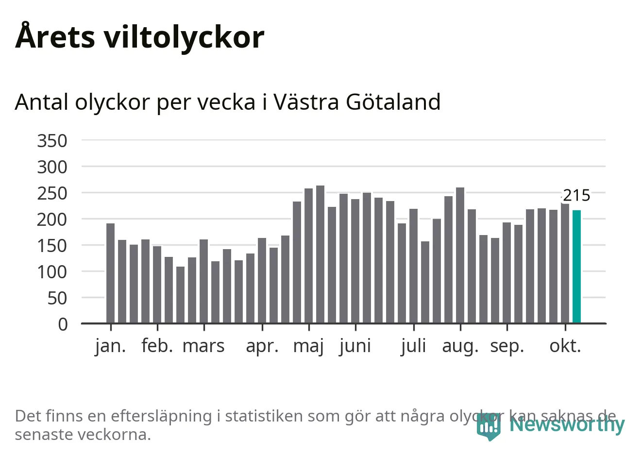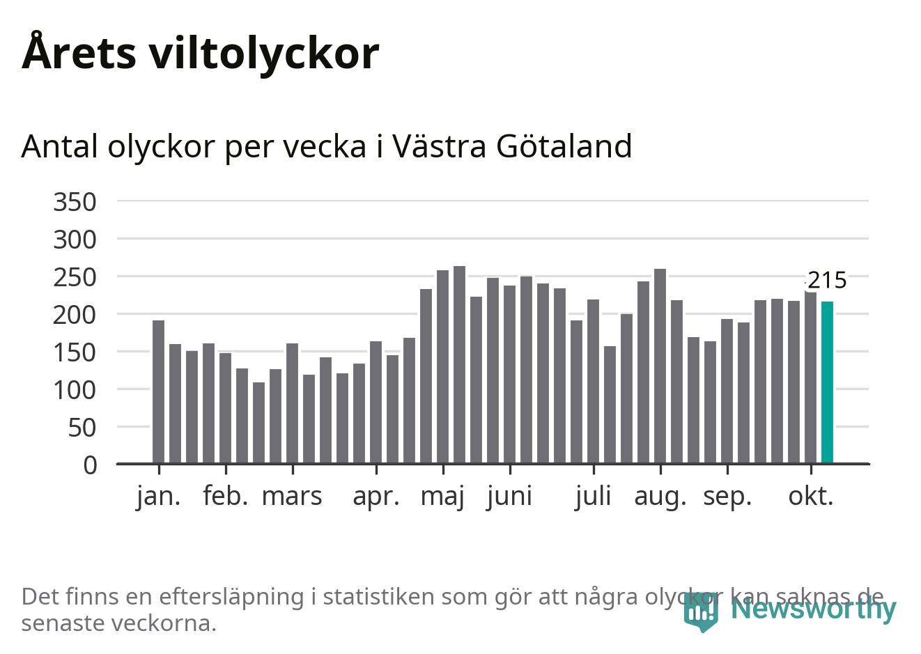 Hittills har 215 viltolyckor rapporterats in i Västra Götalands län från vecka 42. Se listan här.