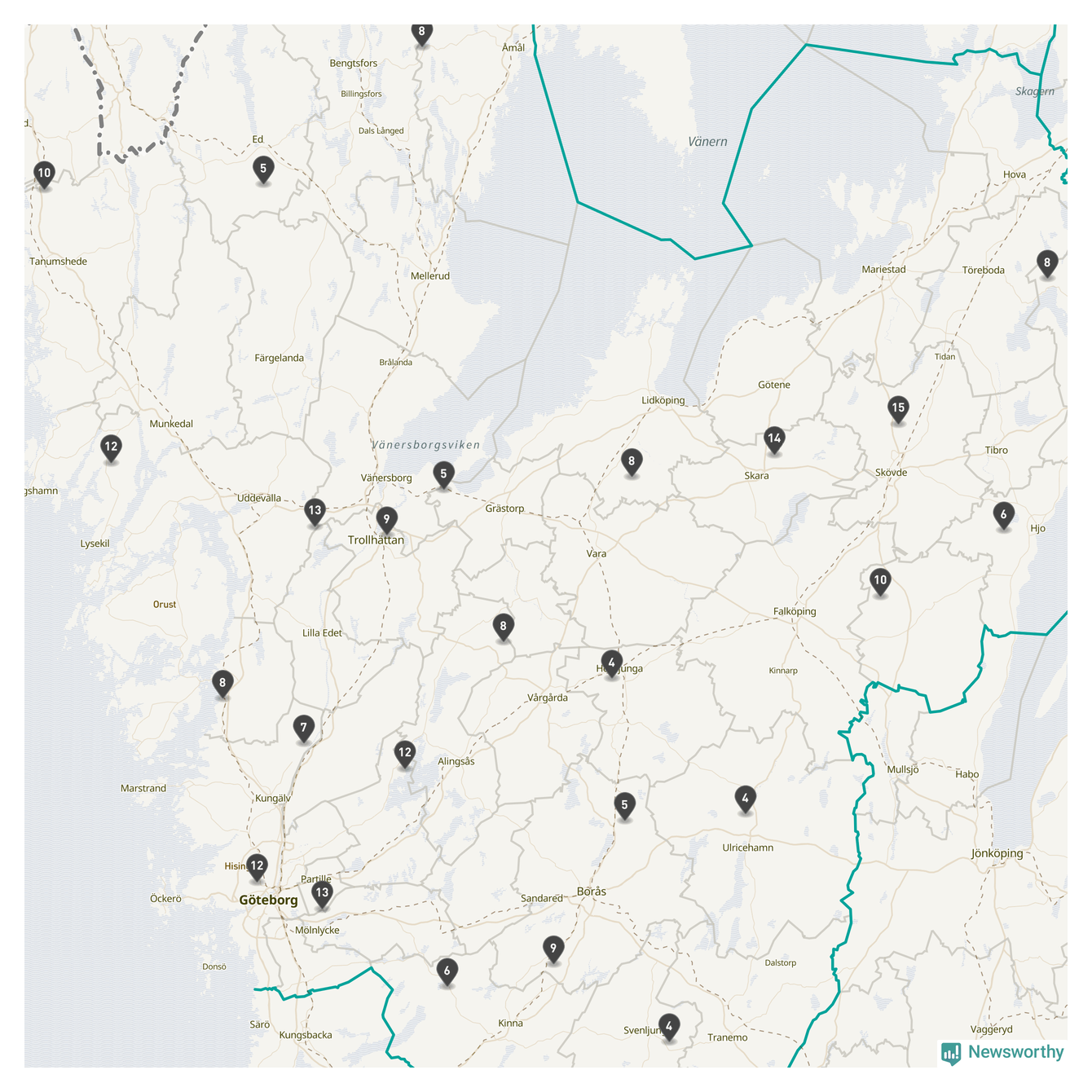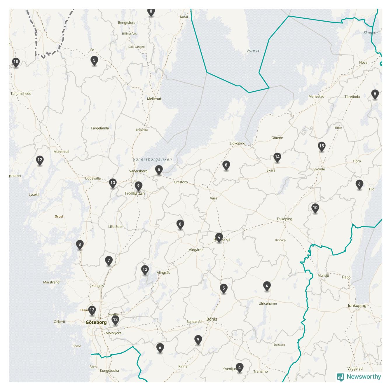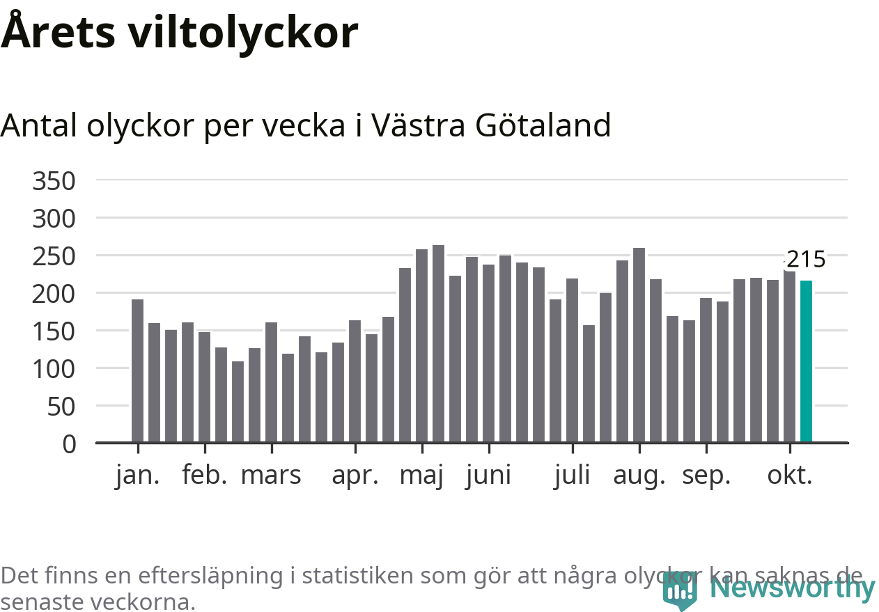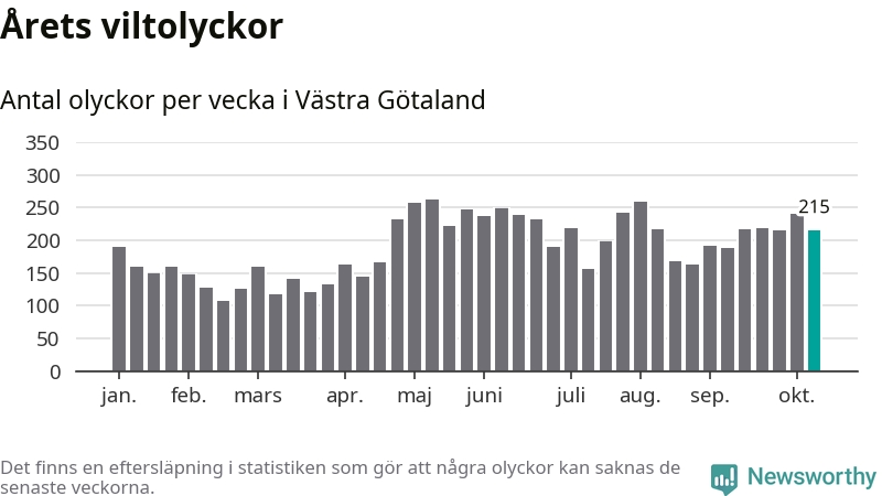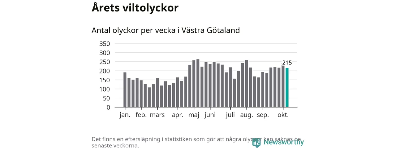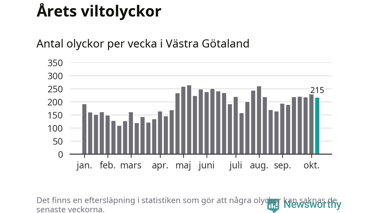 Hittills har 215 viltolyckor rapporterats in i Västra Götalands län från vecka 42. Se listan här.