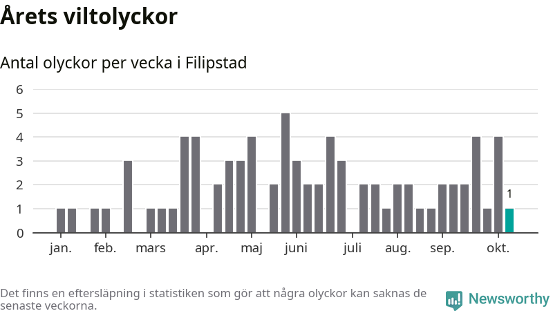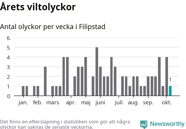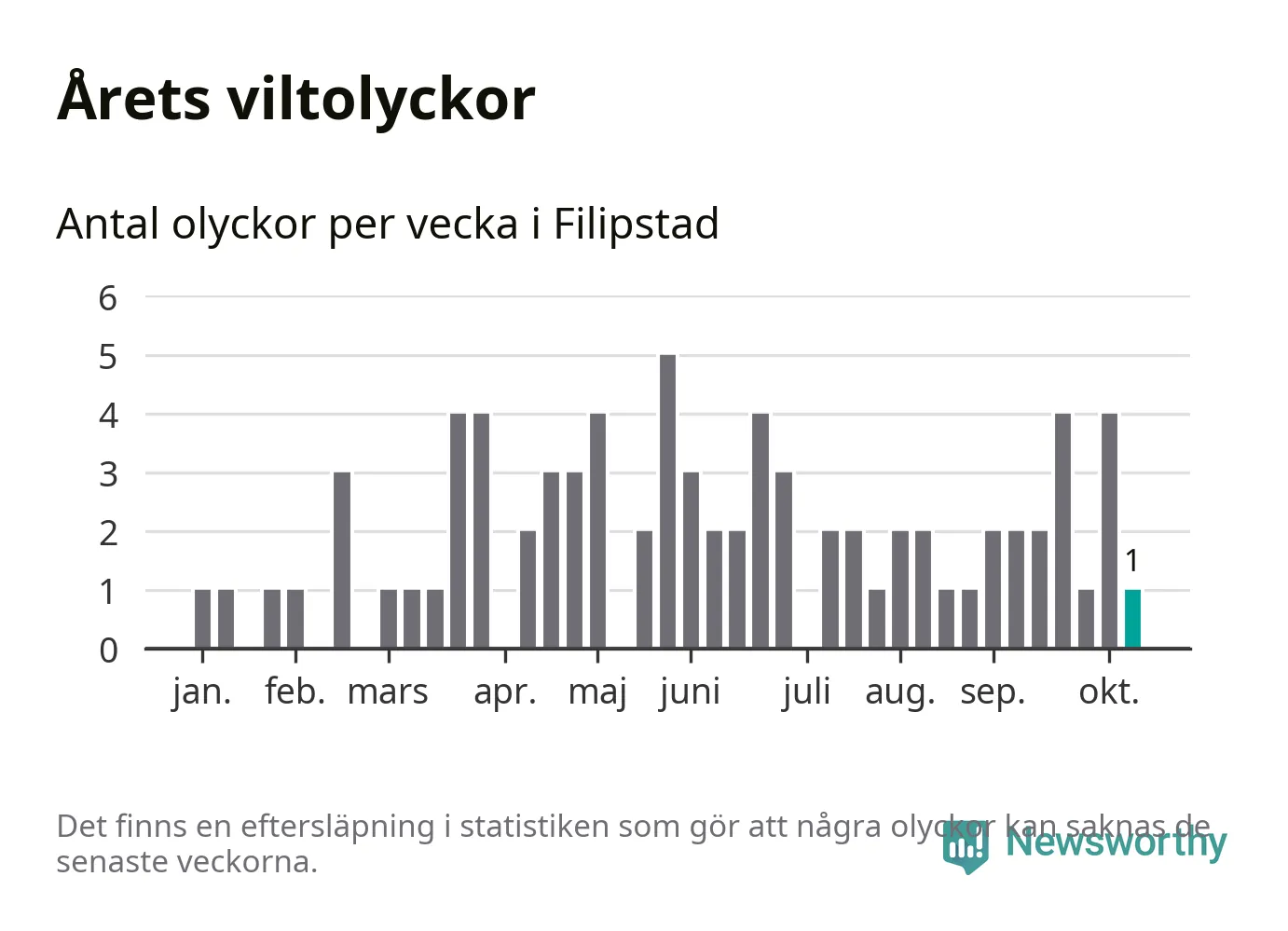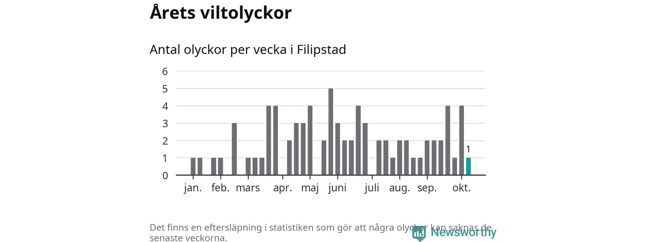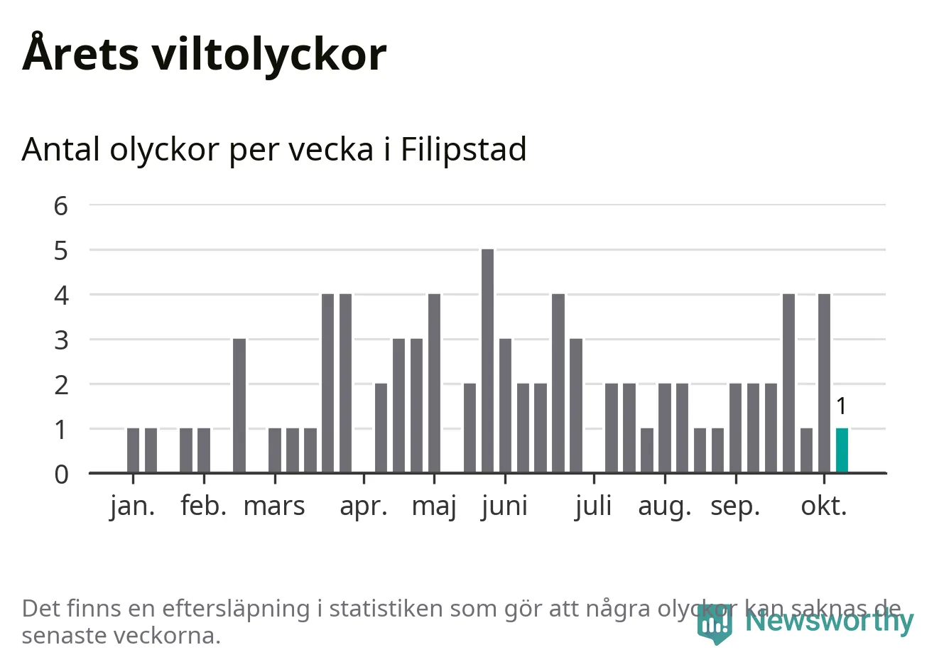 Från förra veckan (vecka 42) har hittills en viltolycka rapporterats in i Filipstads kommun.