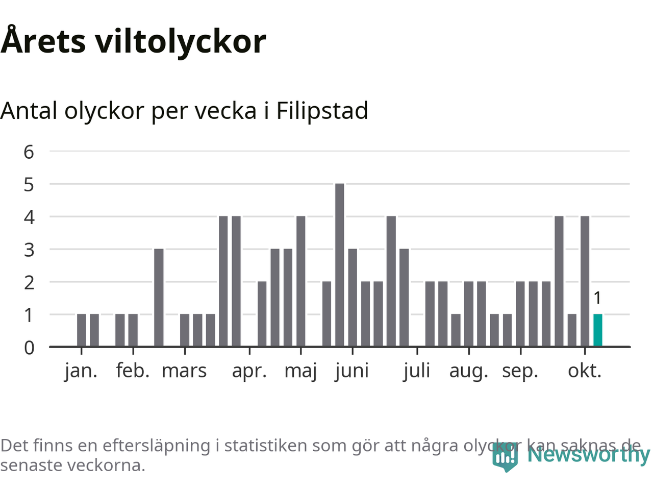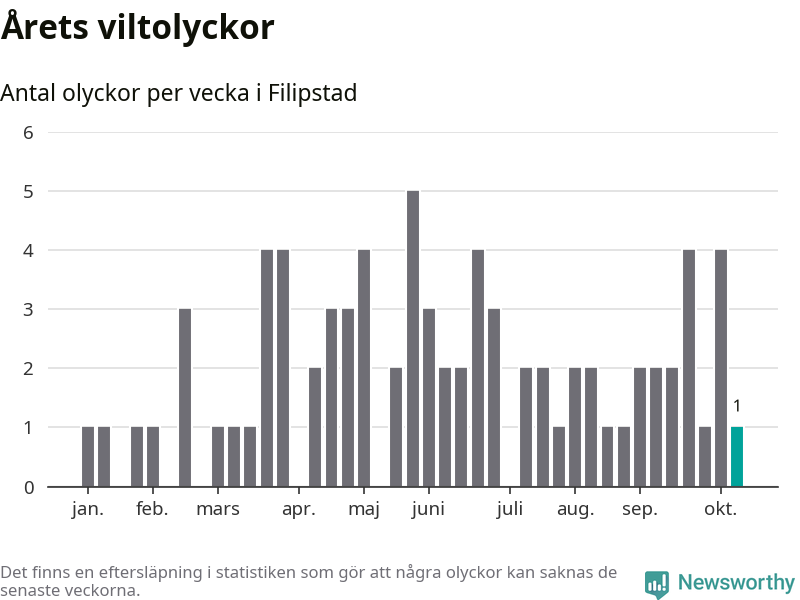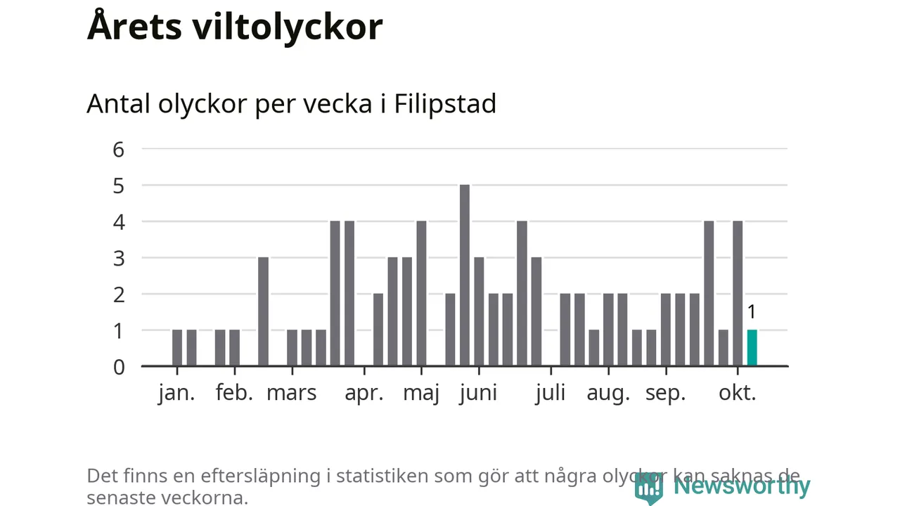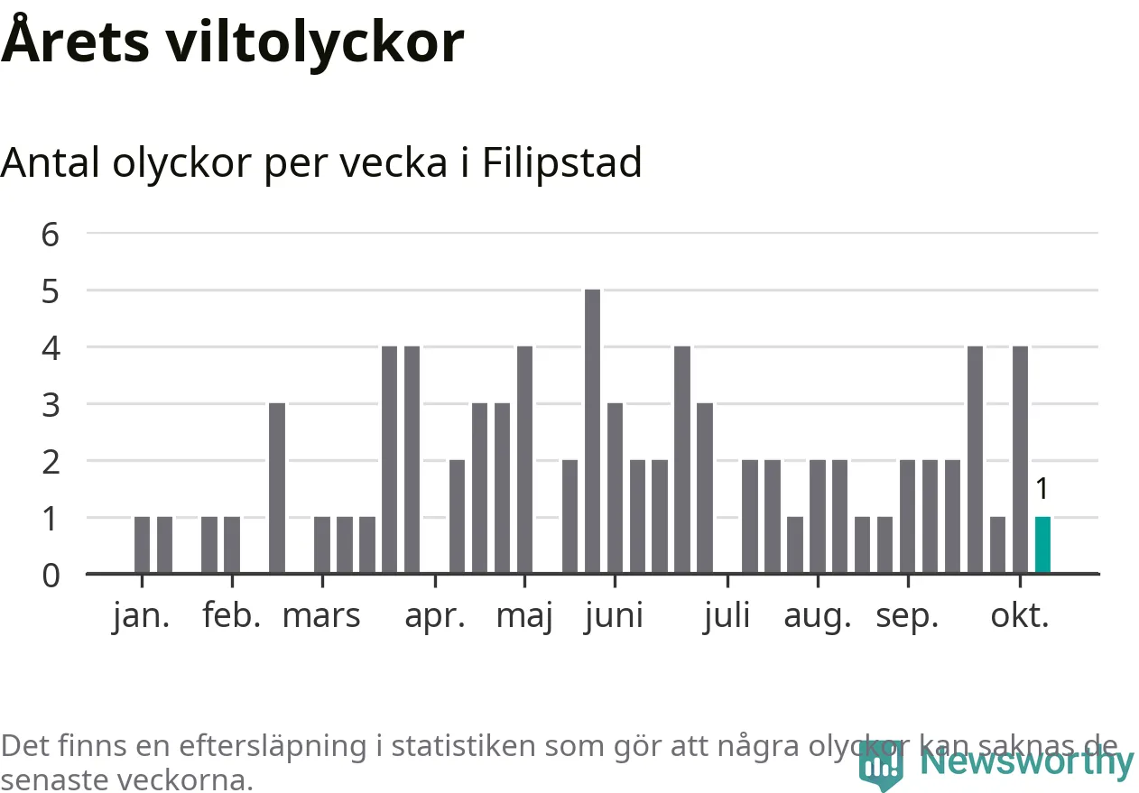 Från förra veckan (vecka 42) har hittills en viltolycka rapporterats in i Filipstads kommun.