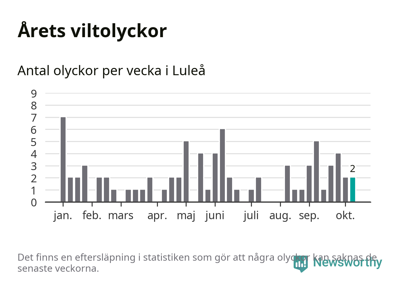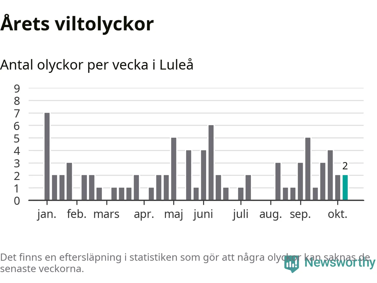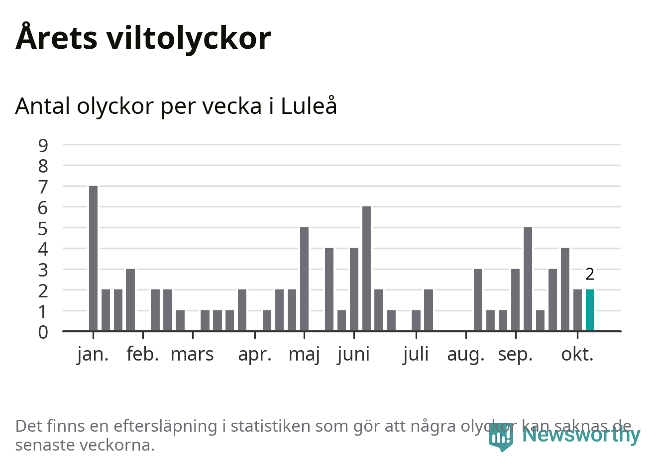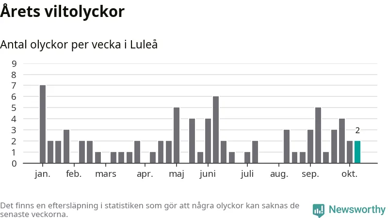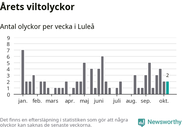 Hittills har två viltolyckor rapporterats in i Luleå kommun från vecka 42. Se listan här.