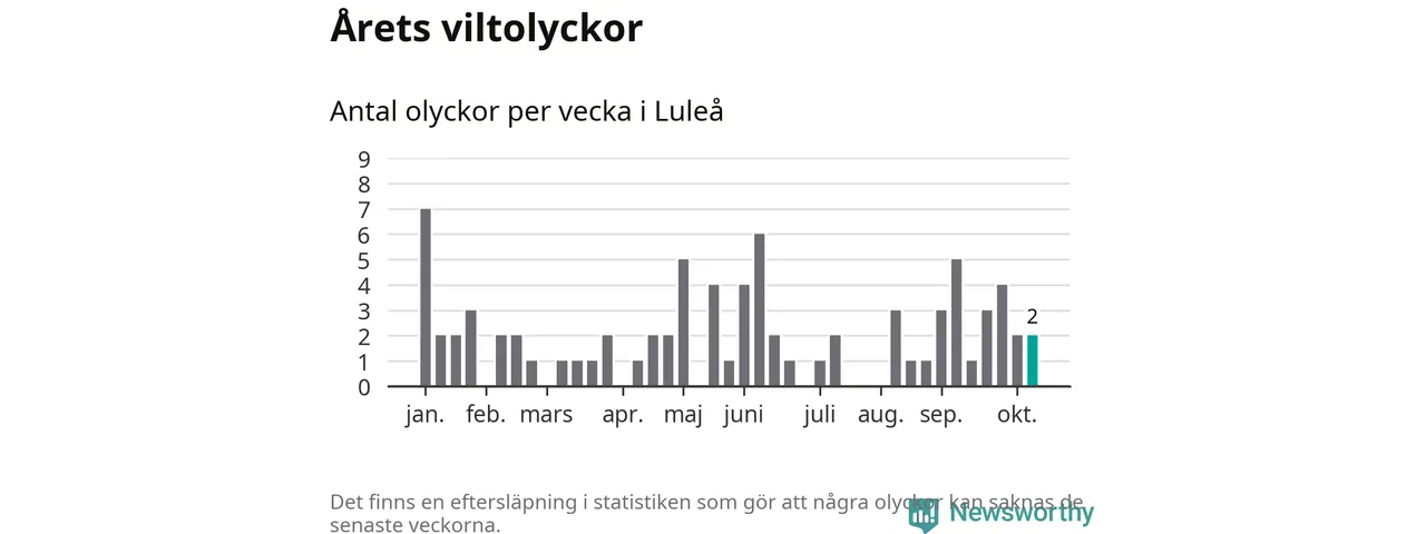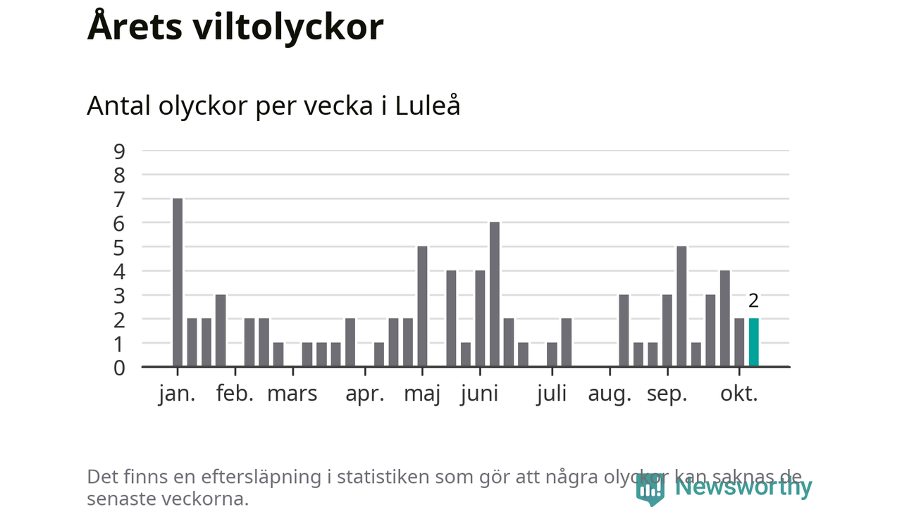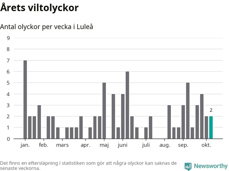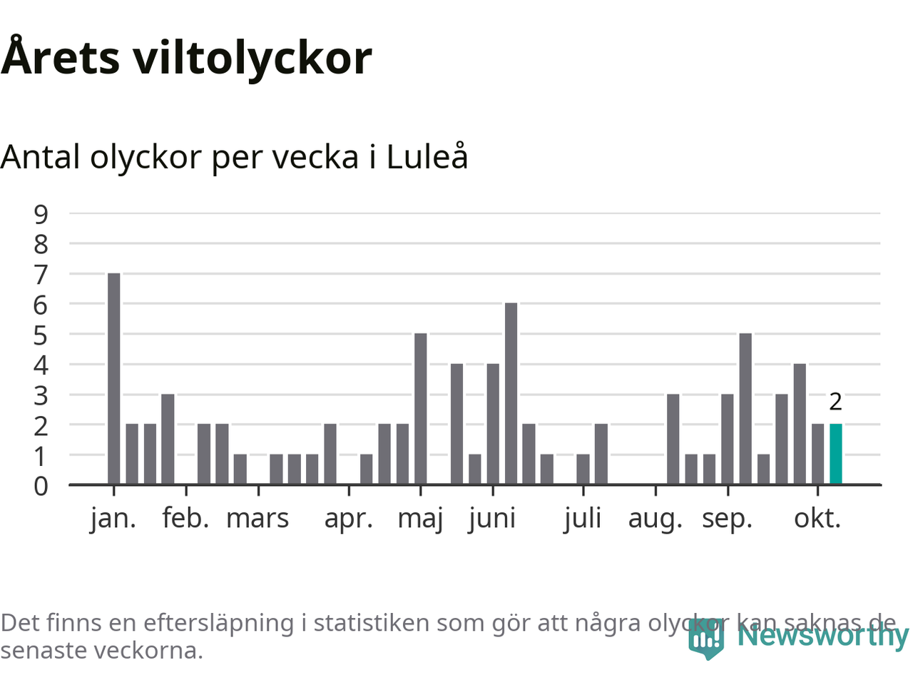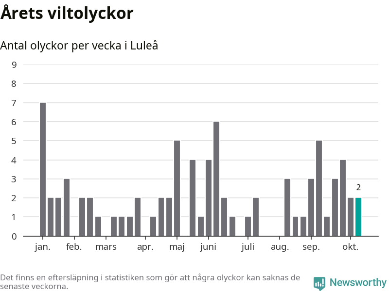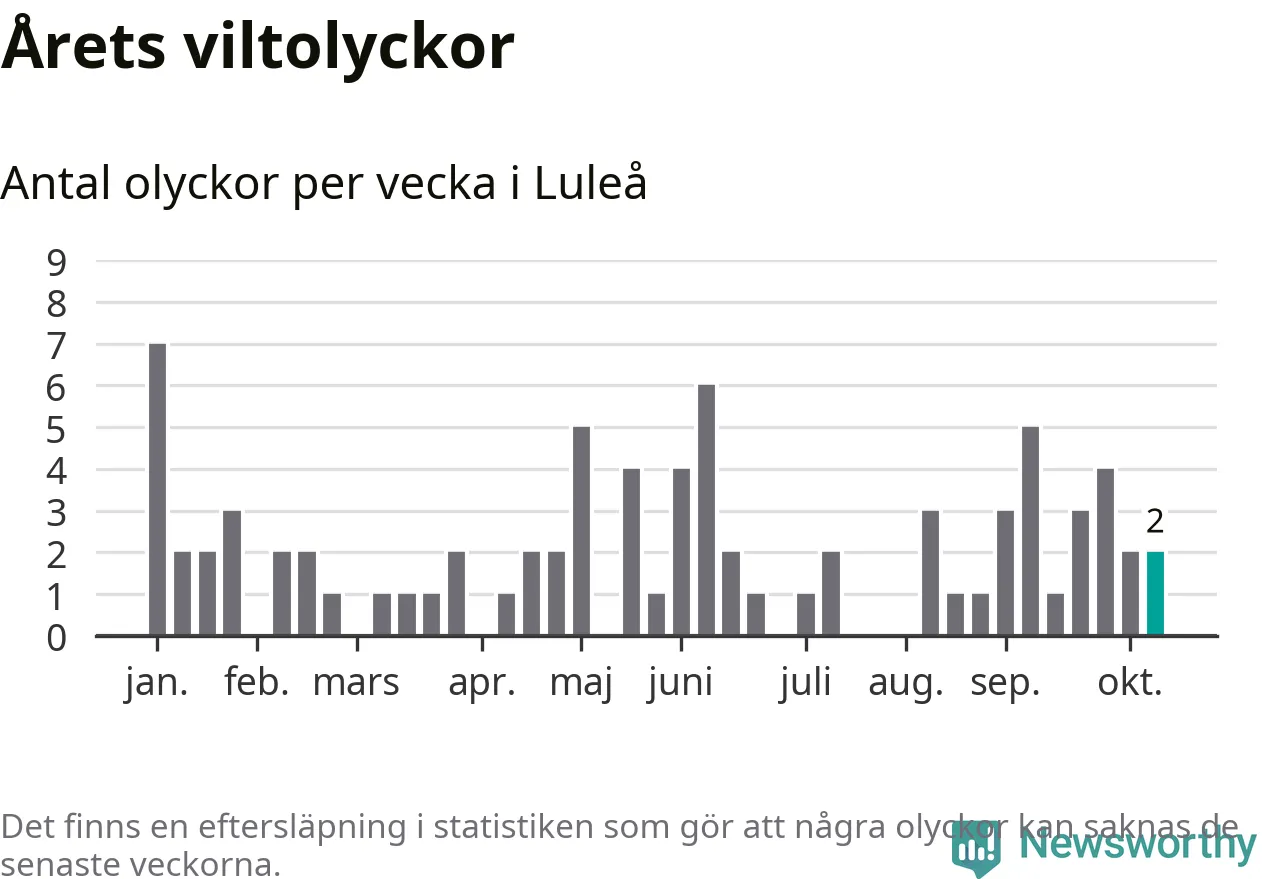 Hittills har två viltolyckor rapporterats in i Luleå kommun från vecka 42. Se listan här.