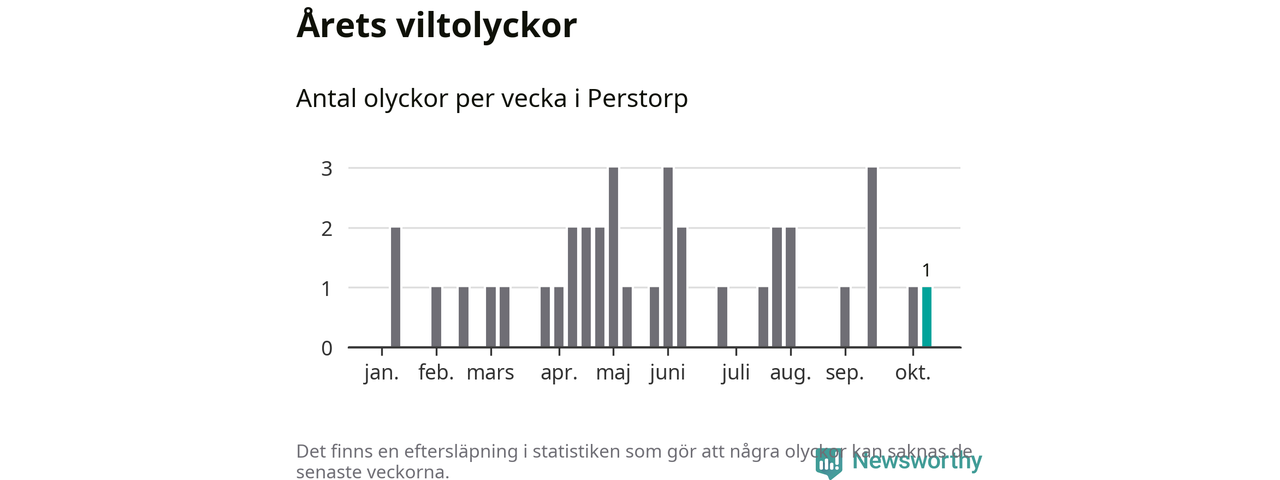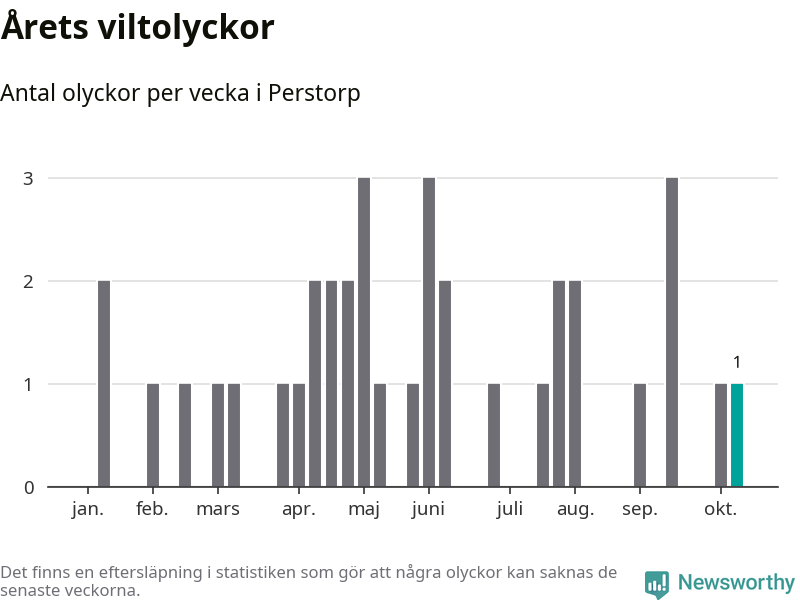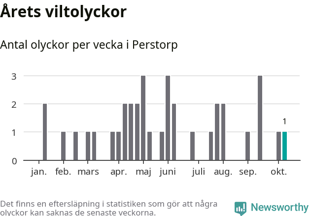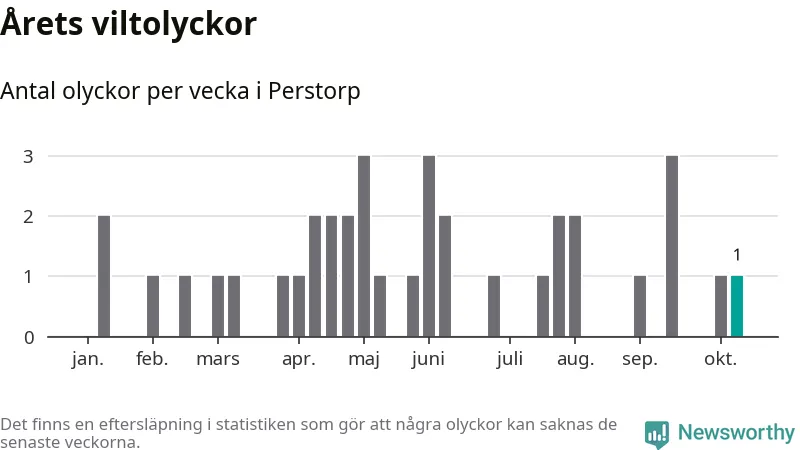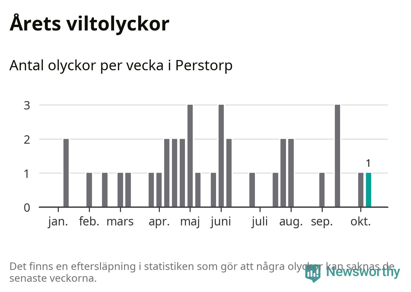 Från förra veckan (vecka 42) har hittills en viltolycka rapporterats in i Perstorps kommun.