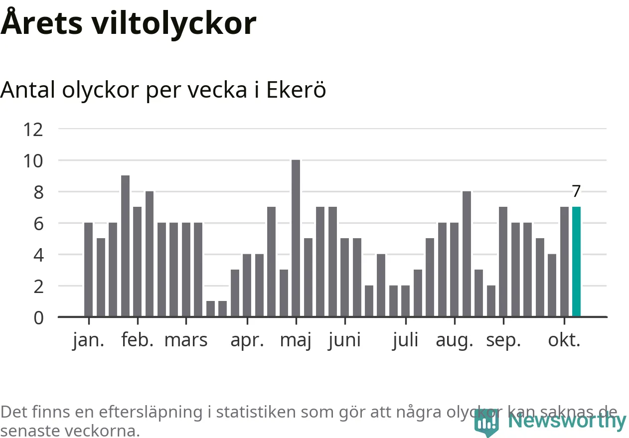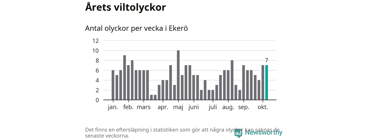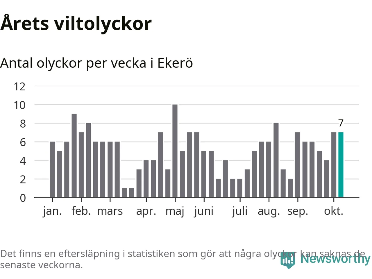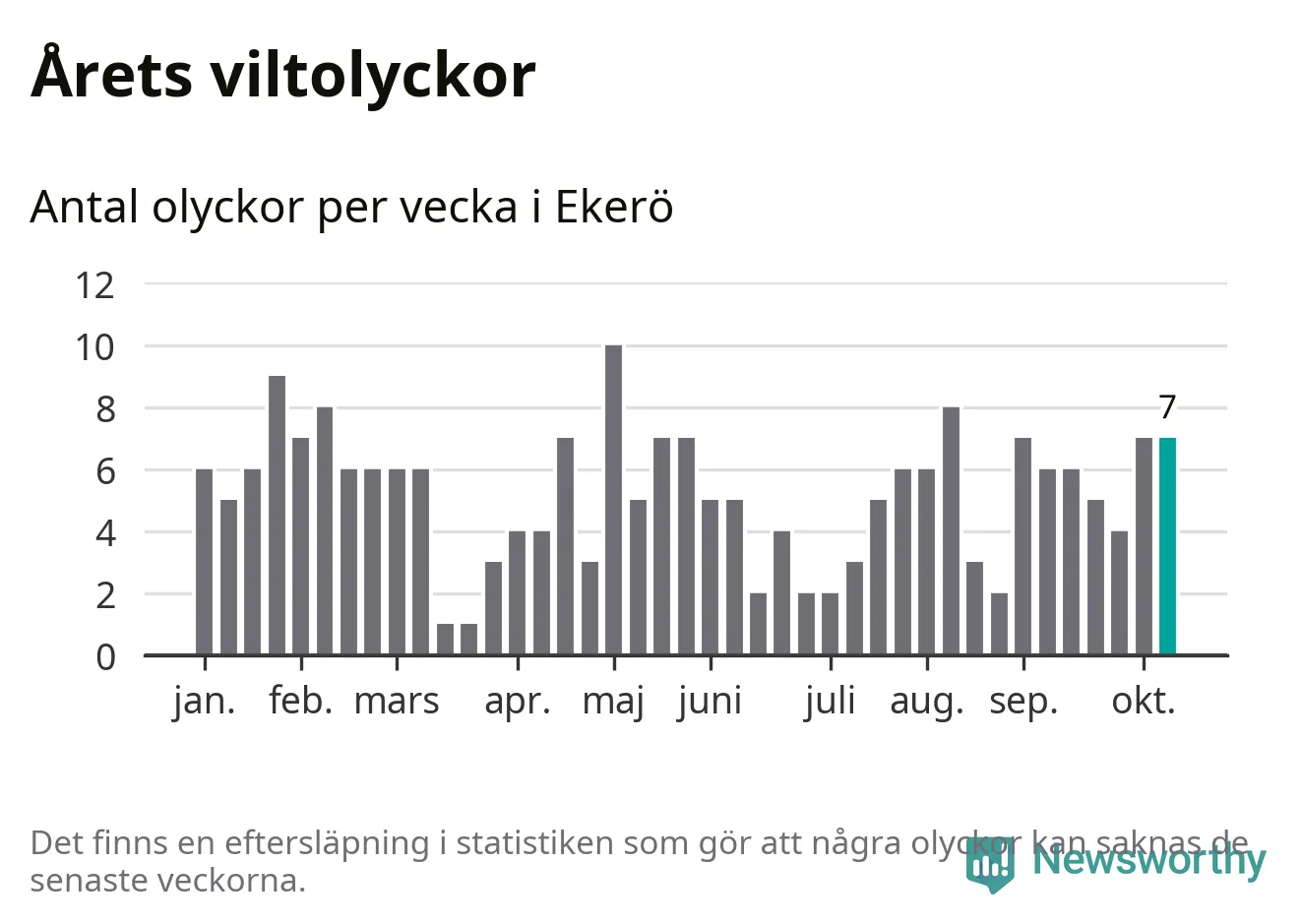 Hittills har sju viltolyckor rapporterats in i Ekerö kommun från vecka 42. Se listan här.
