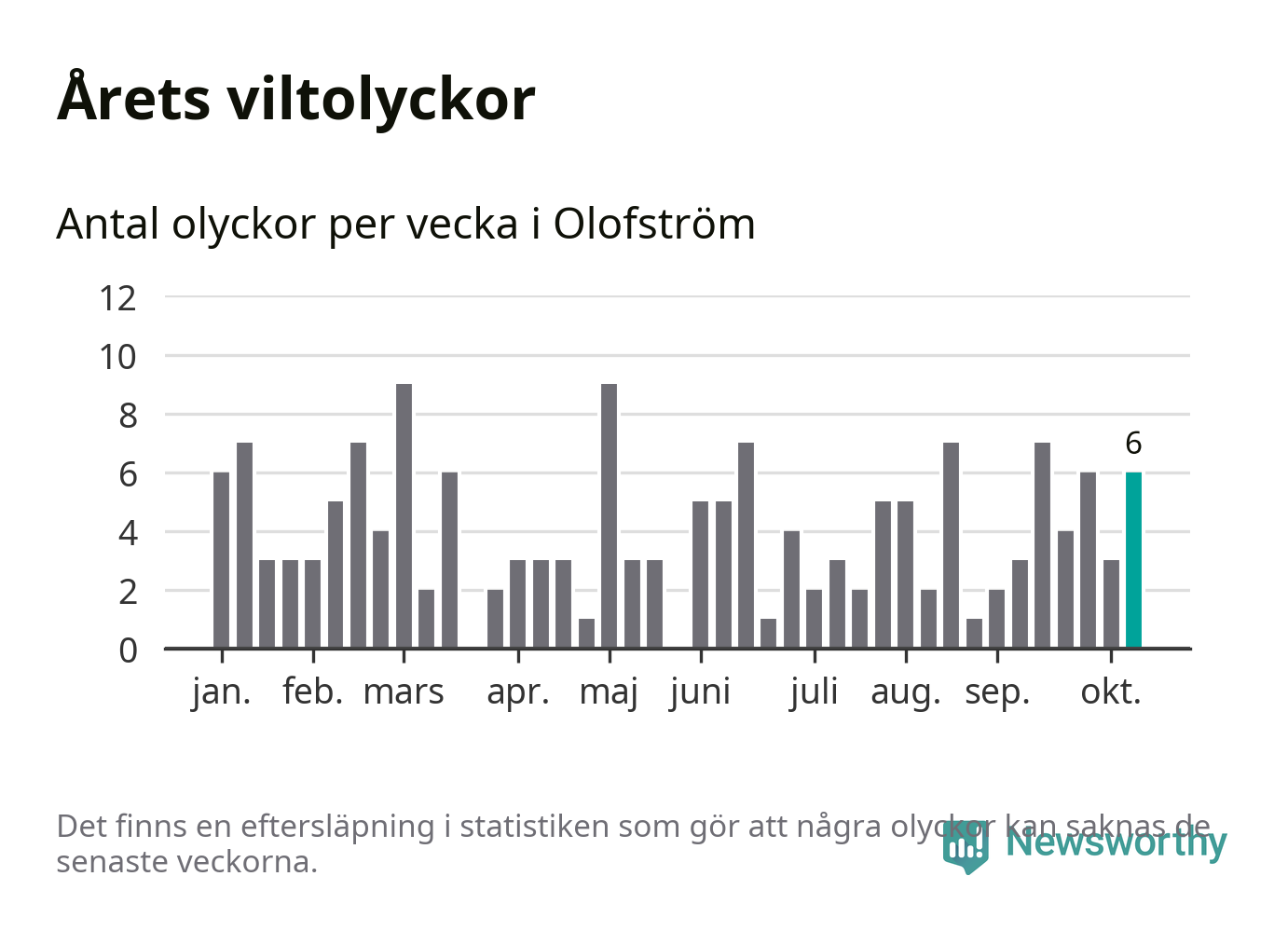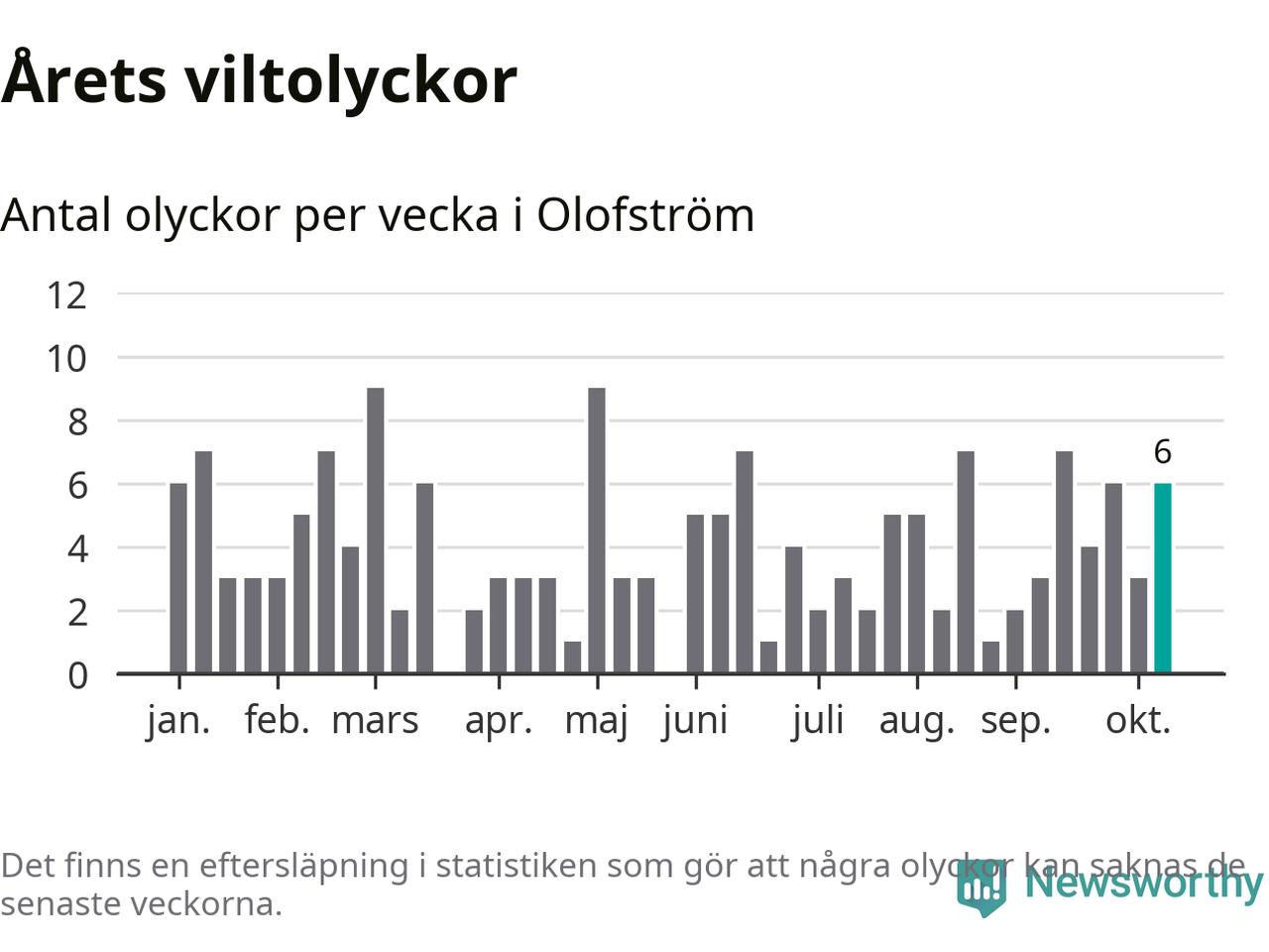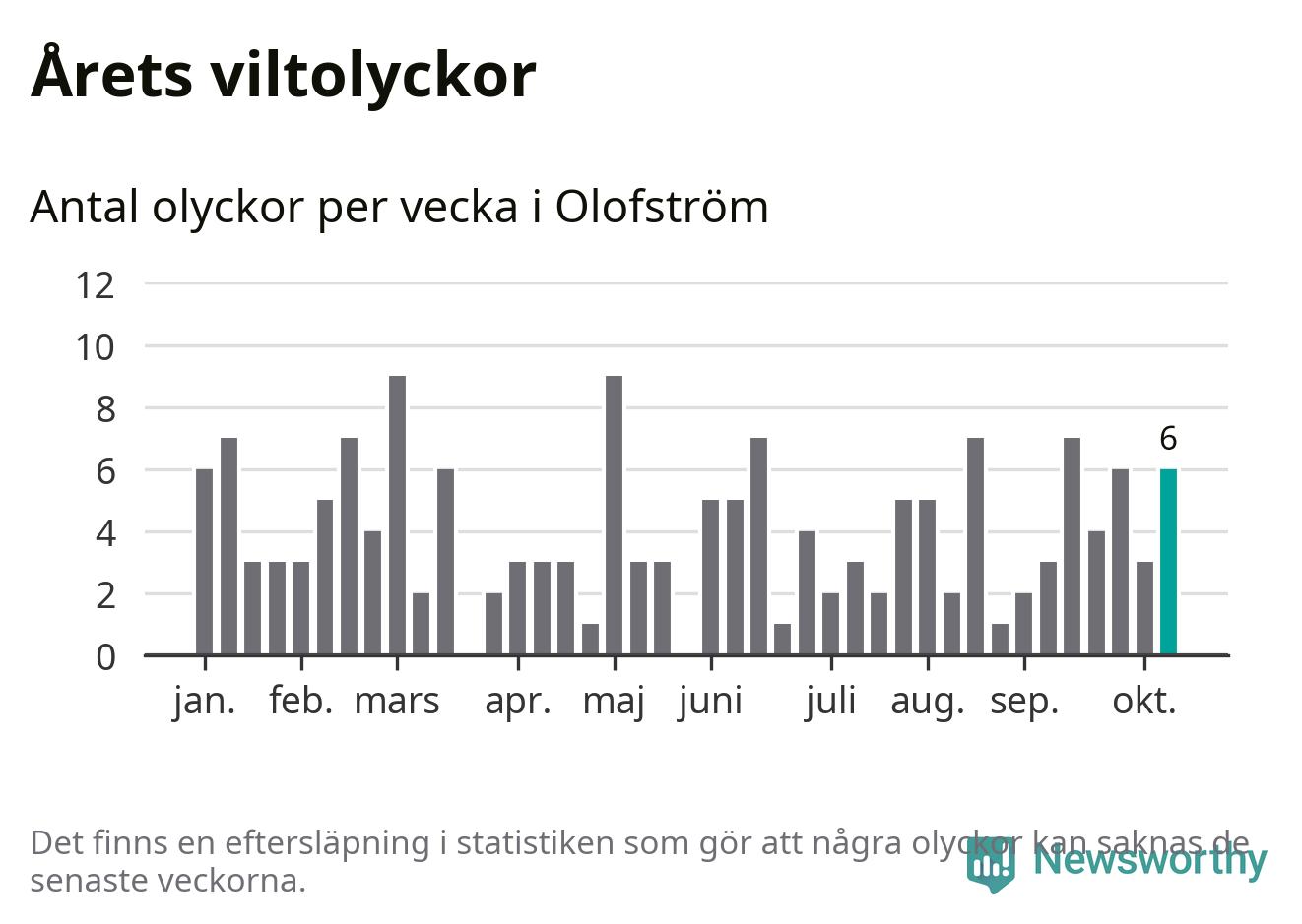 Hittills har sex viltolyckor rapporterats in i Olofströms kommun från vecka 42. Se listan här.