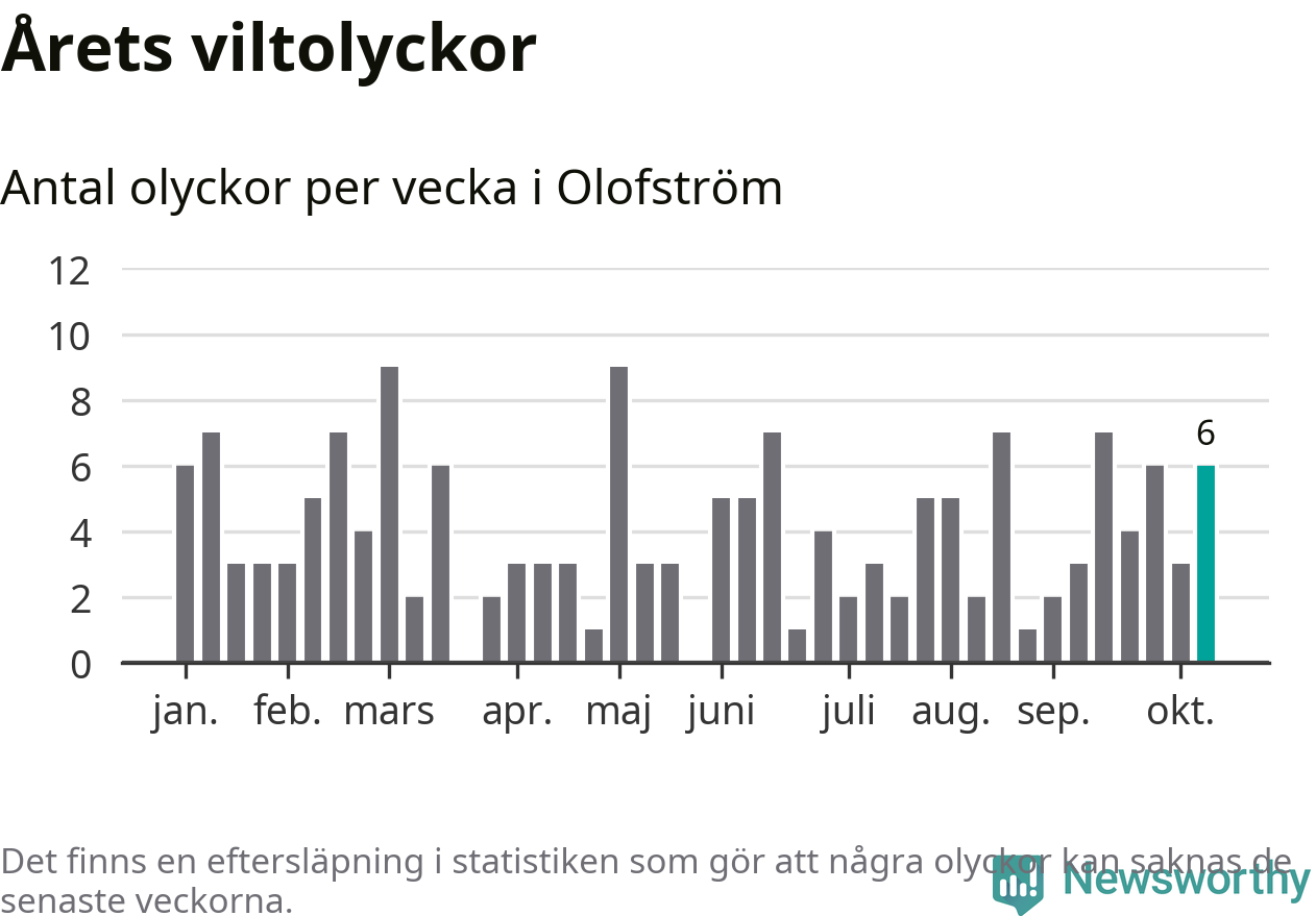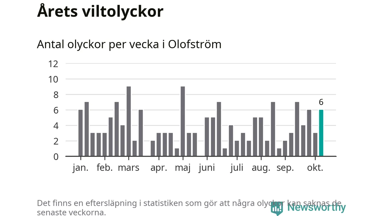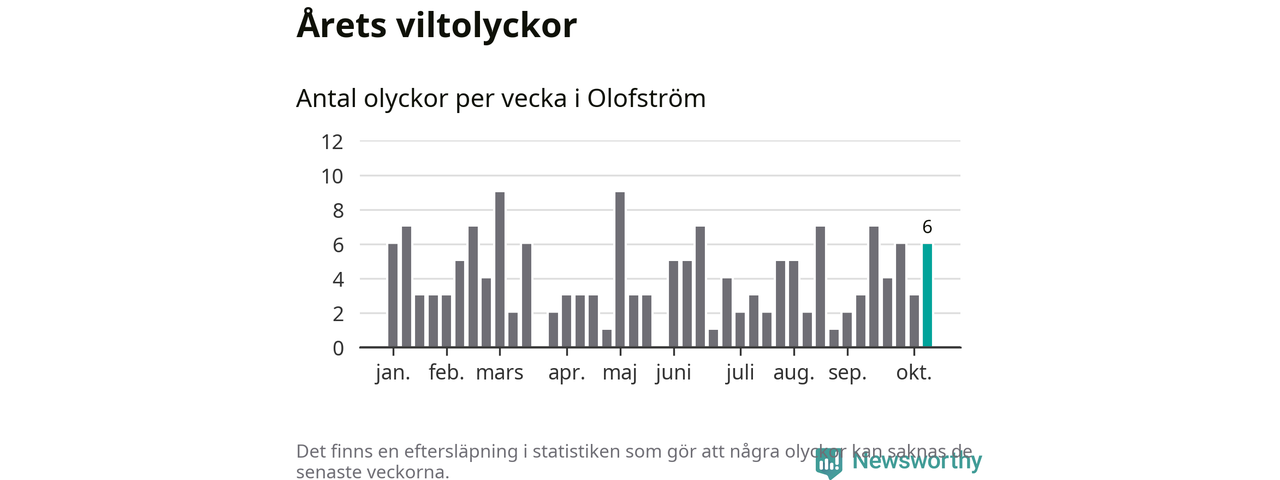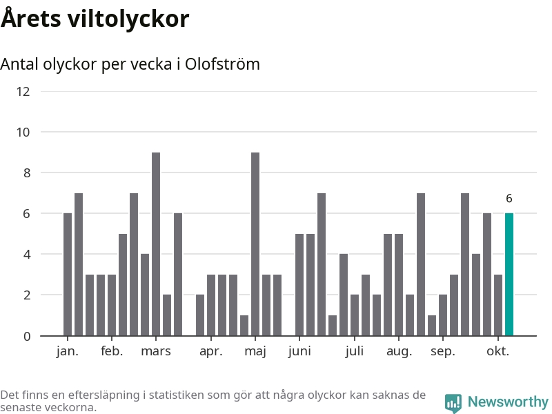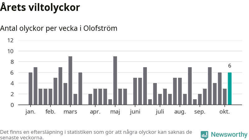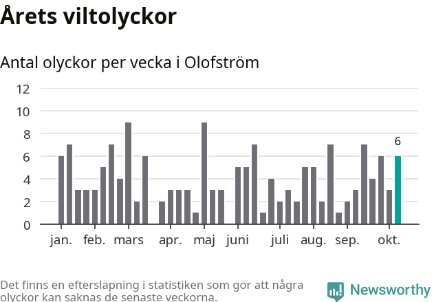 Hittills har sex viltolyckor rapporterats in i Olofströms kommun från vecka 42. Se listan här.