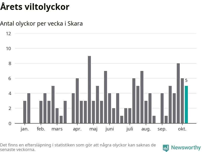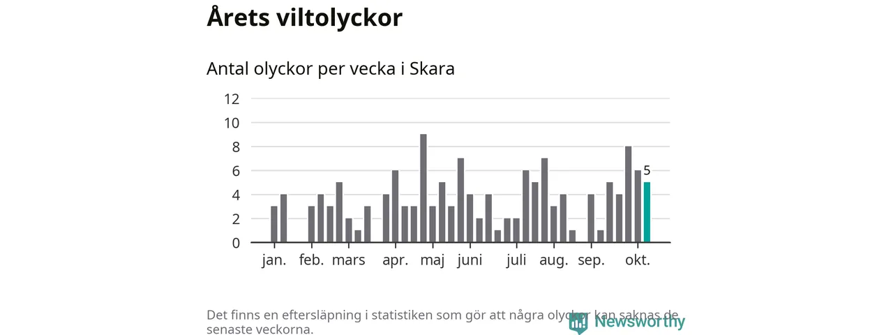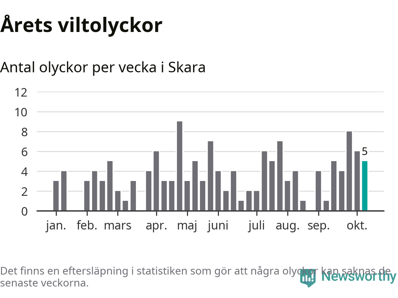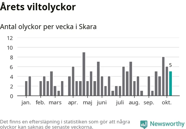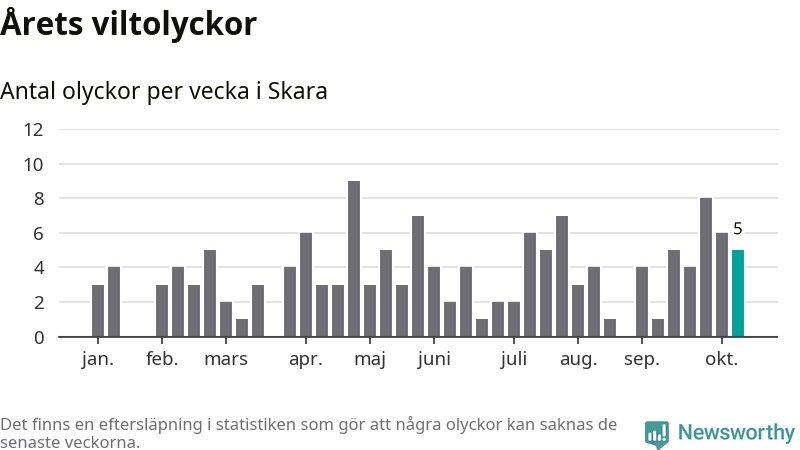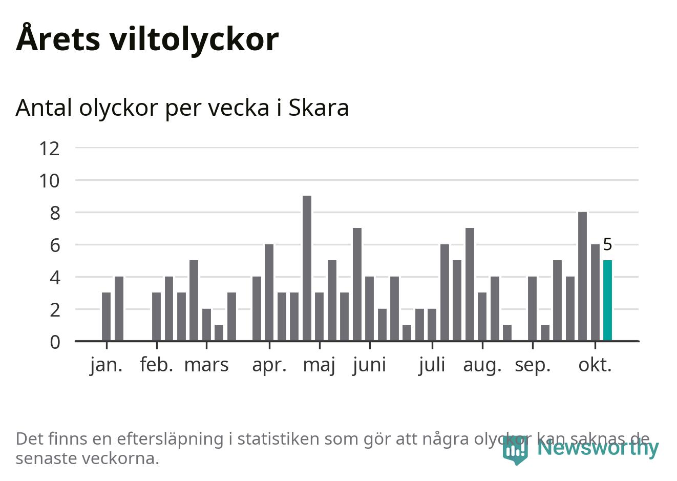 Hittills har fem viltolyckor rapporterats in i Skara kommun från vecka 42. Se listan här.