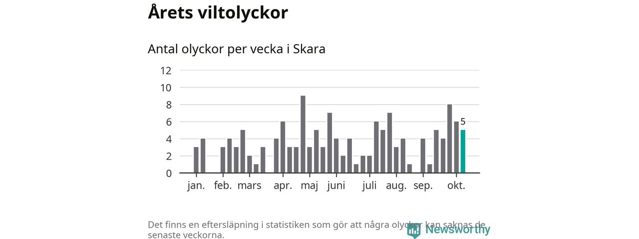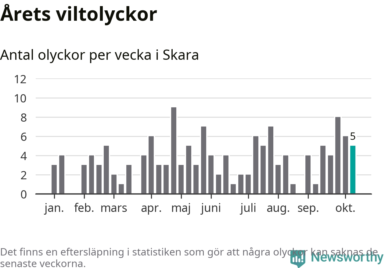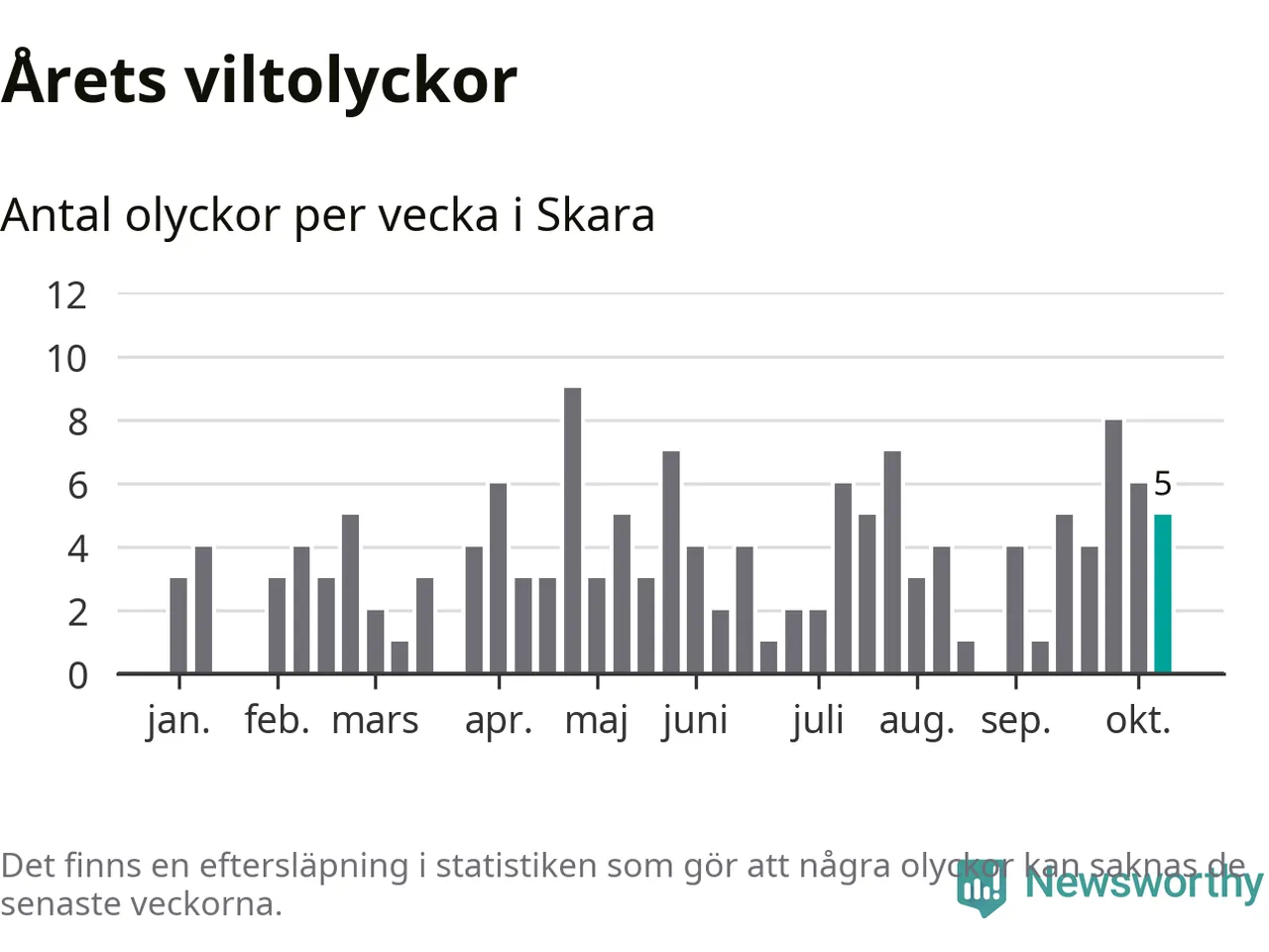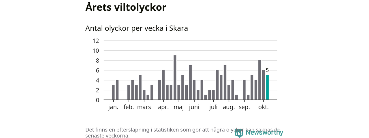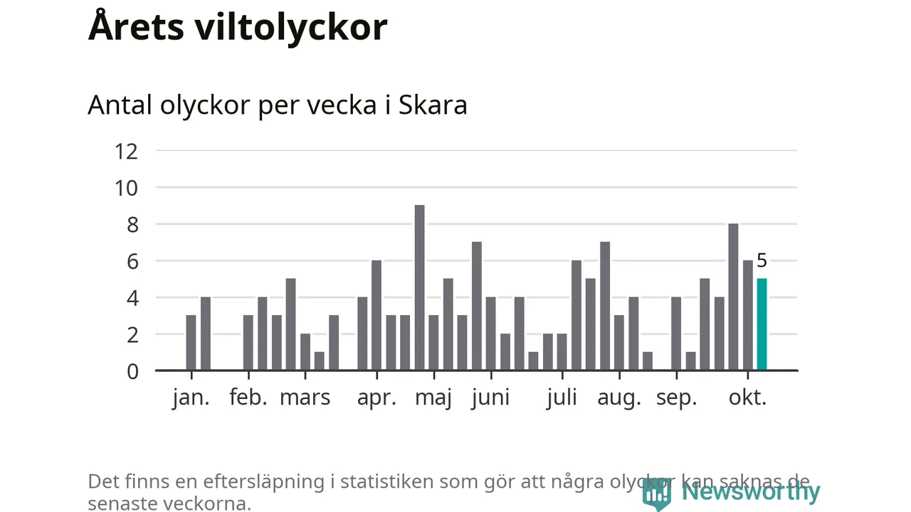 Hittills har fem viltolyckor rapporterats in i Skara kommun från vecka 42. Se listan här.