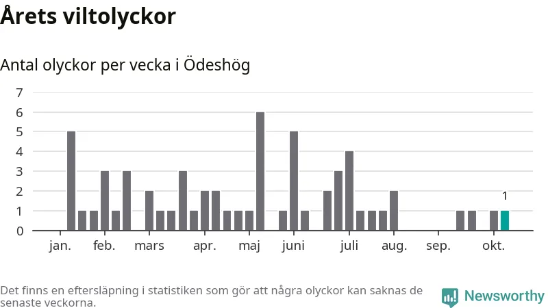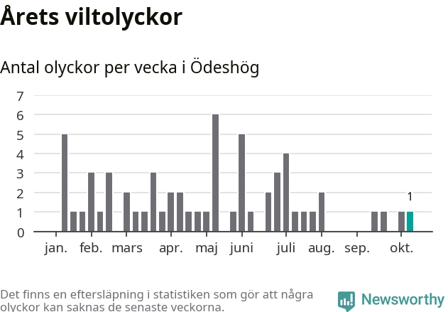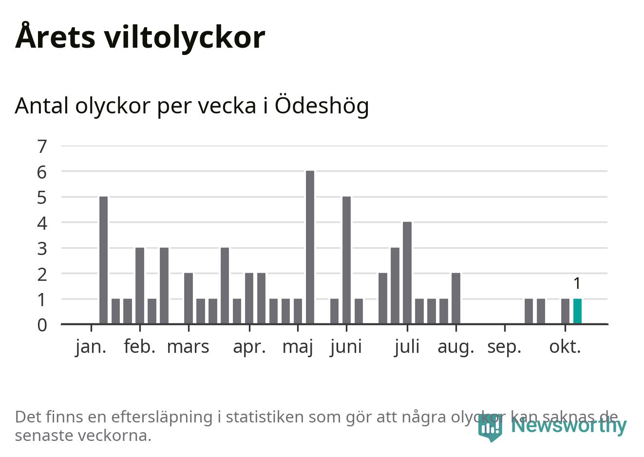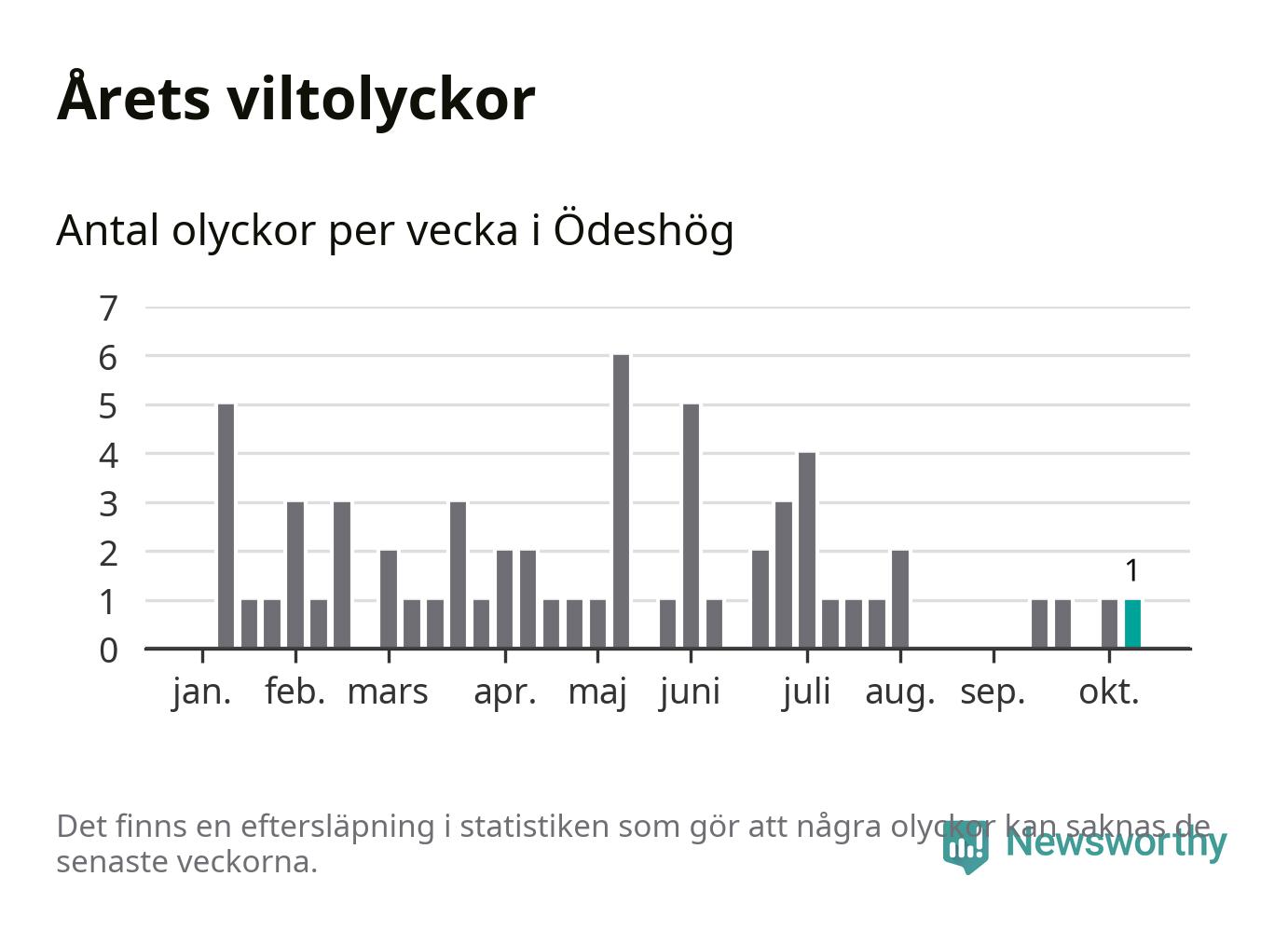 Från förra veckan (vecka 42) har hittills en viltolycka rapporterats in i Ödeshögs kommun.