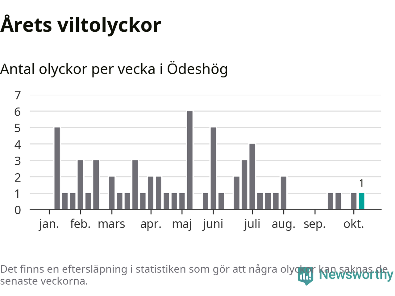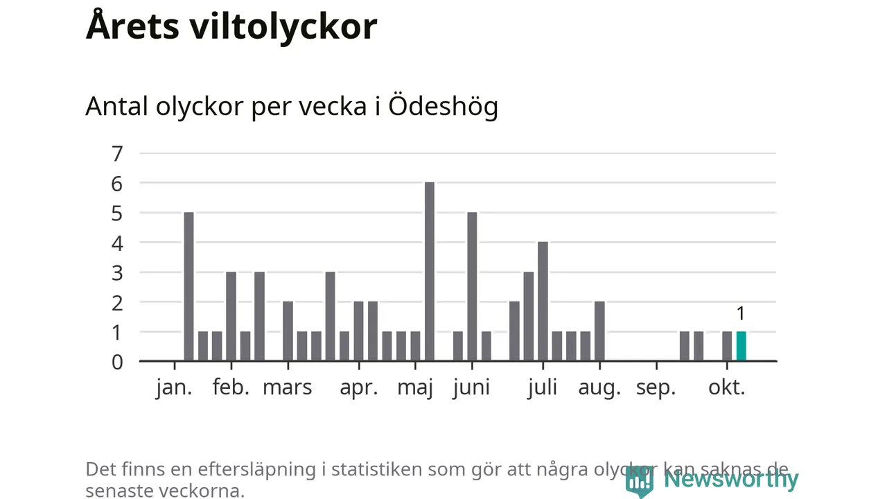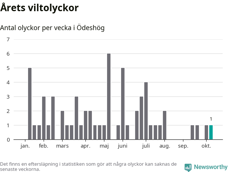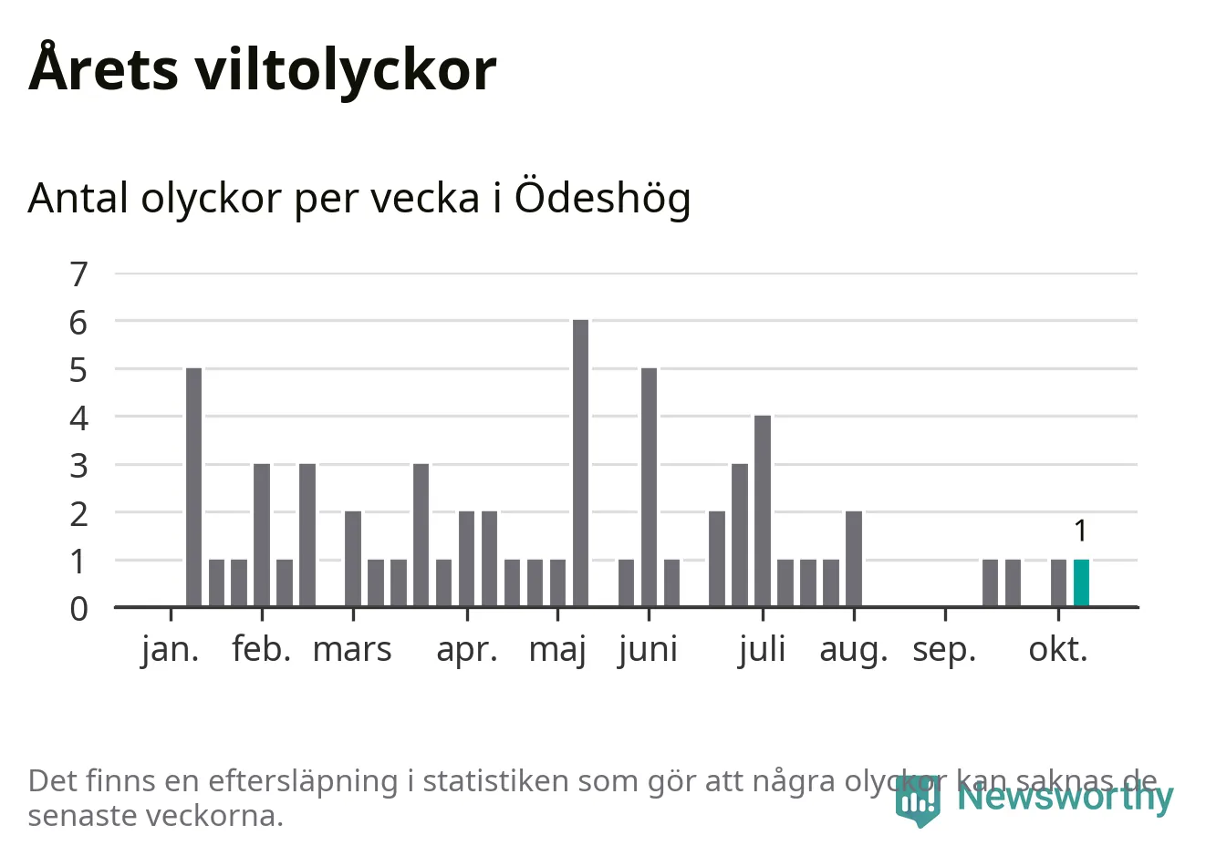 Från förra veckan (vecka 42) har hittills en viltolycka rapporterats in i Ödeshögs kommun.