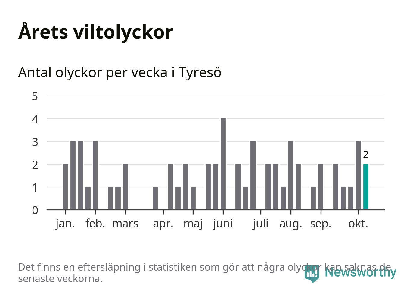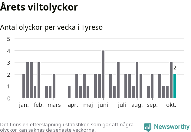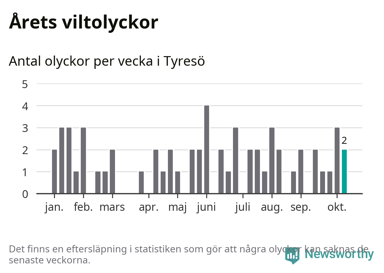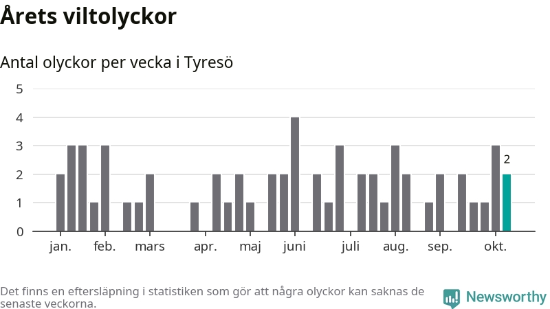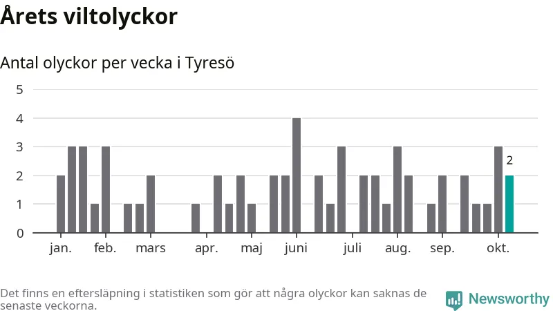 Hittills har två viltolyckor rapporterats in i Tyresö kommun från vecka 42. Se listan här.