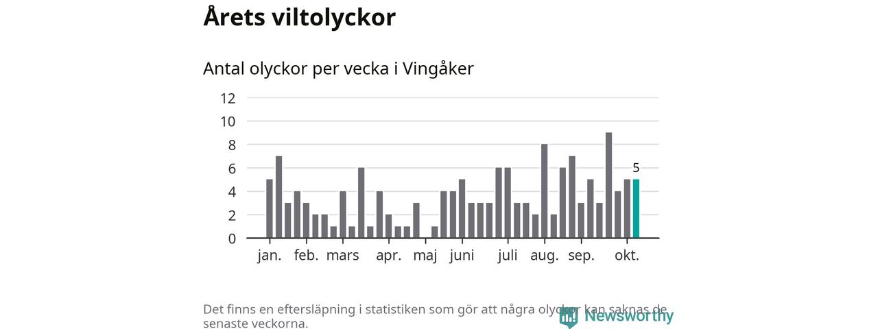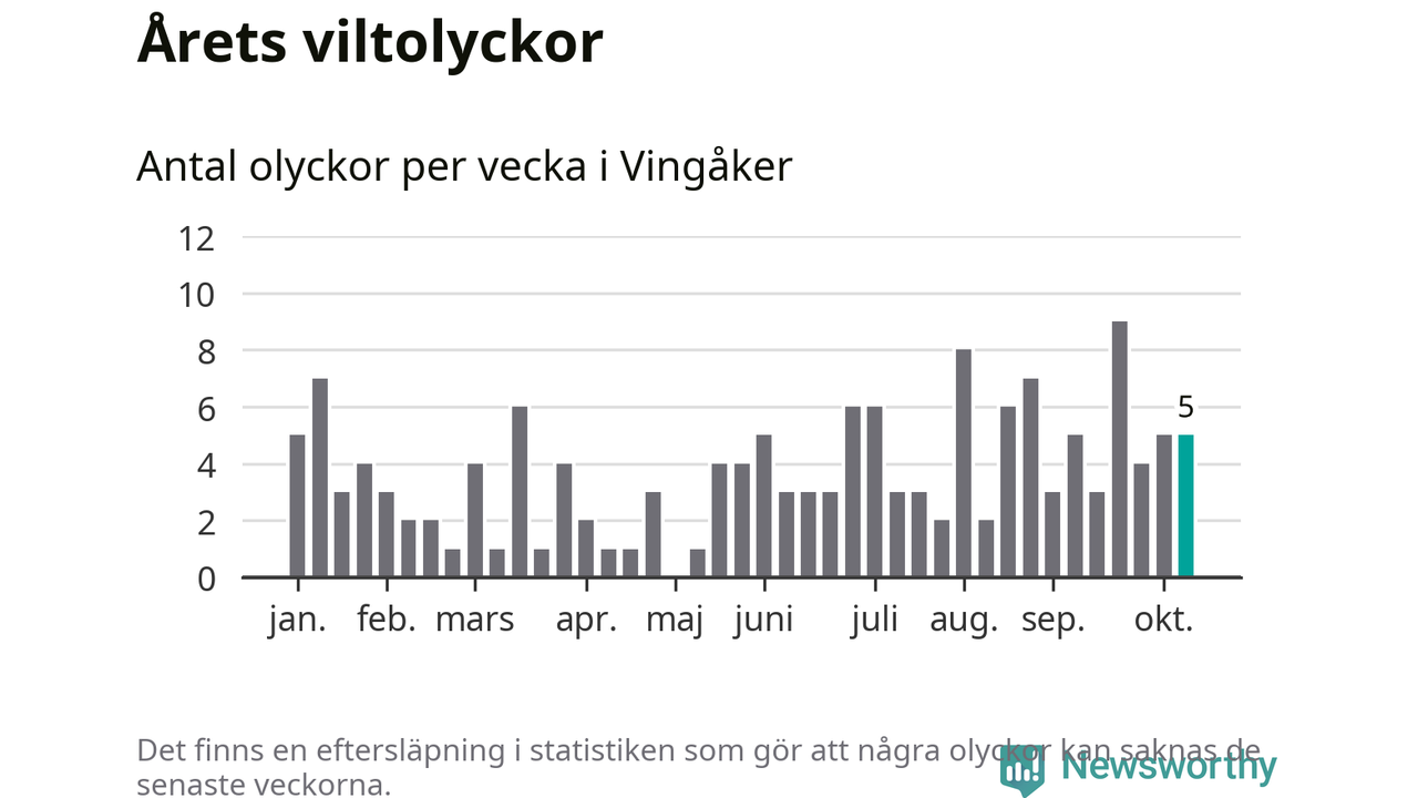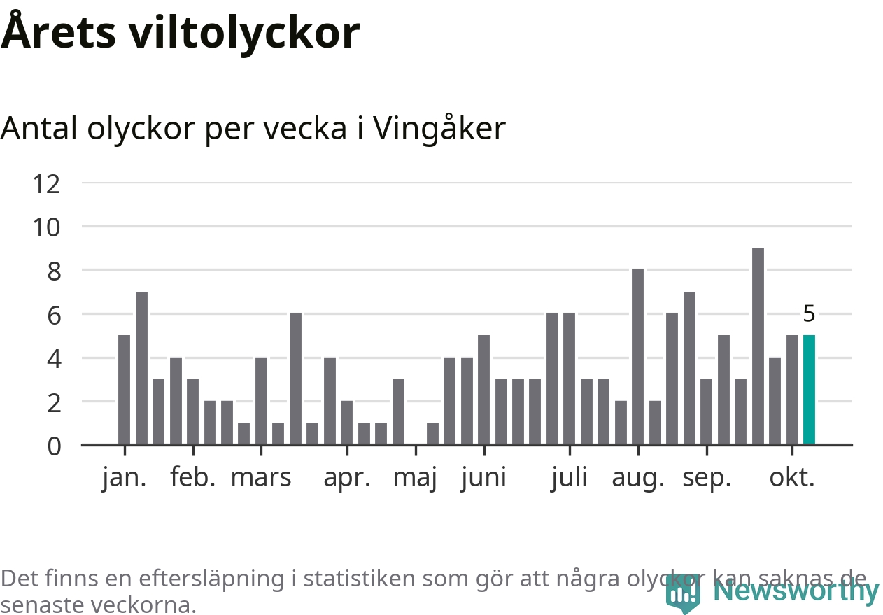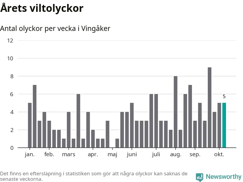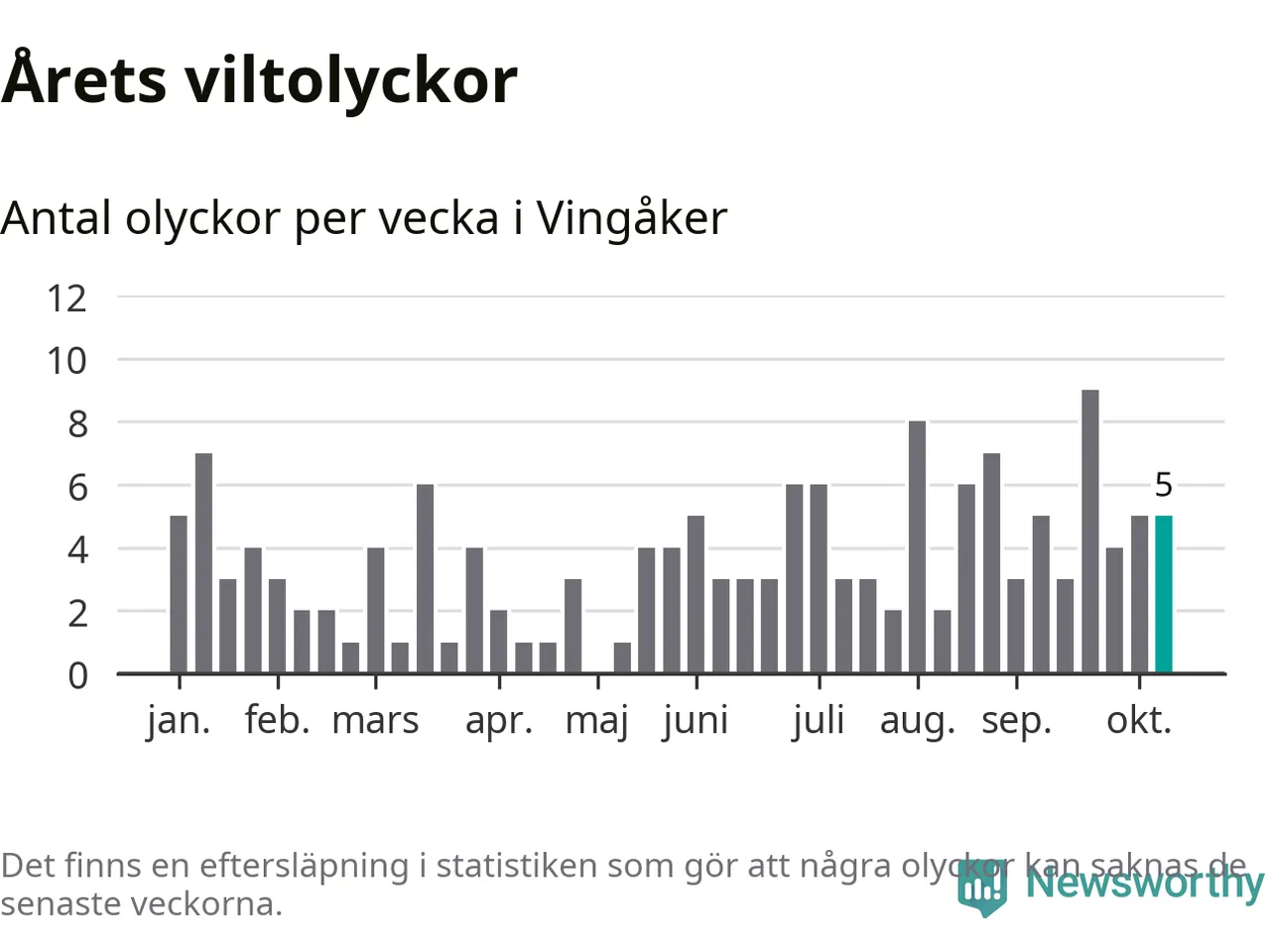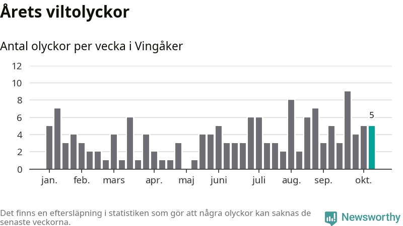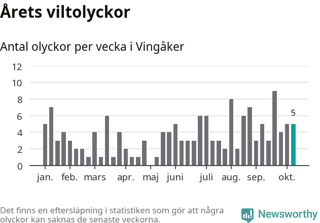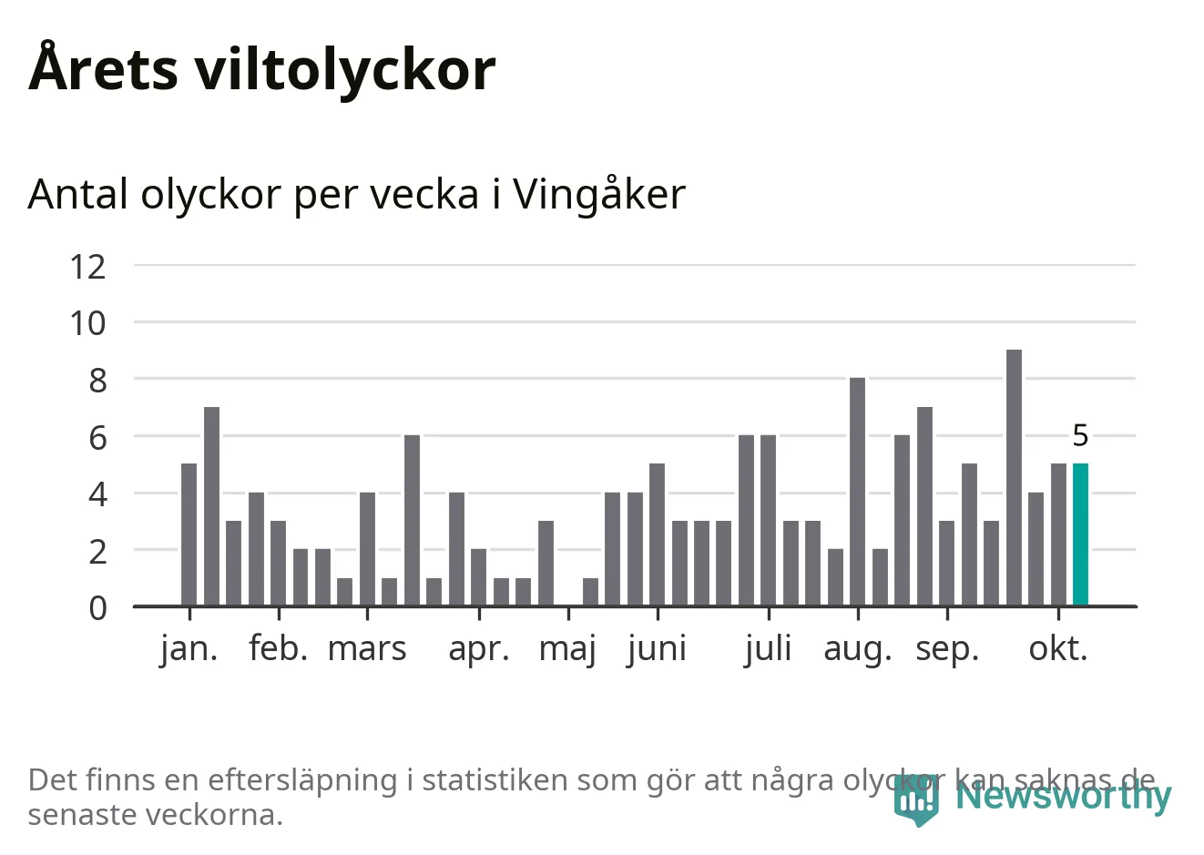 Hittills har fem viltolyckor rapporterats in i Vingåkers kommun från vecka 42. Se listan här.