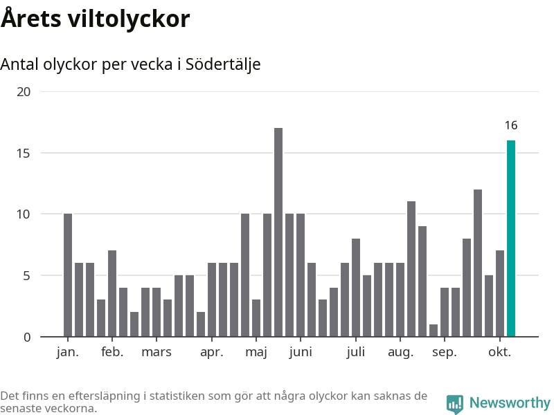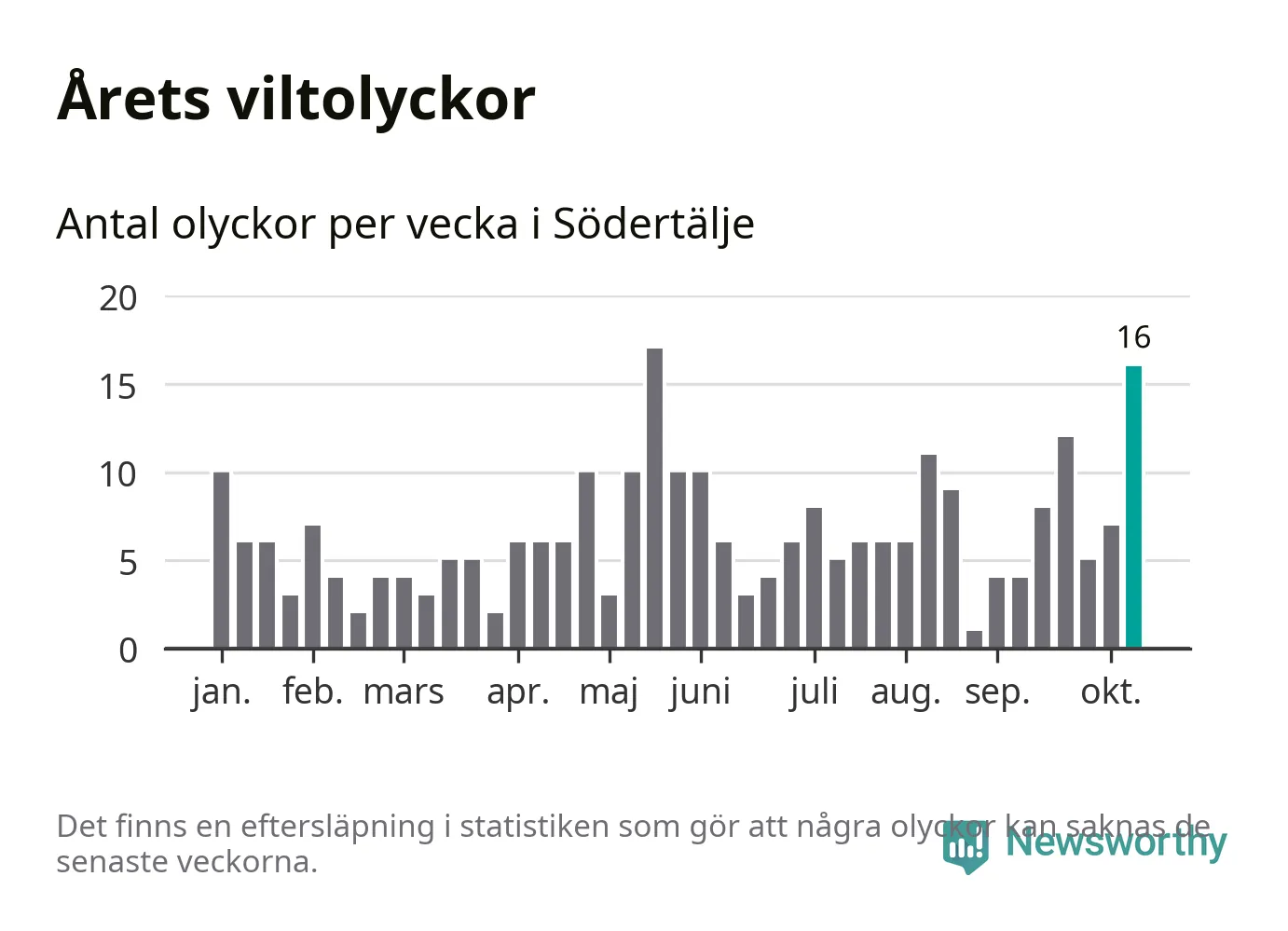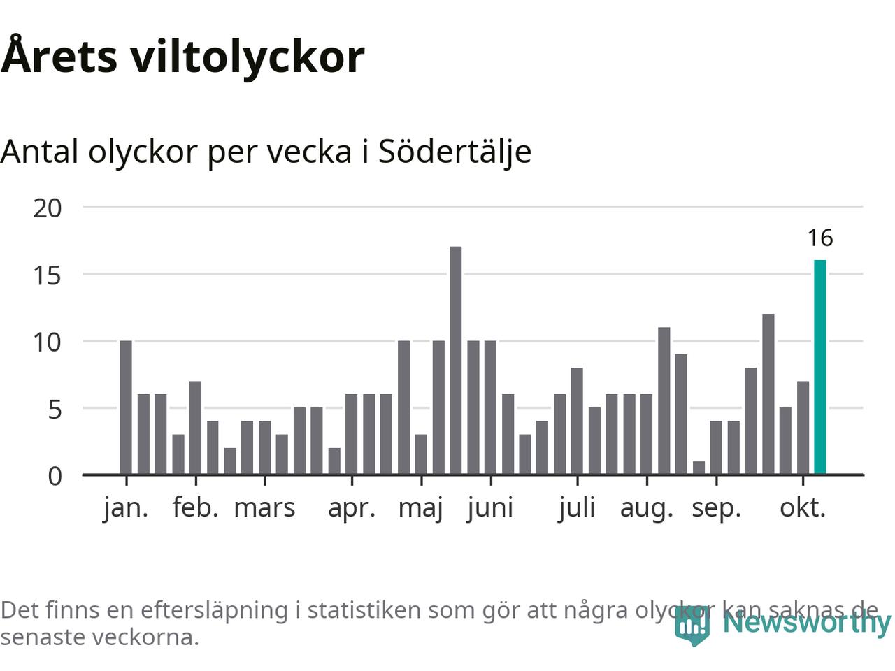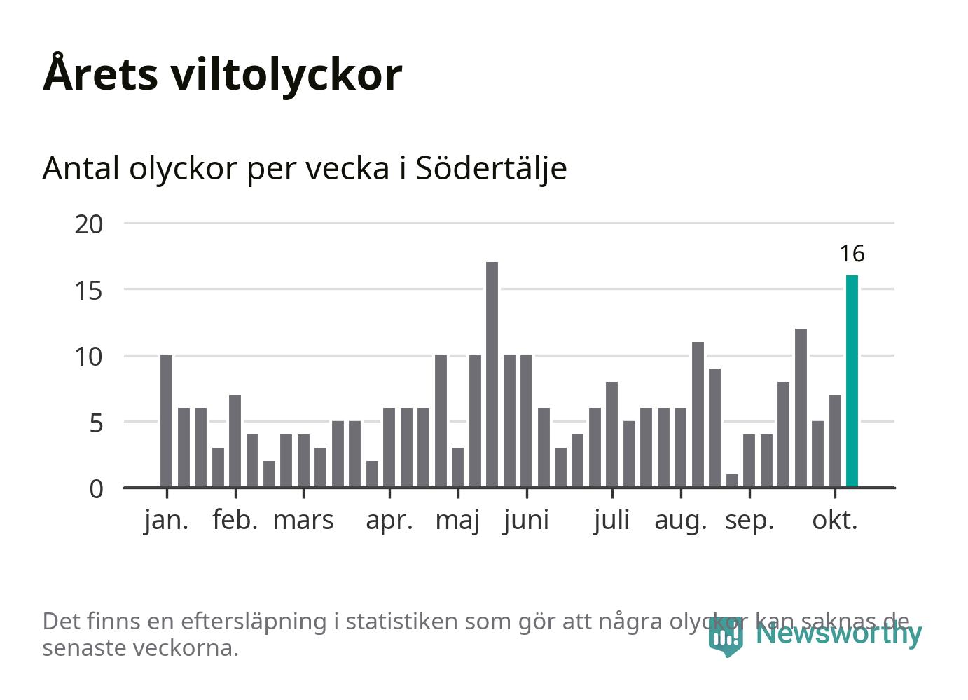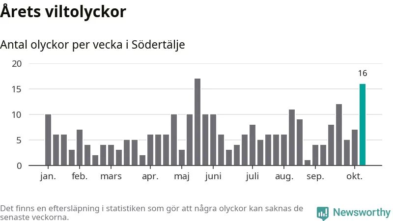 16 olyckor på en enda vecka är också ovanligt många. Bara fem gånger tidigare sedan 2015 har det skett