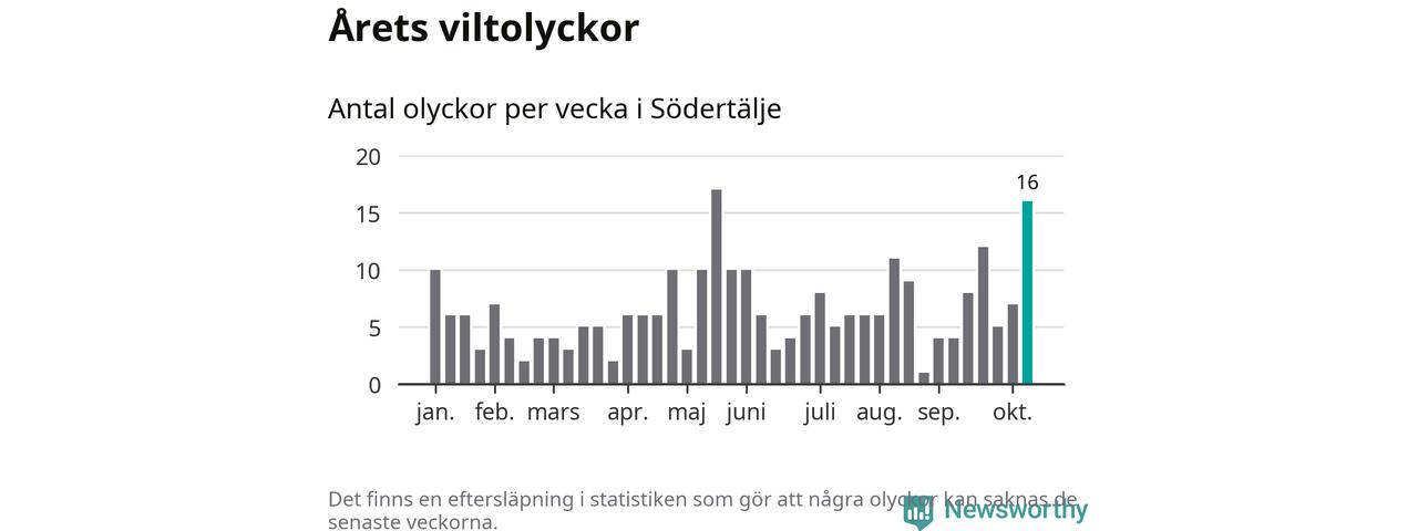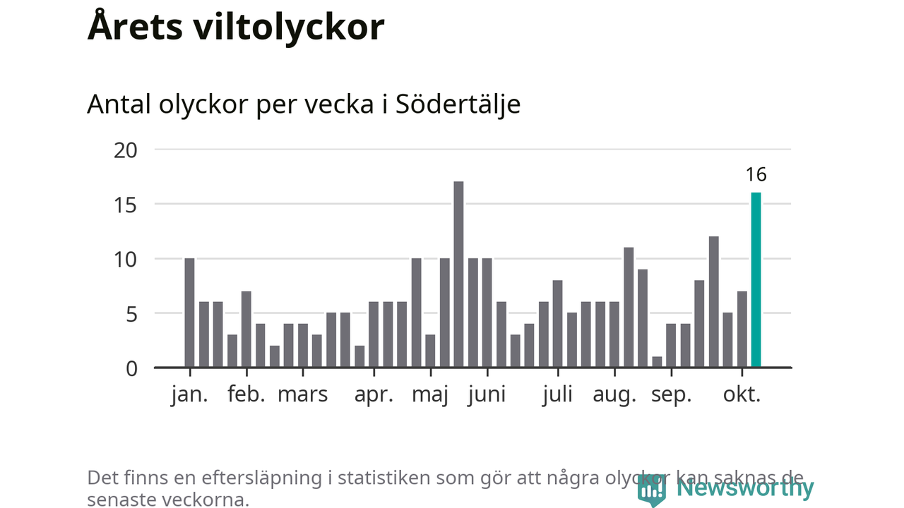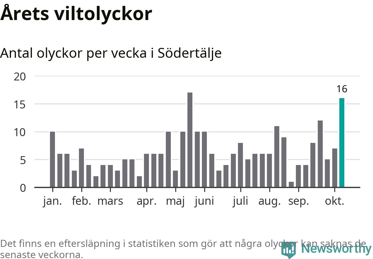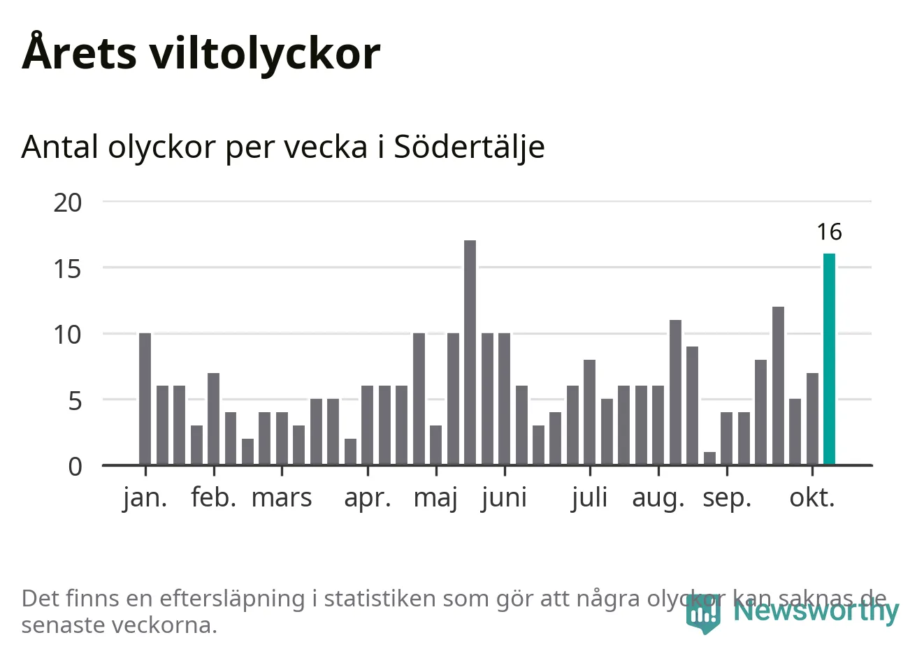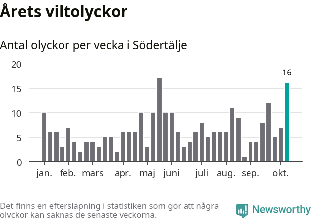 16 olyckor på en enda vecka är också ovanligt många. Bara fem gånger tidigare sedan 2015 har det skett