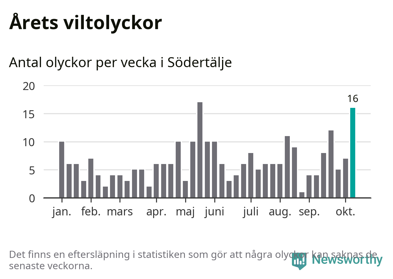 269 viltolyckor i kommunen. Det är mer än genomsnittet för motsvarande period (omkring 213) de senaste tio åren.