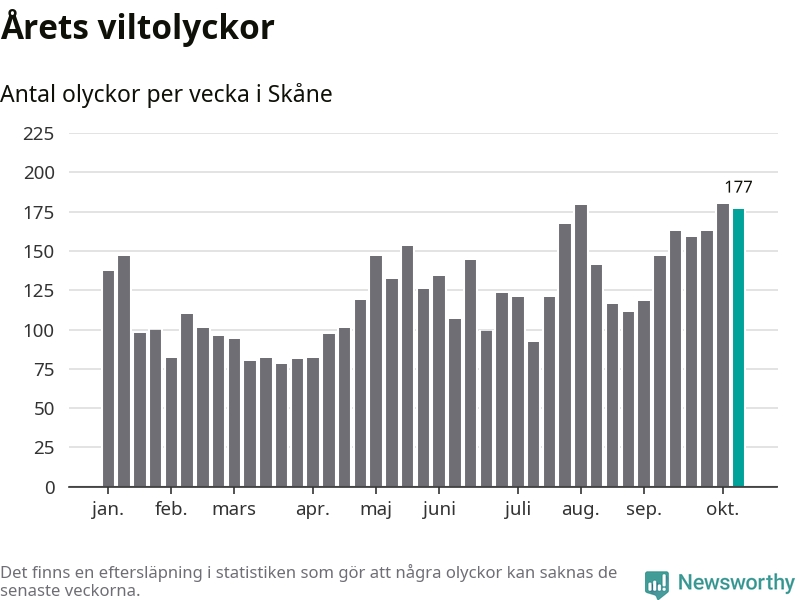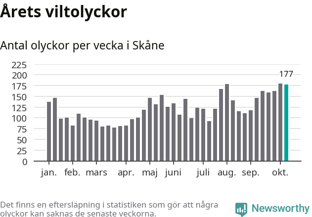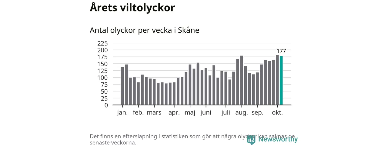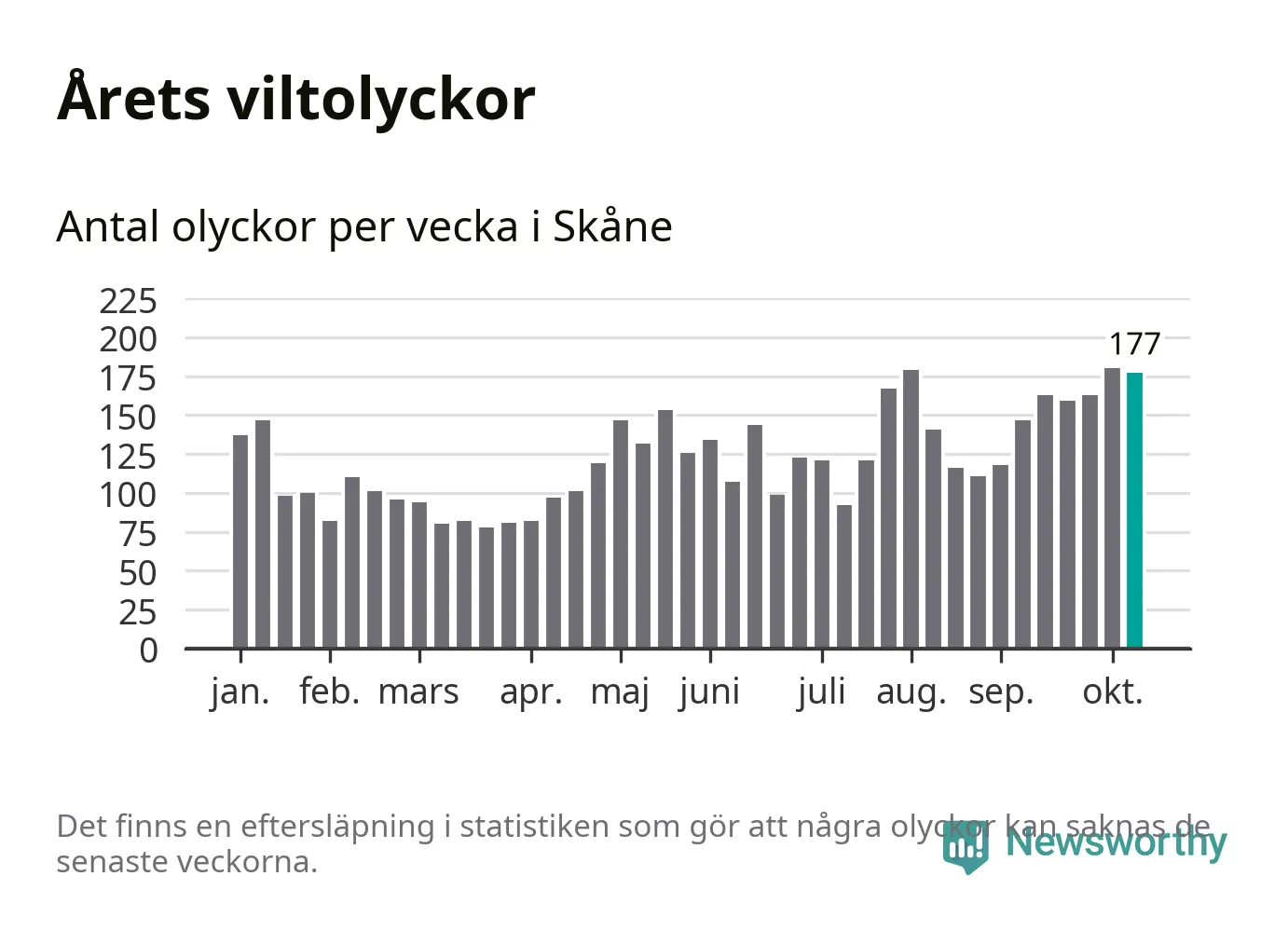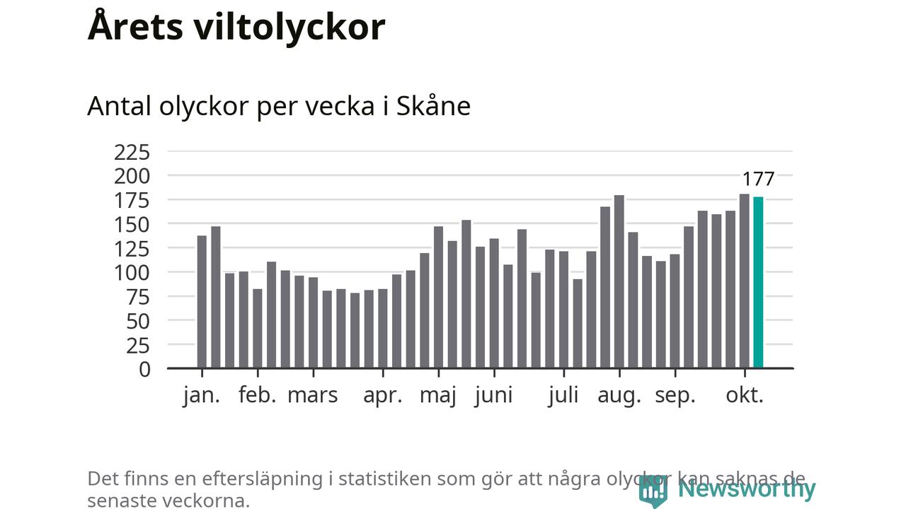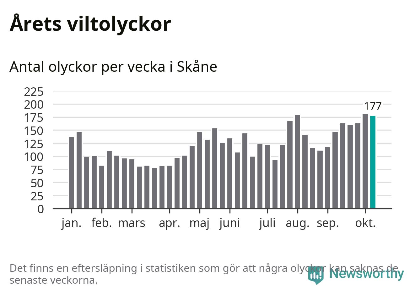 Hittills har 177 viltolyckor rapporterats in i Skåne län från vecka 42. Se listan här.
