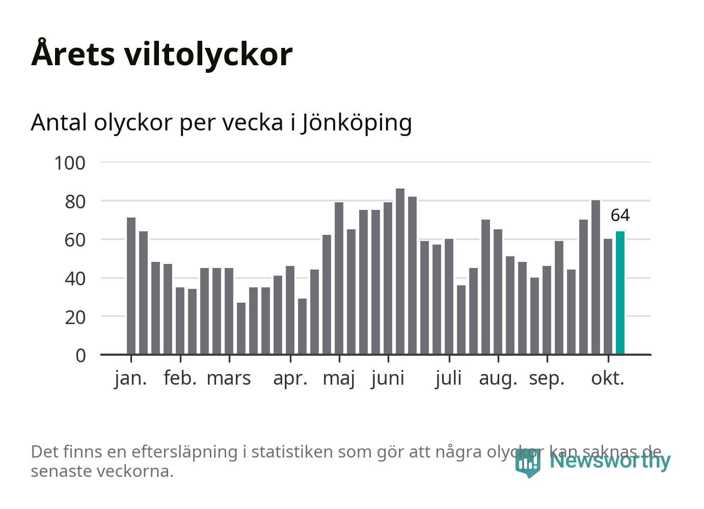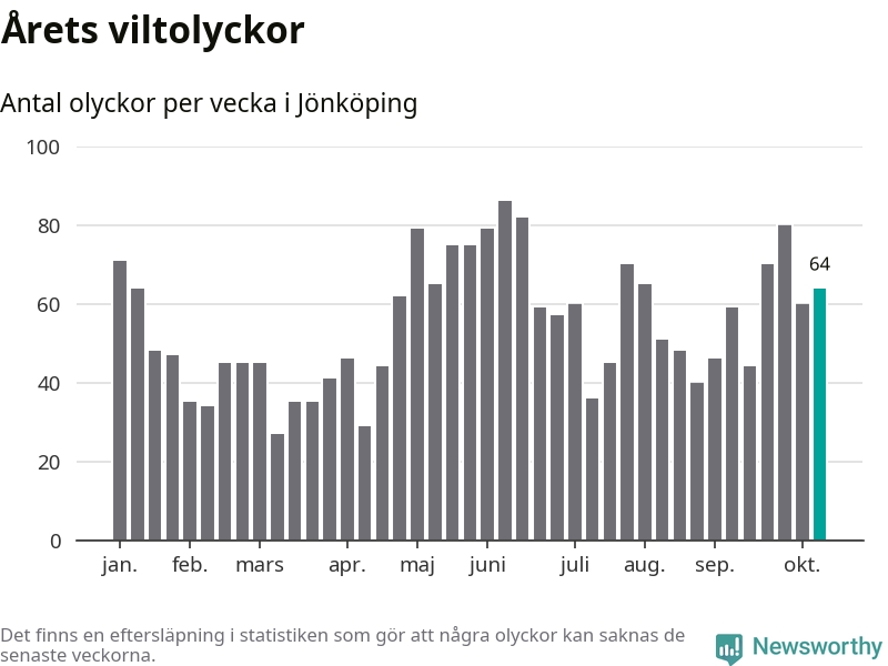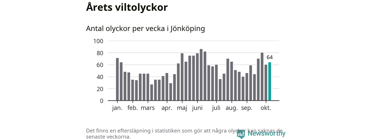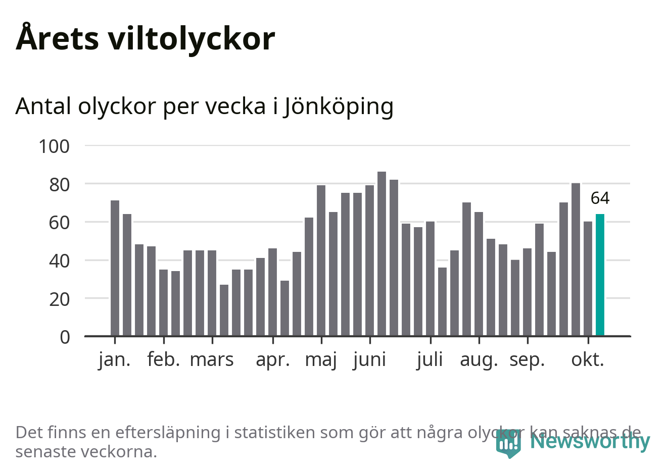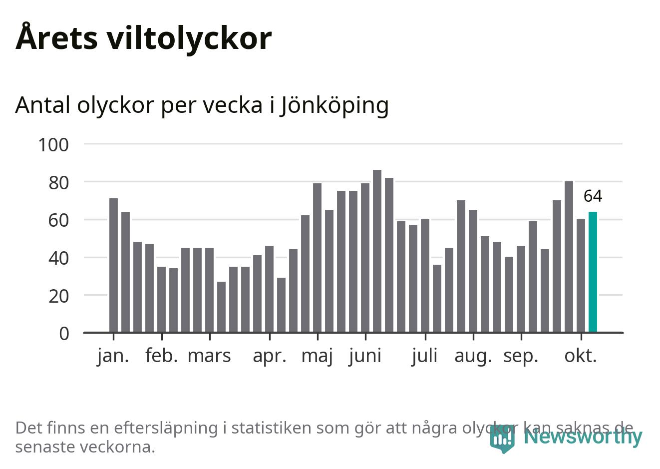 Hittills har 64 viltolyckor rapporterats in i Jönköpings län från vecka 42. Se listan här.