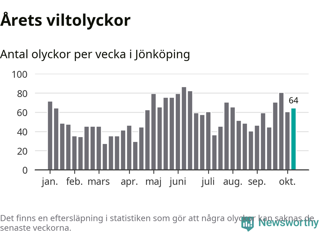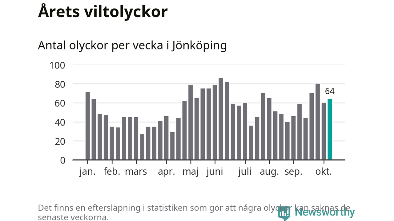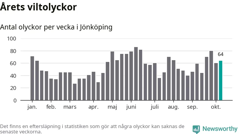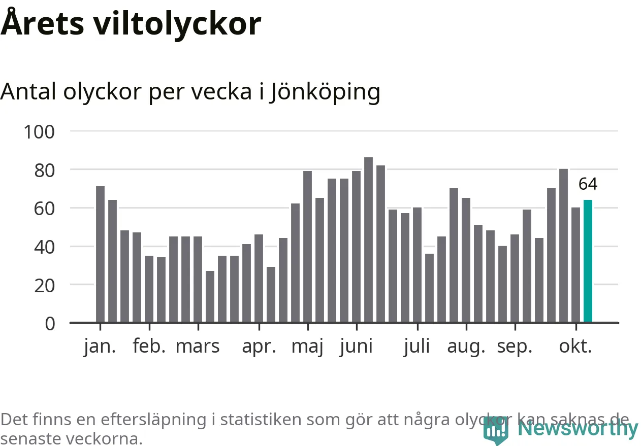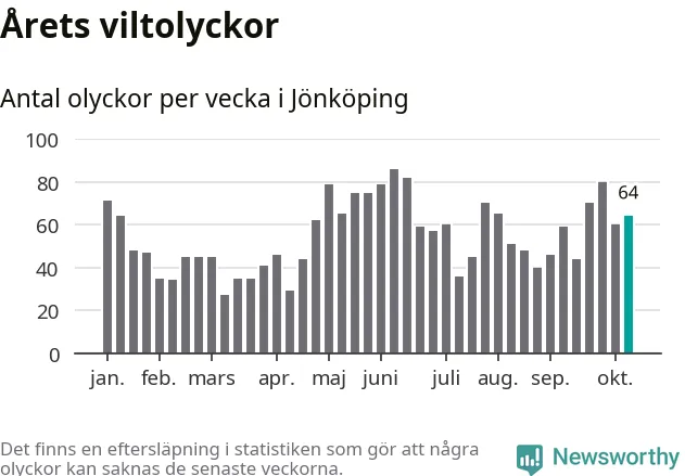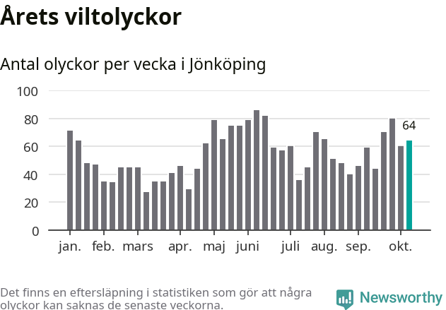 Hittills har 64 viltolyckor rapporterats in i Jönköpings län från vecka 42. Se listan här.