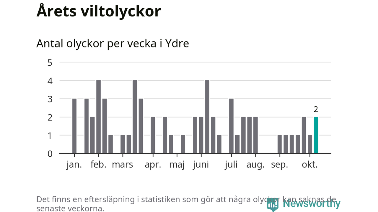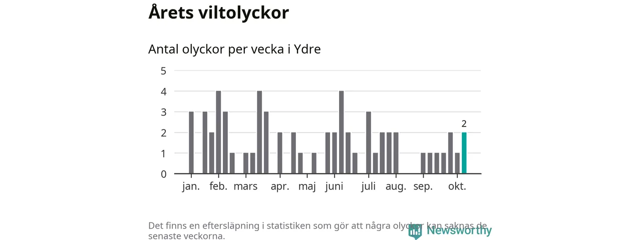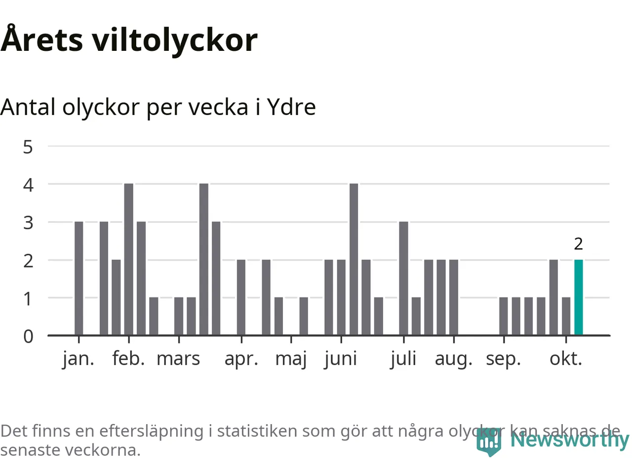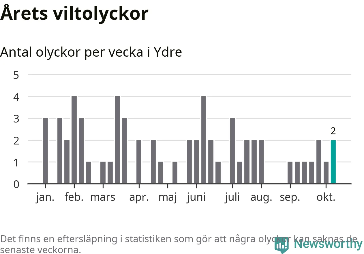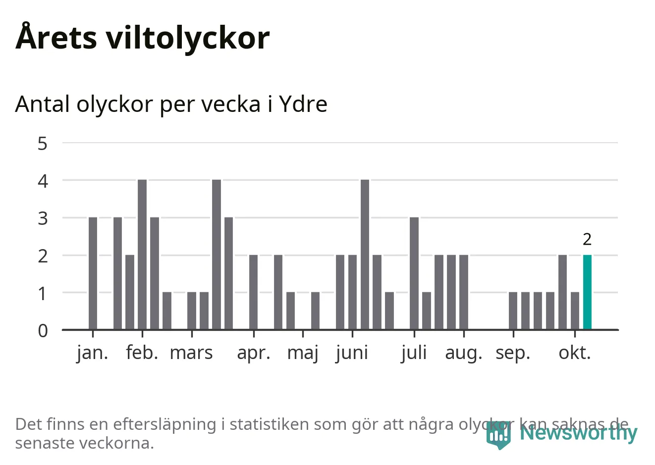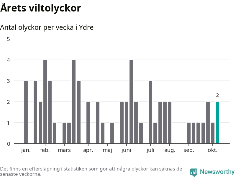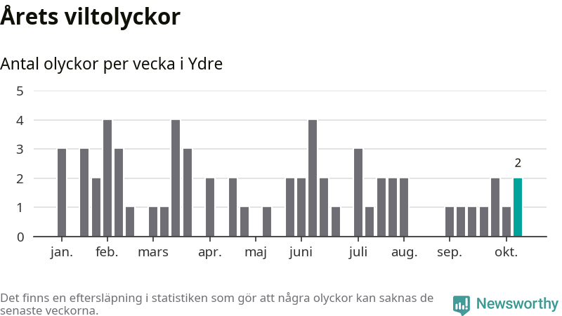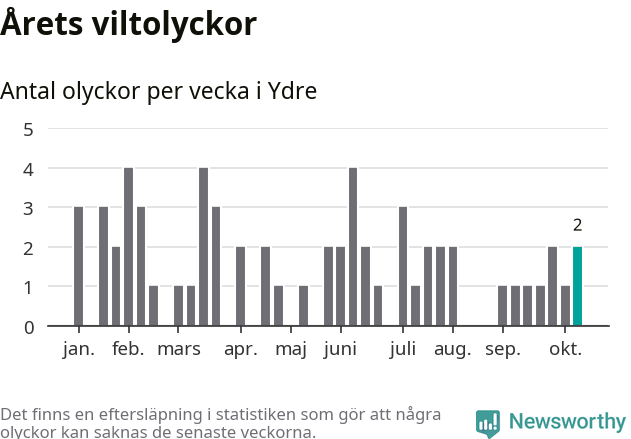 Hittills har två viltolyckor rapporterats in i Ydre kommun från vecka 42. Se listan här.