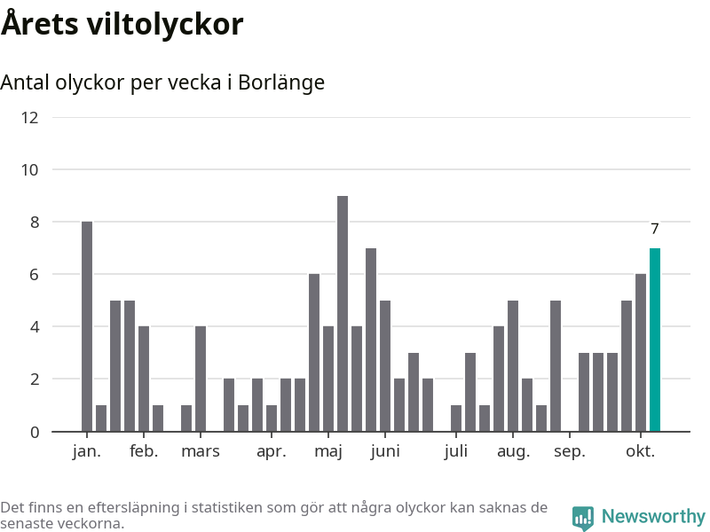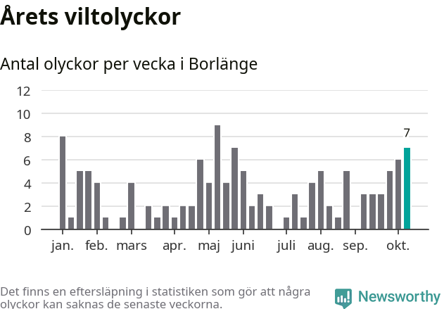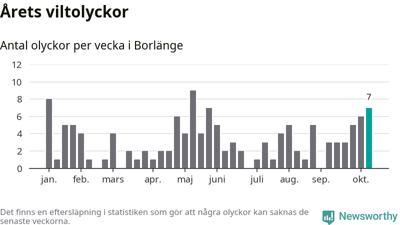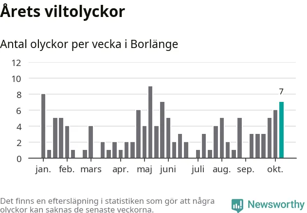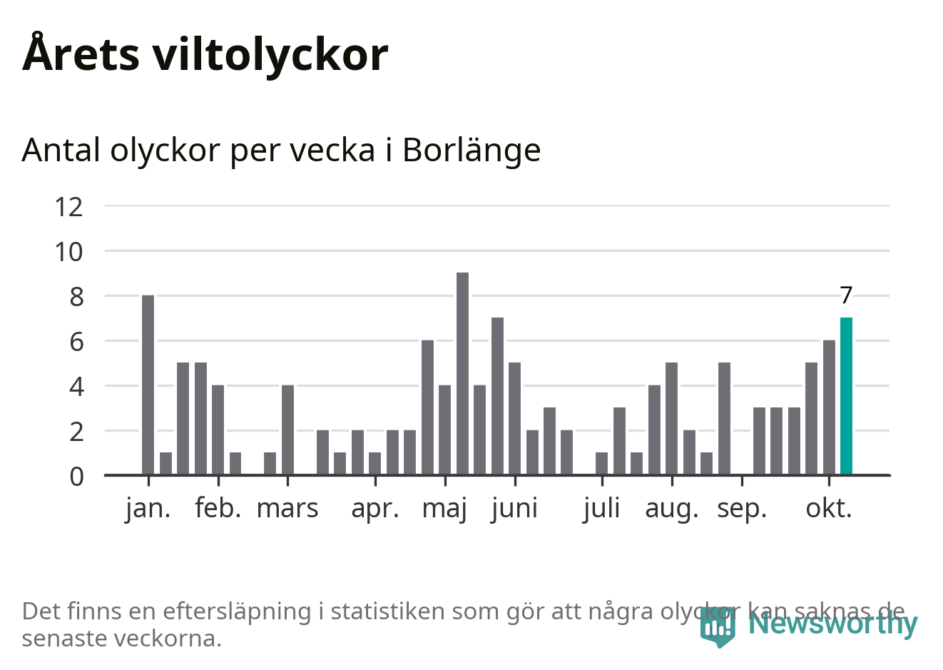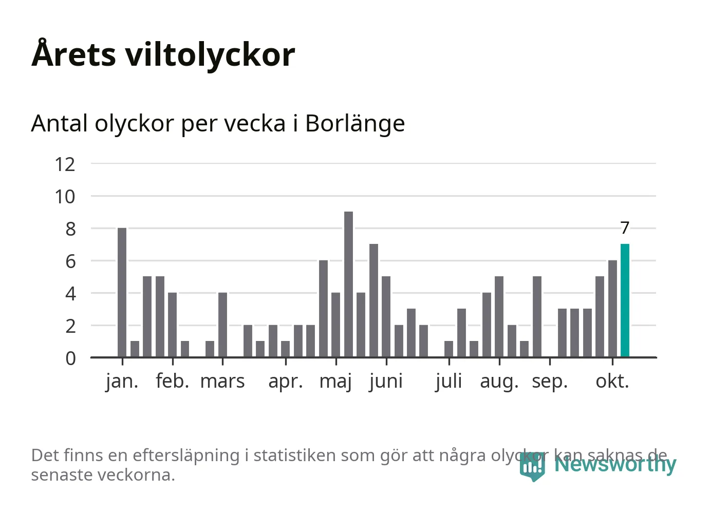 Hittills har sju viltolyckor rapporterats in i Borlänge kommun från vecka 42. Se listan här.