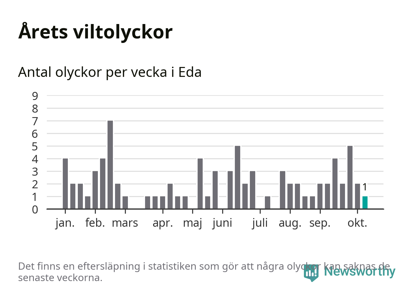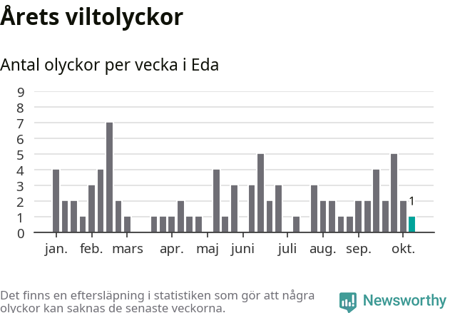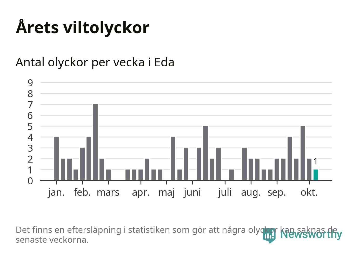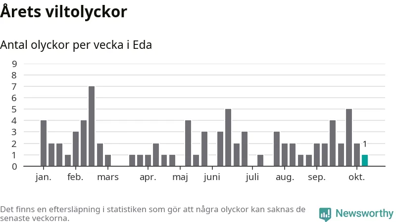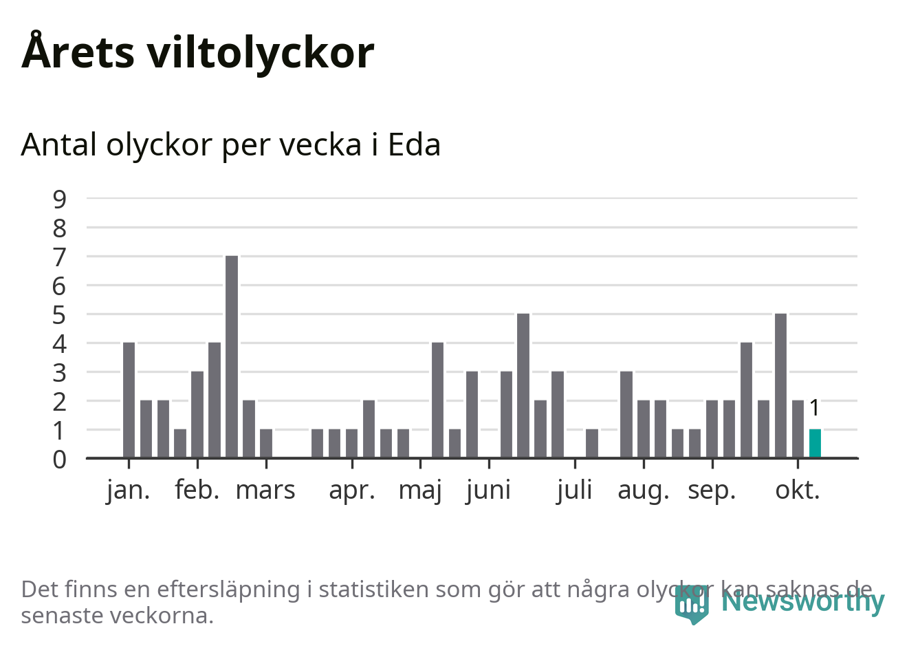 Från förra veckan (vecka 42) har hittills en viltolycka rapporterats in i Eda kommun.