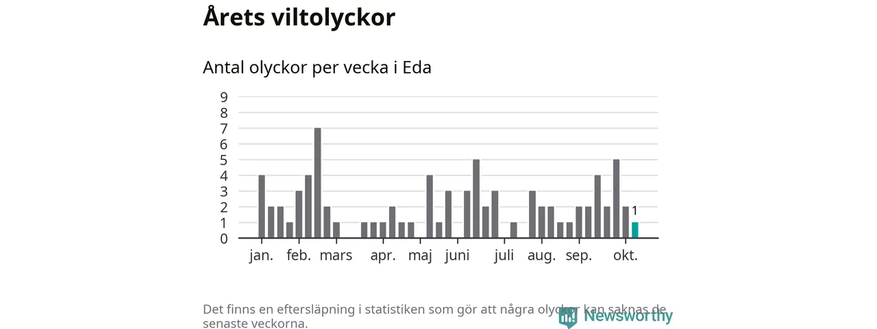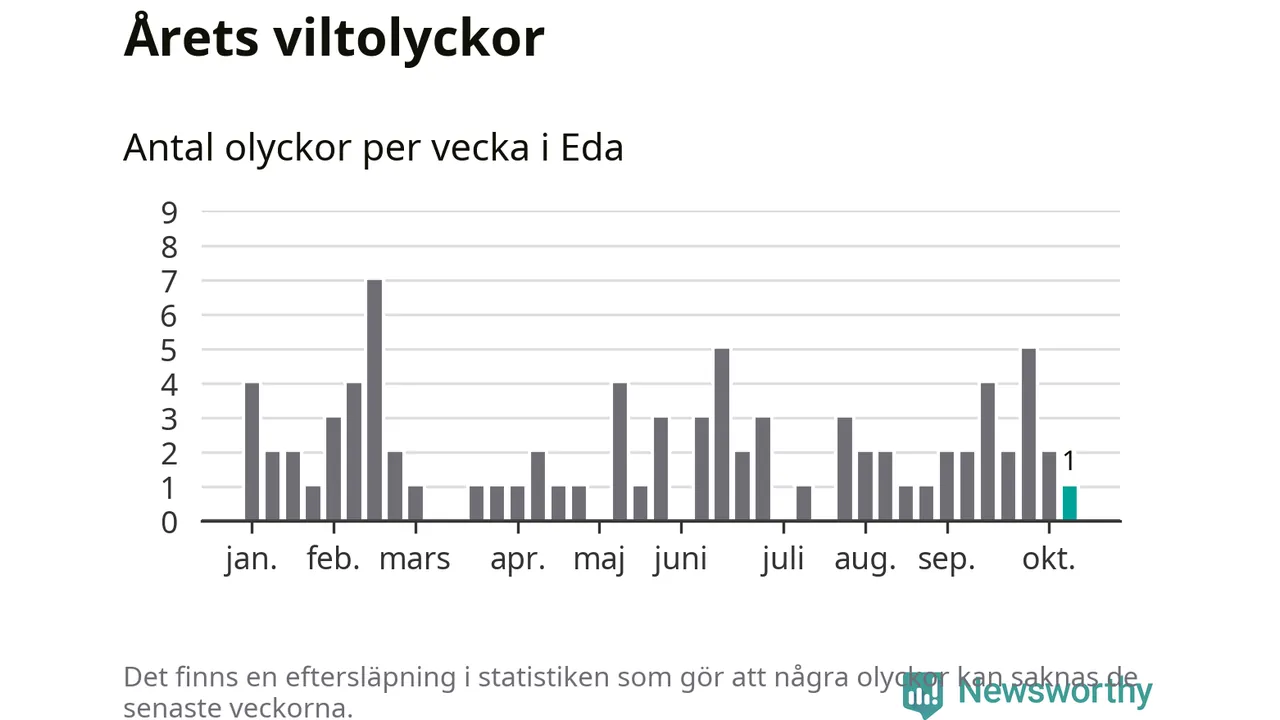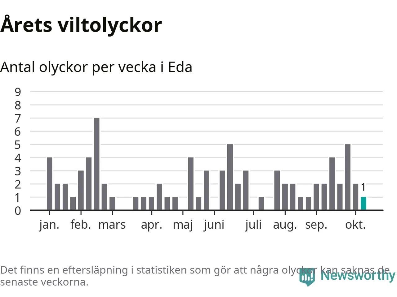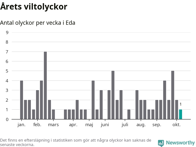 Från förra veckan (vecka 42) har hittills en viltolycka rapporterats in i Eda kommun.