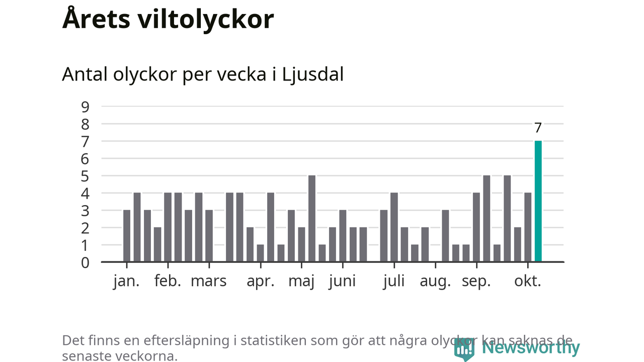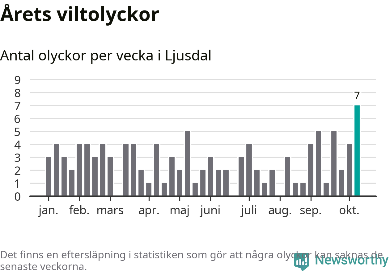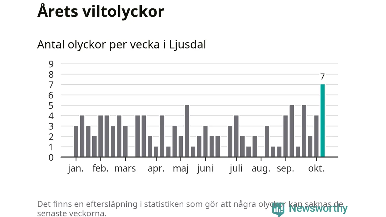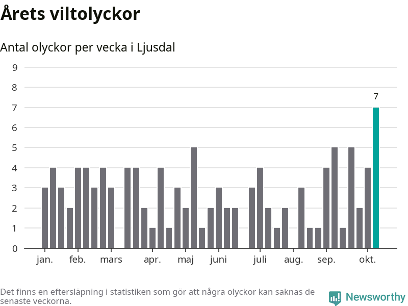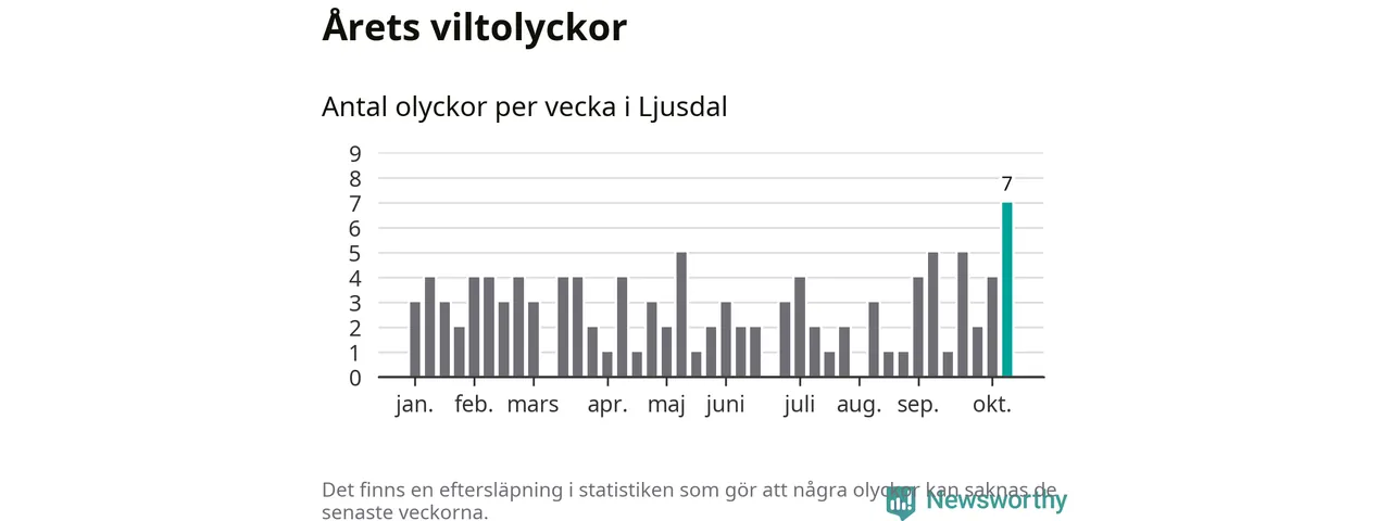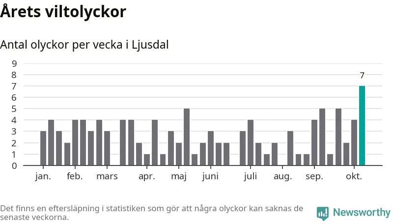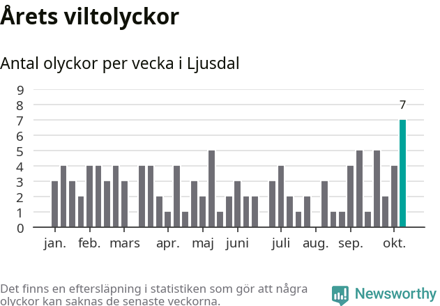 Under vecka 42 rapporterades sju viltolyckor in i Ljusdals kommun. Det är det största antalet på en enskild vecka hittills i år.