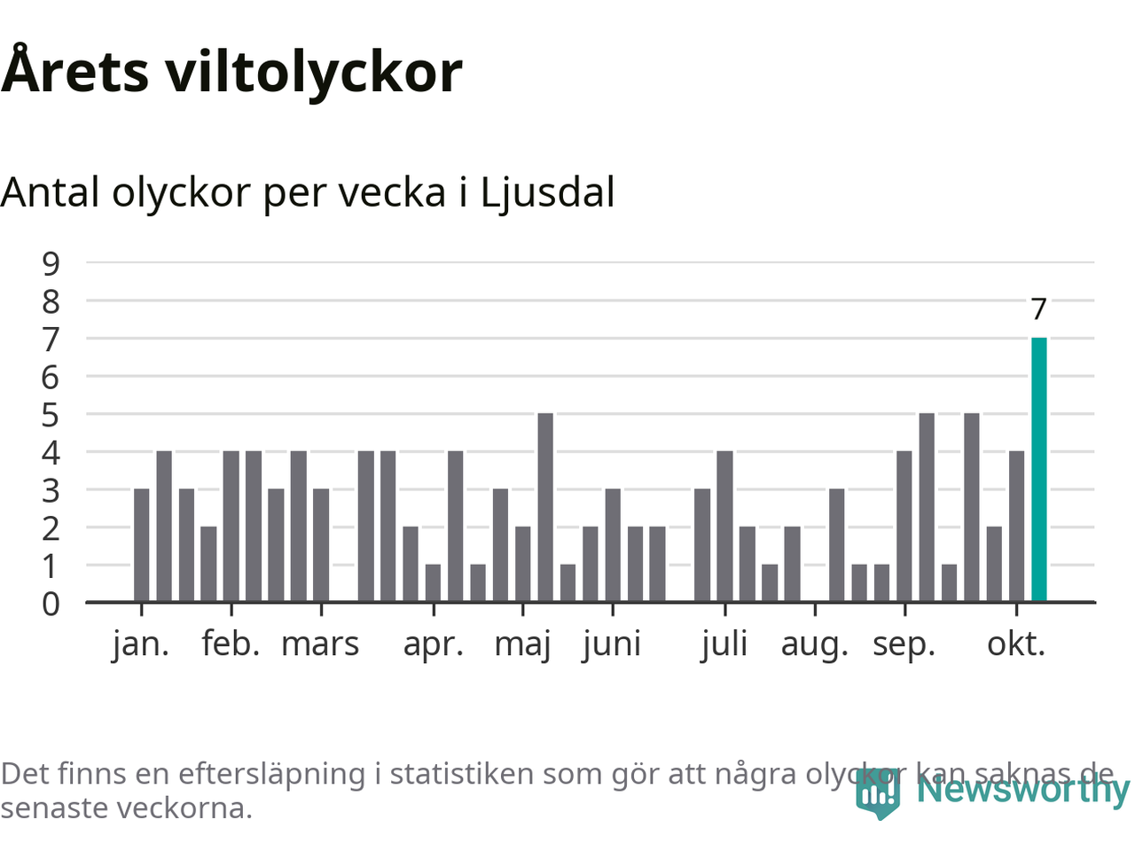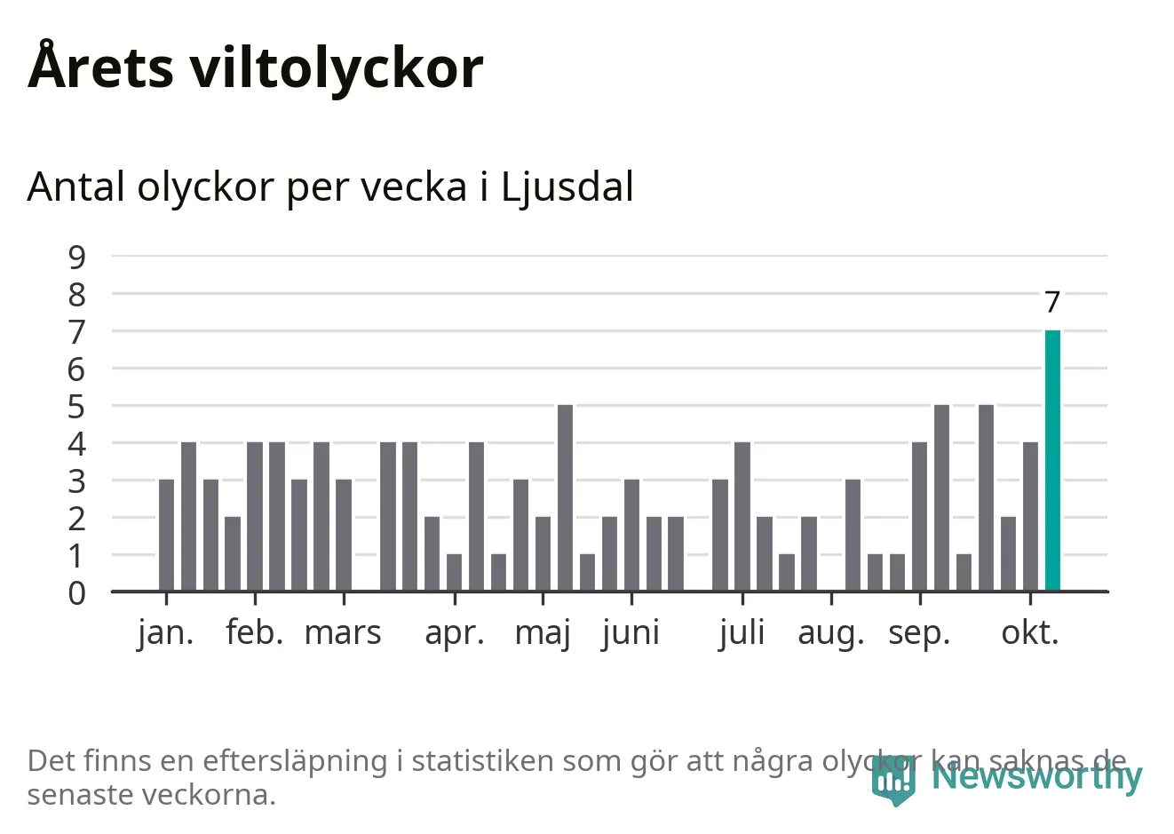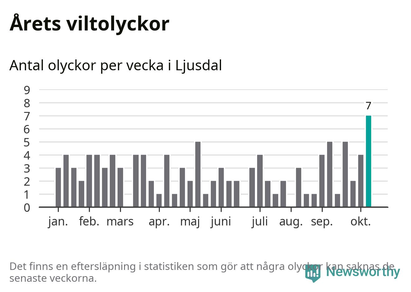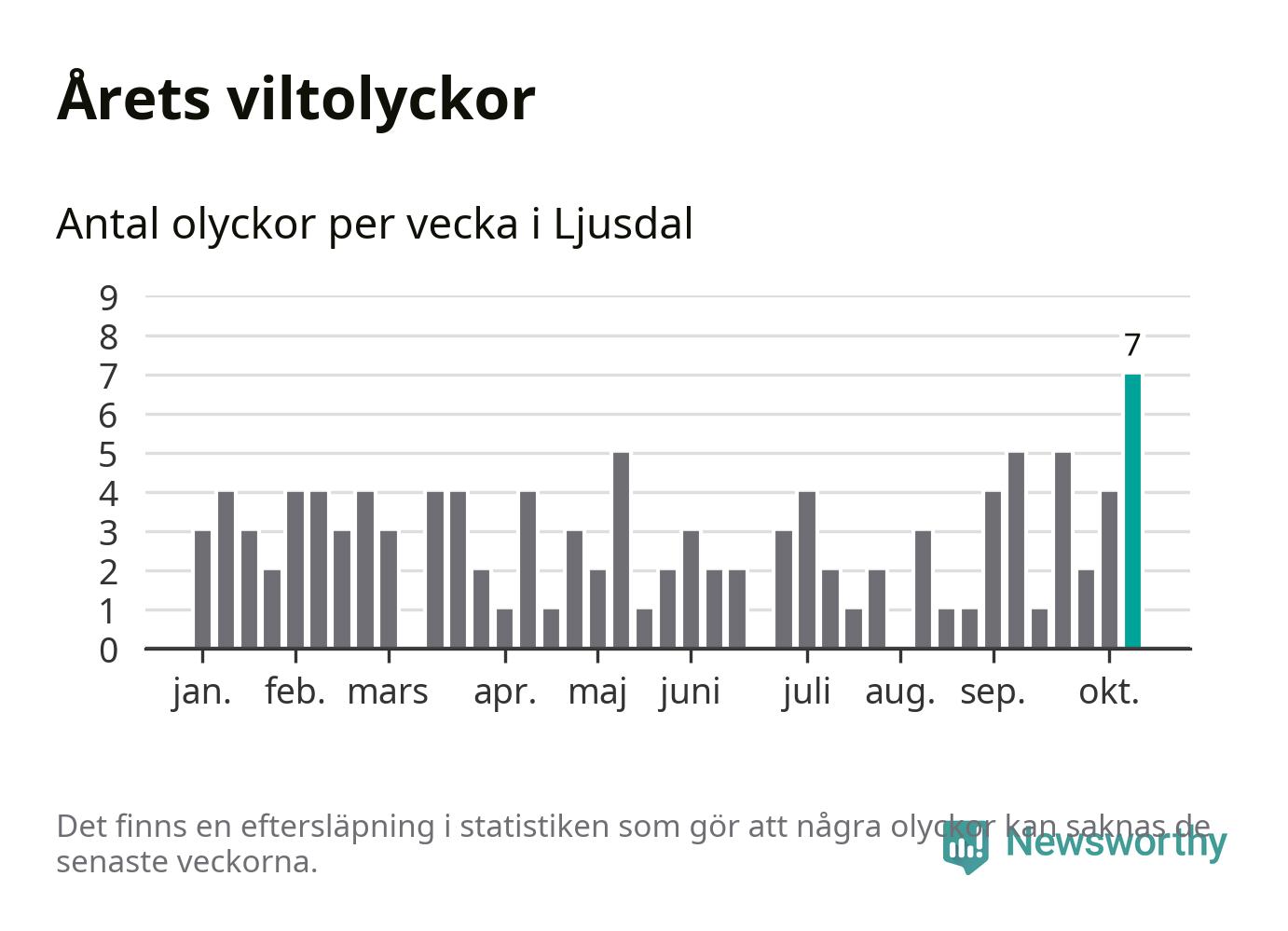 Under vecka 42 rapporterades sju viltolyckor in i Ljusdals kommun. Det är det största antalet på en enskild vecka hittills i år.