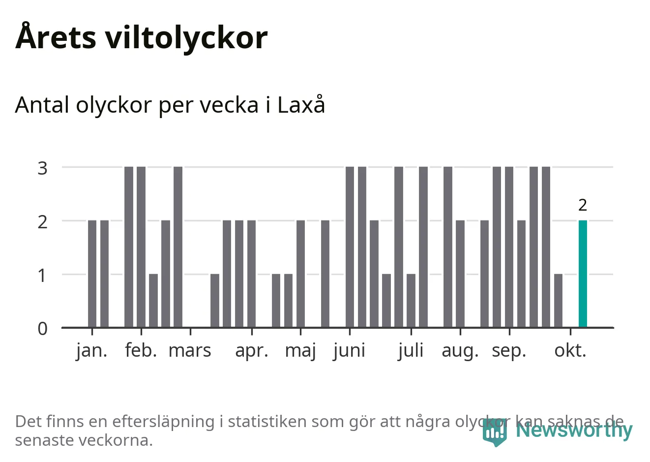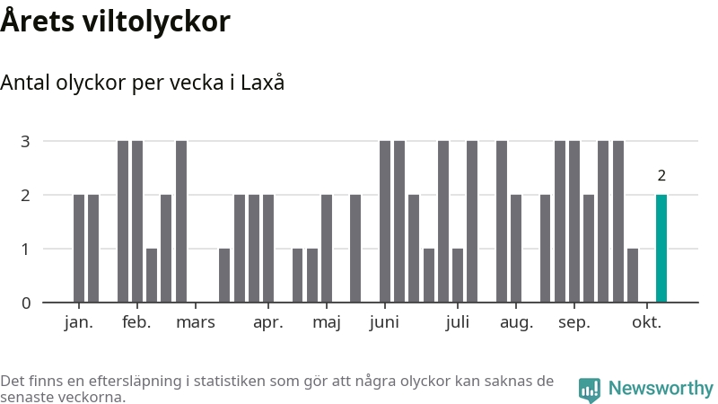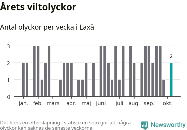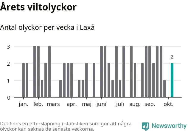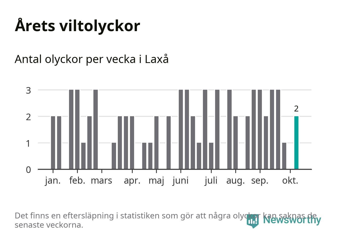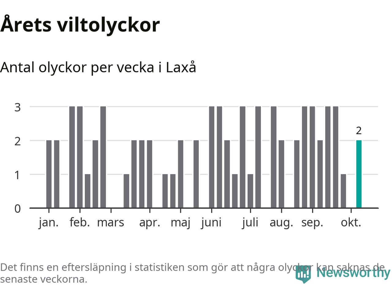 Hittills har två viltolyckor rapporterats in i Laxå kommun från vecka 42. Se listan här.