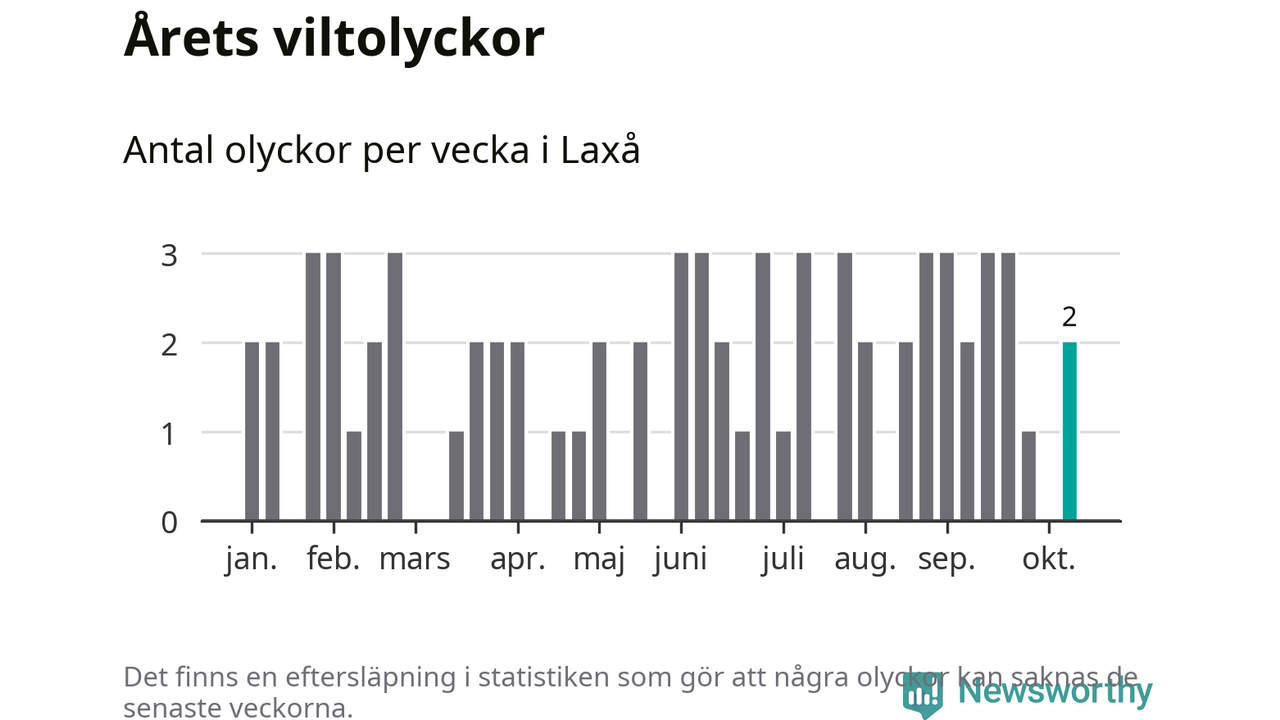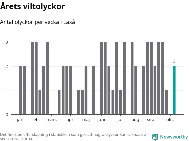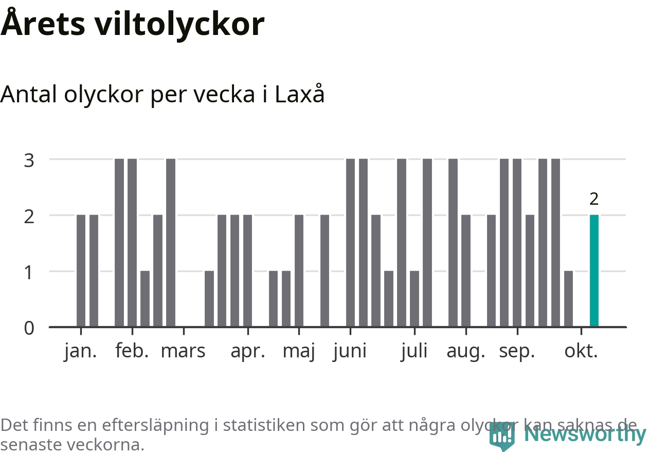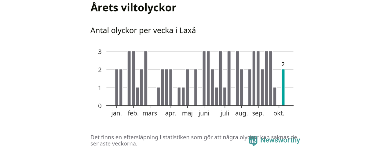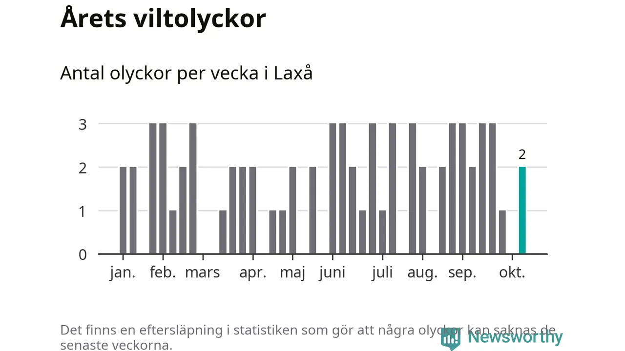 Hittills har två viltolyckor rapporterats in i Laxå kommun från vecka 42. Se listan här.