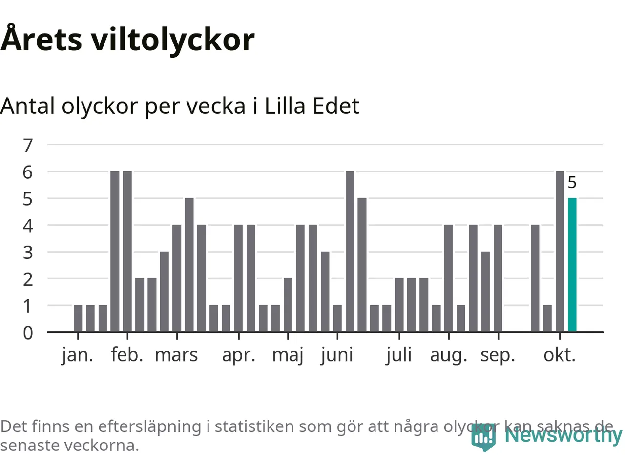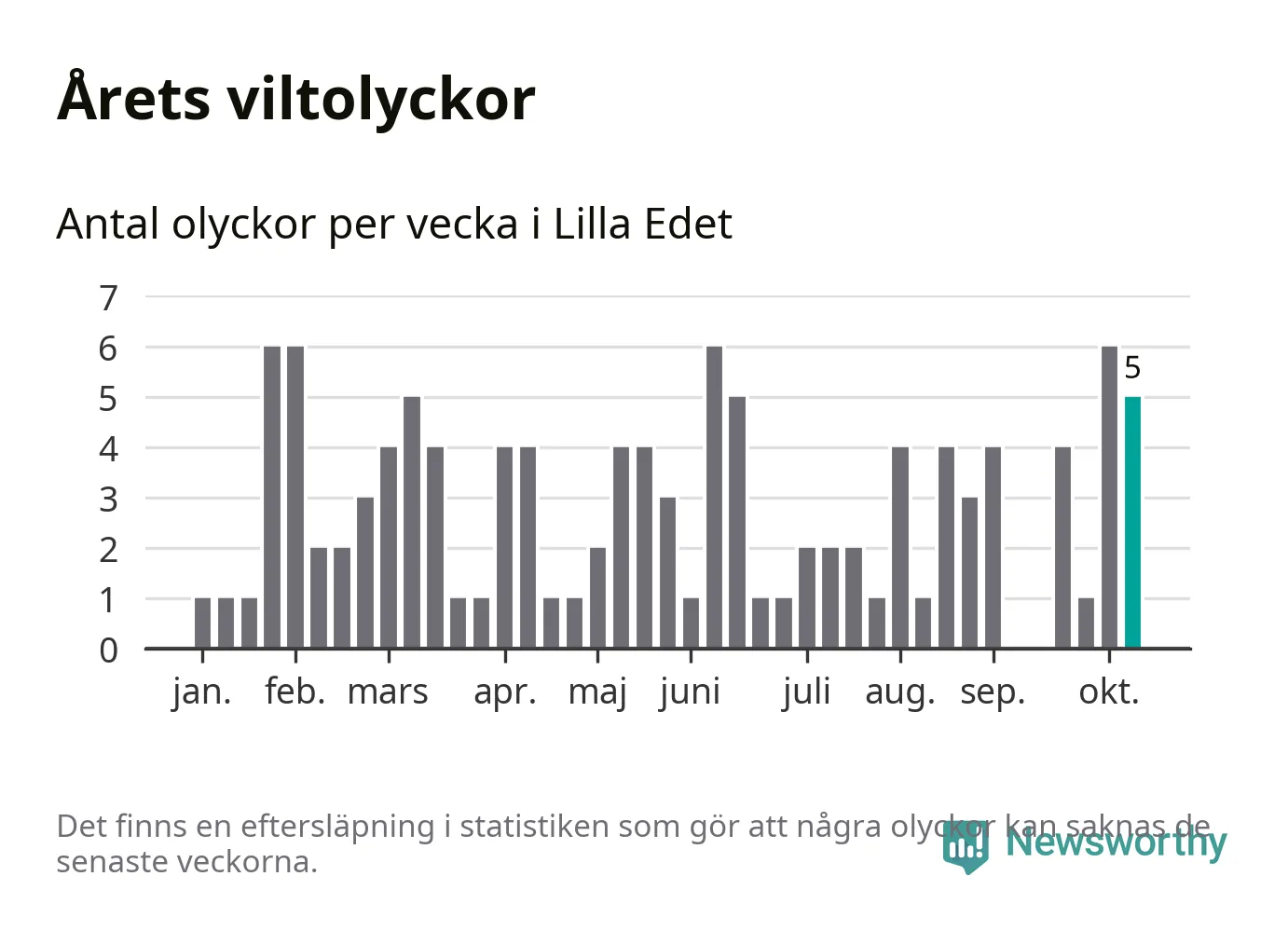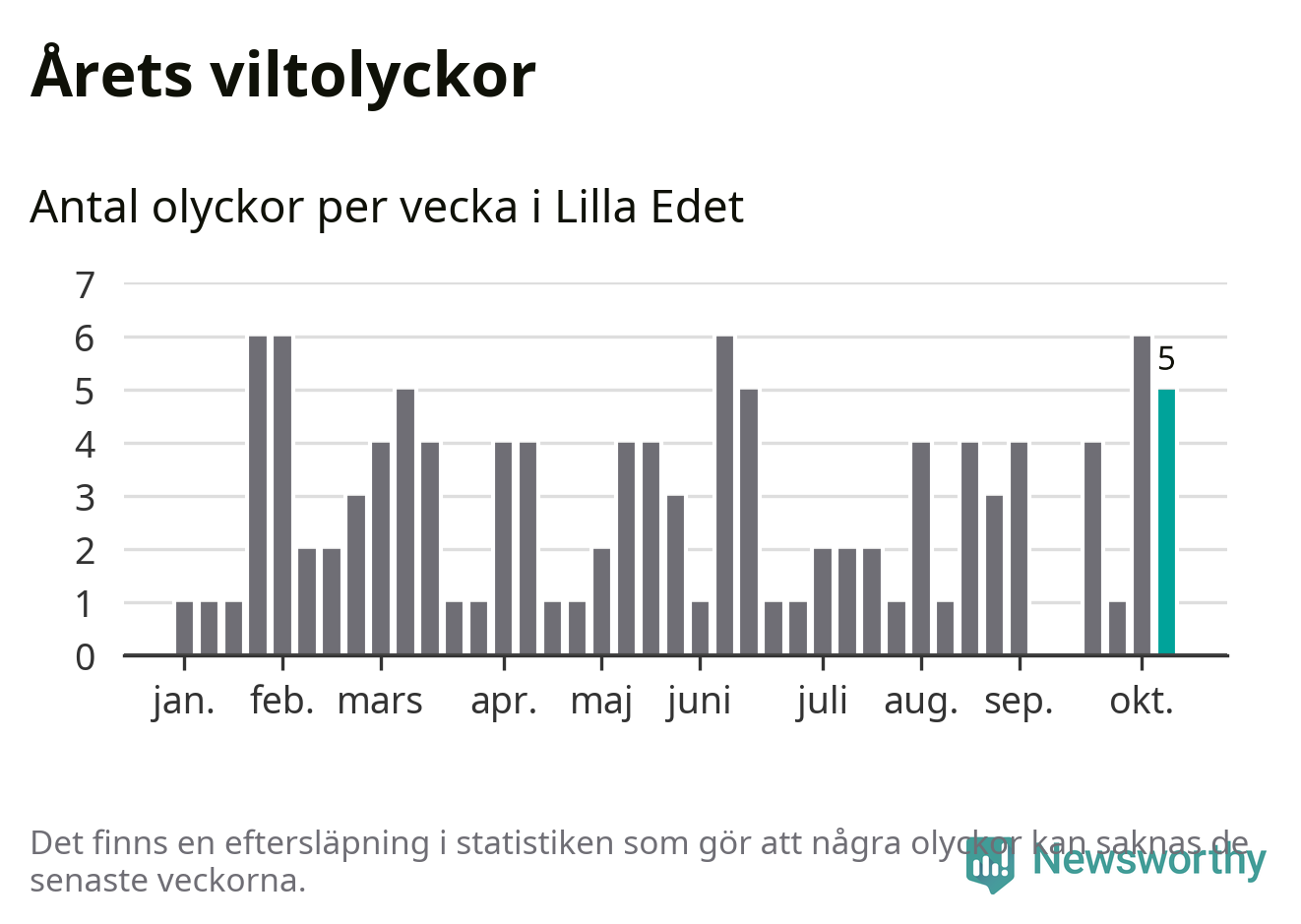 Hittills har fem viltolyckor rapporterats in i Lilla Edets kommun från vecka 42. Se listan här.