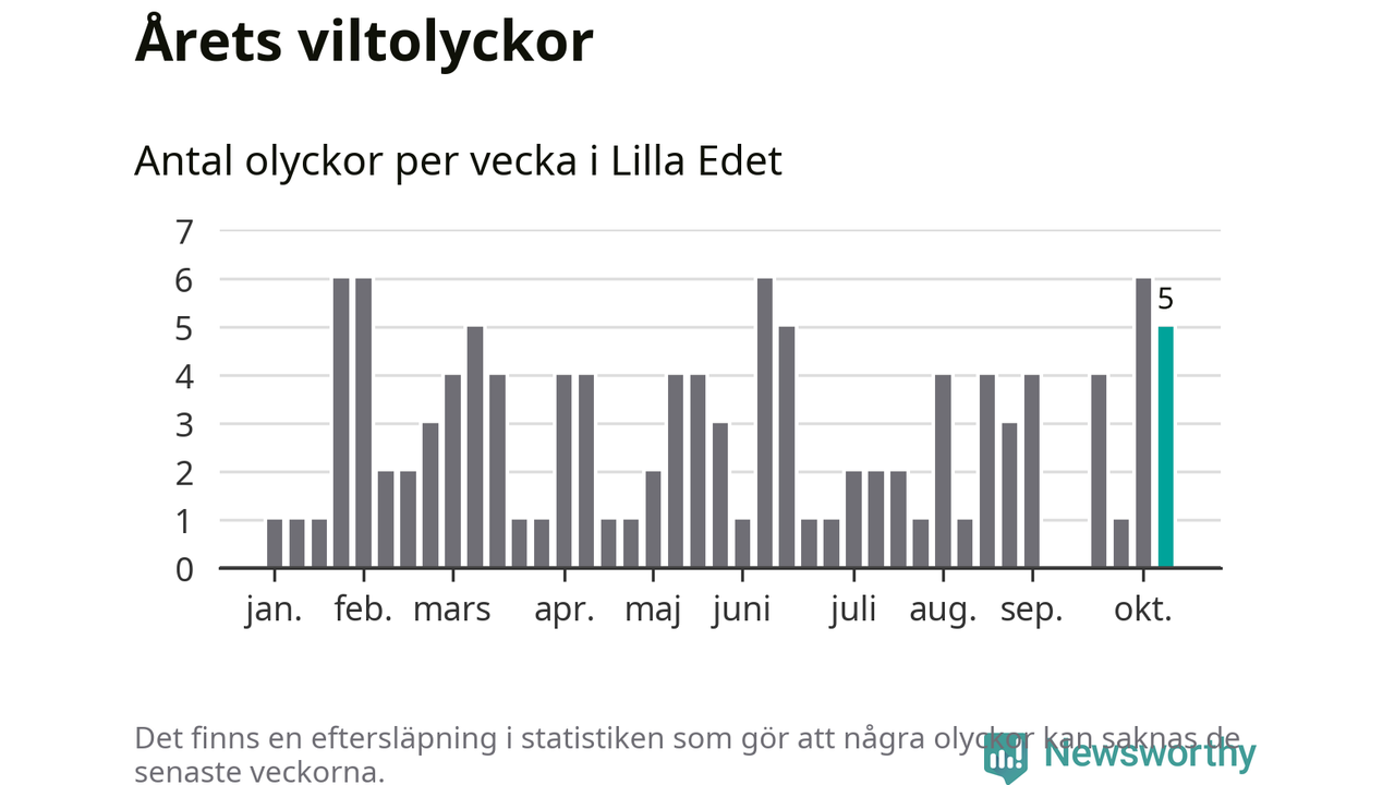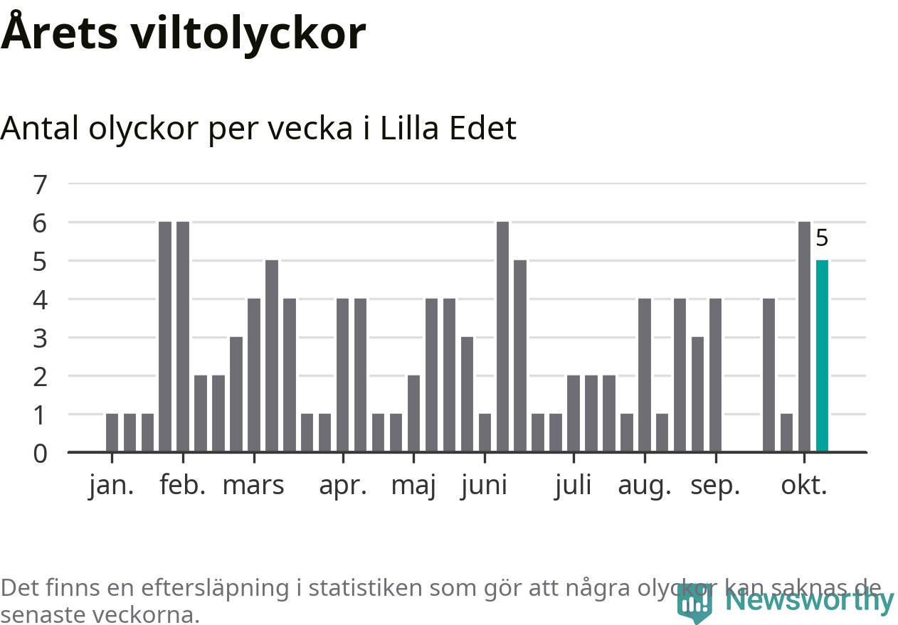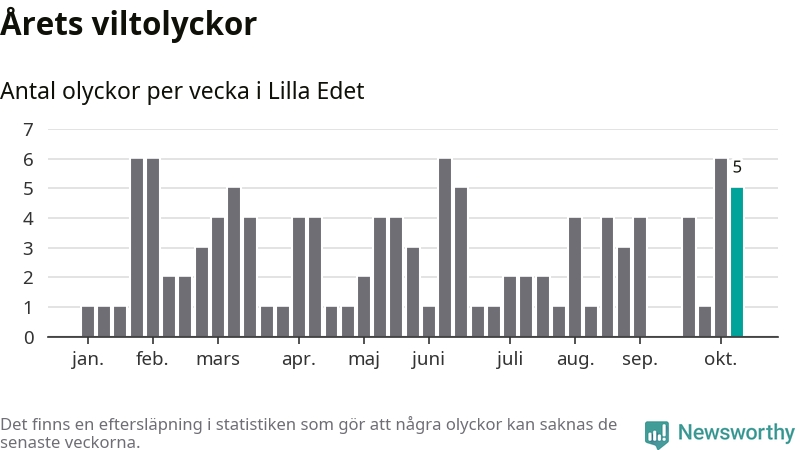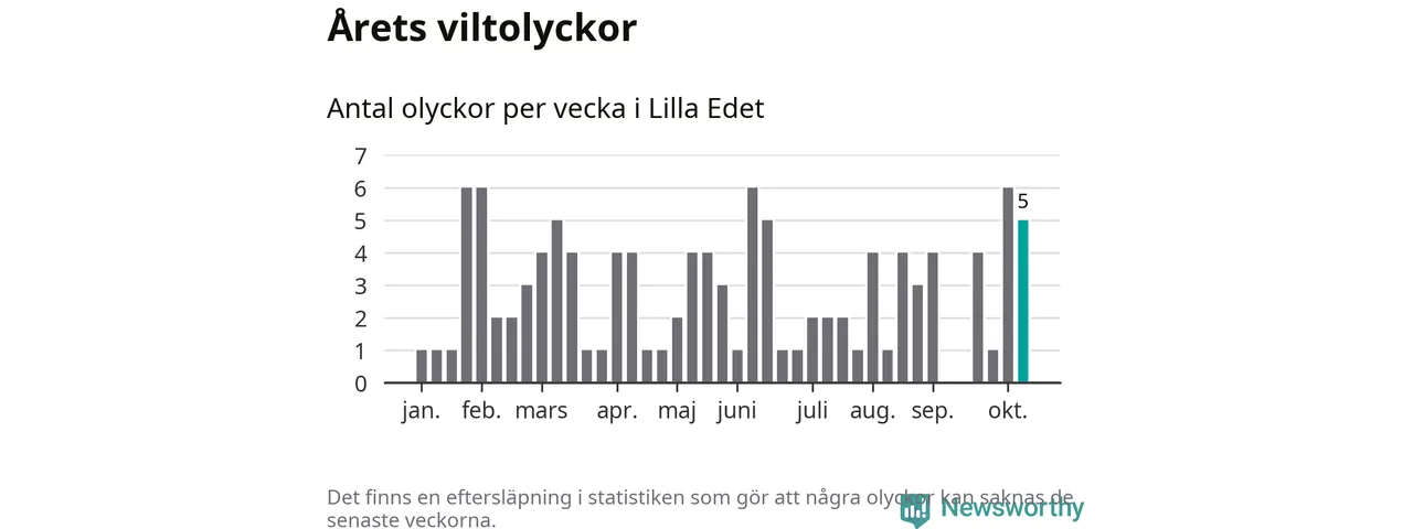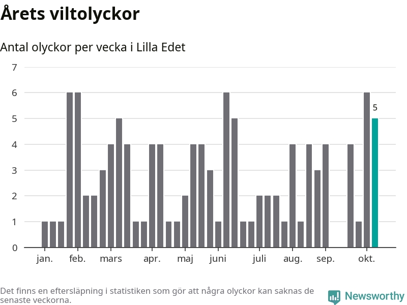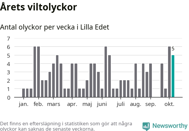 Hittills har fem viltolyckor rapporterats in i Lilla Edets kommun från vecka 42. Se listan här.
