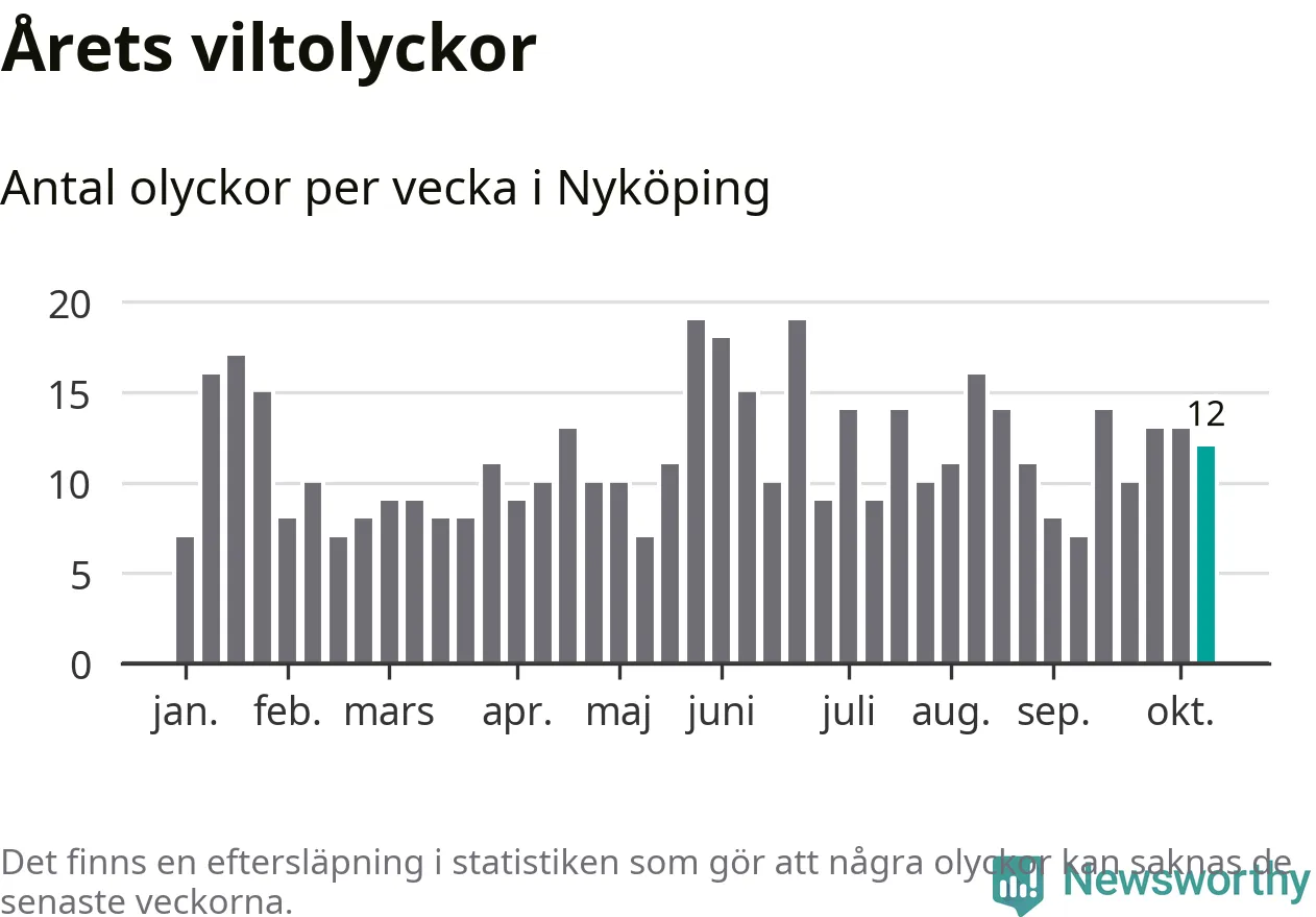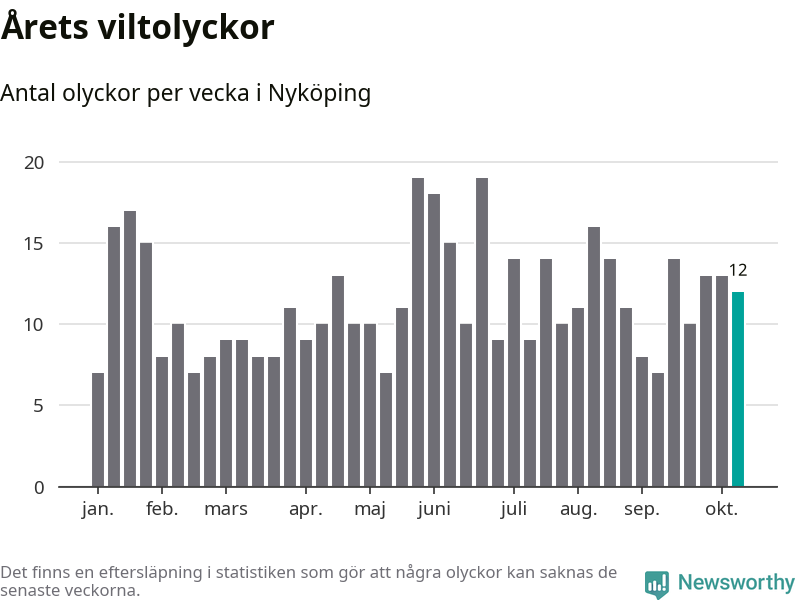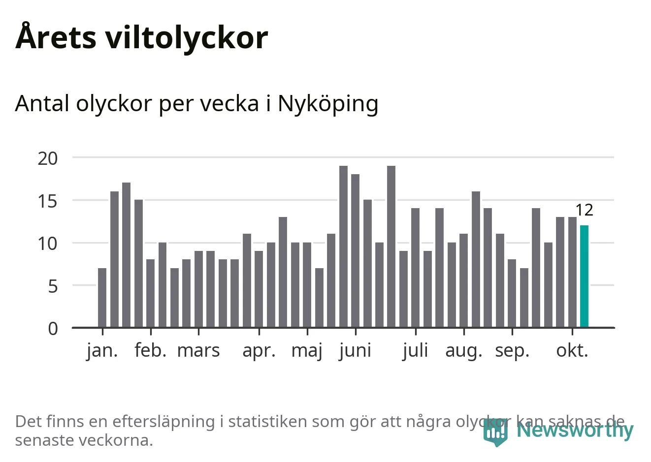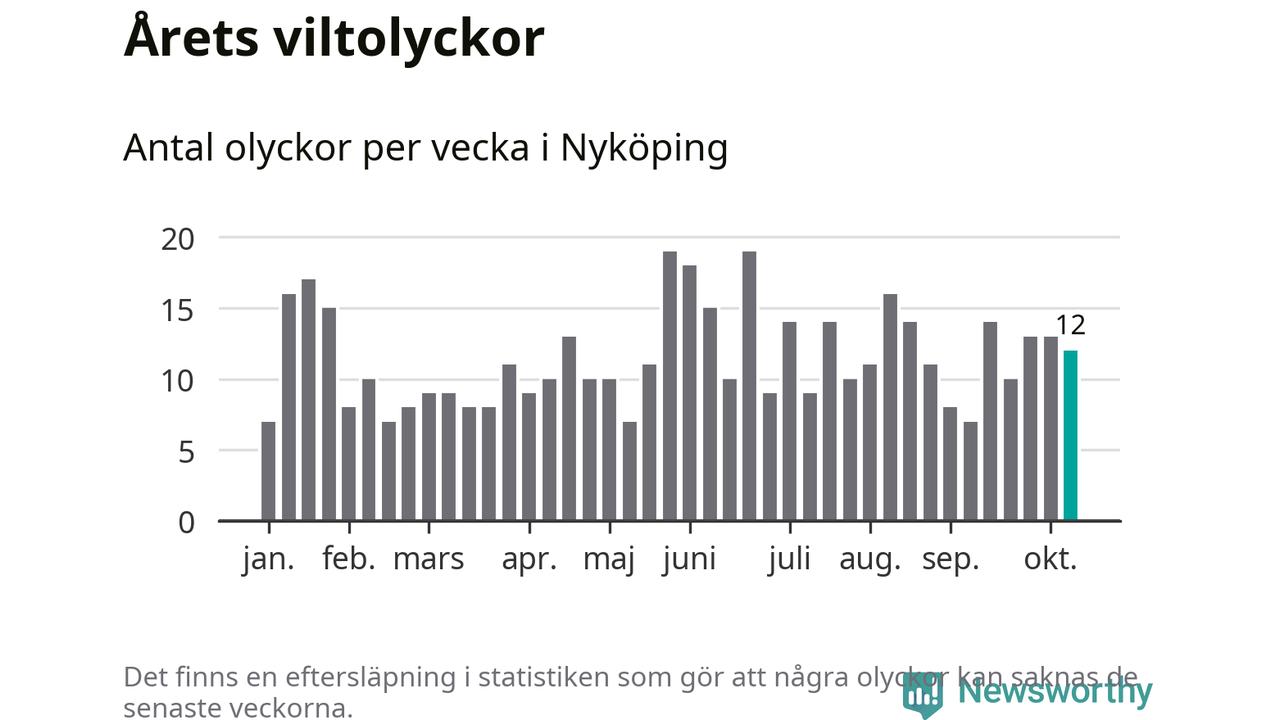 Hittills har tolv viltolyckor rapporterats in i Nyköpings kommun från vecka 42. Se listan här.