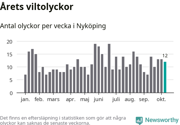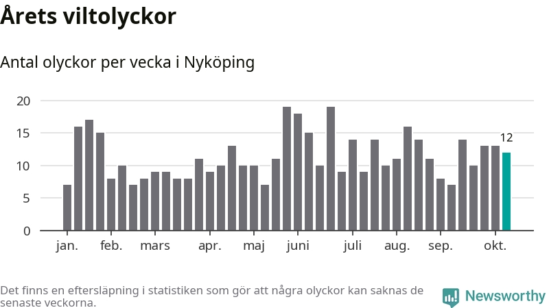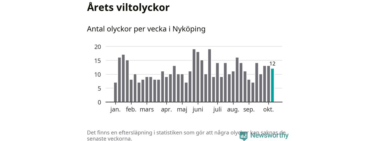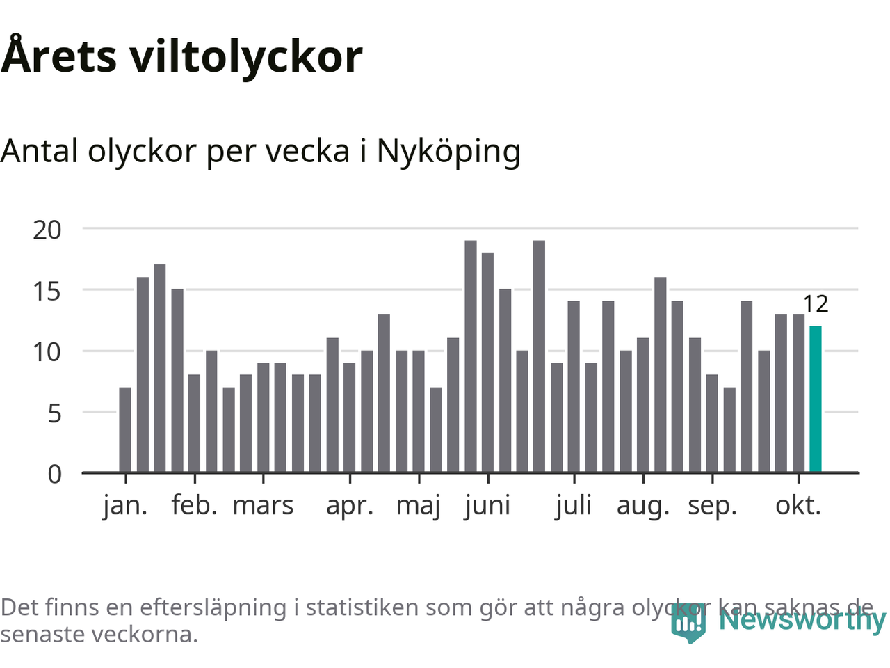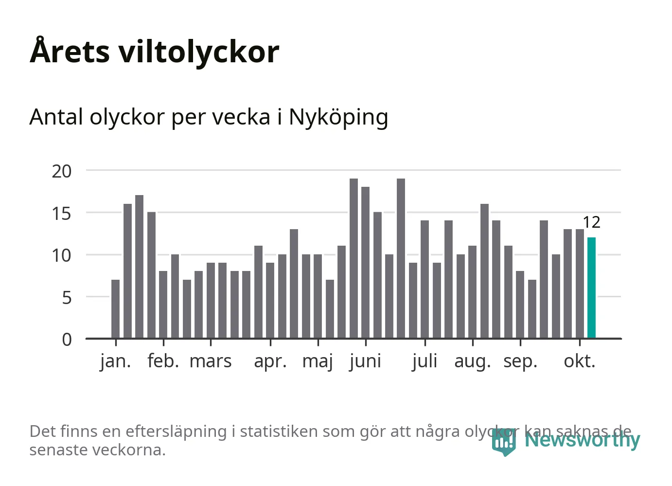 Hittills har tolv viltolyckor rapporterats in i Nyköpings kommun från vecka 42. Se listan här.