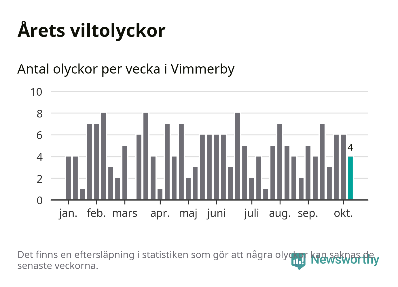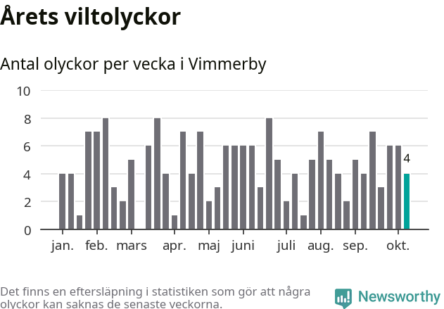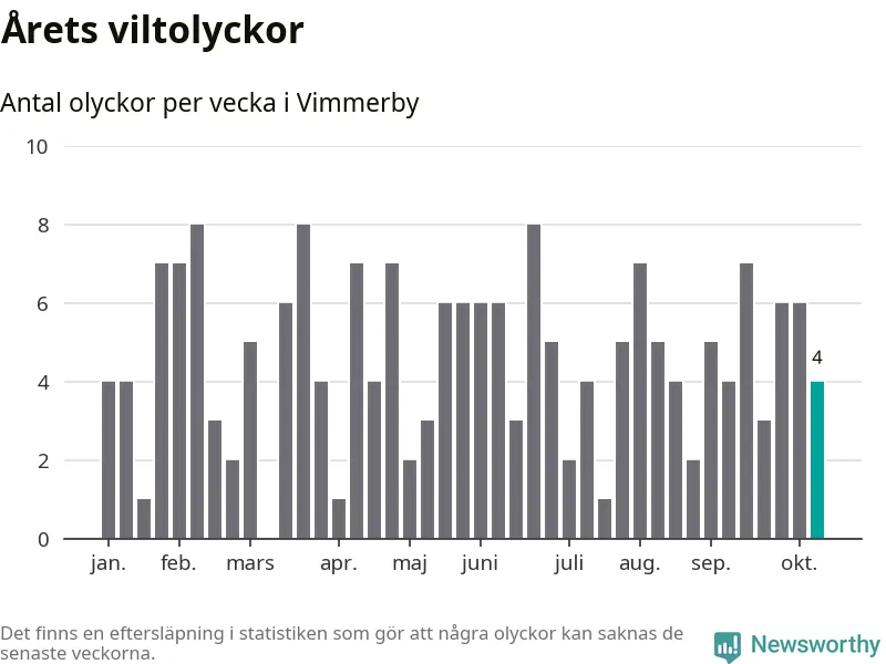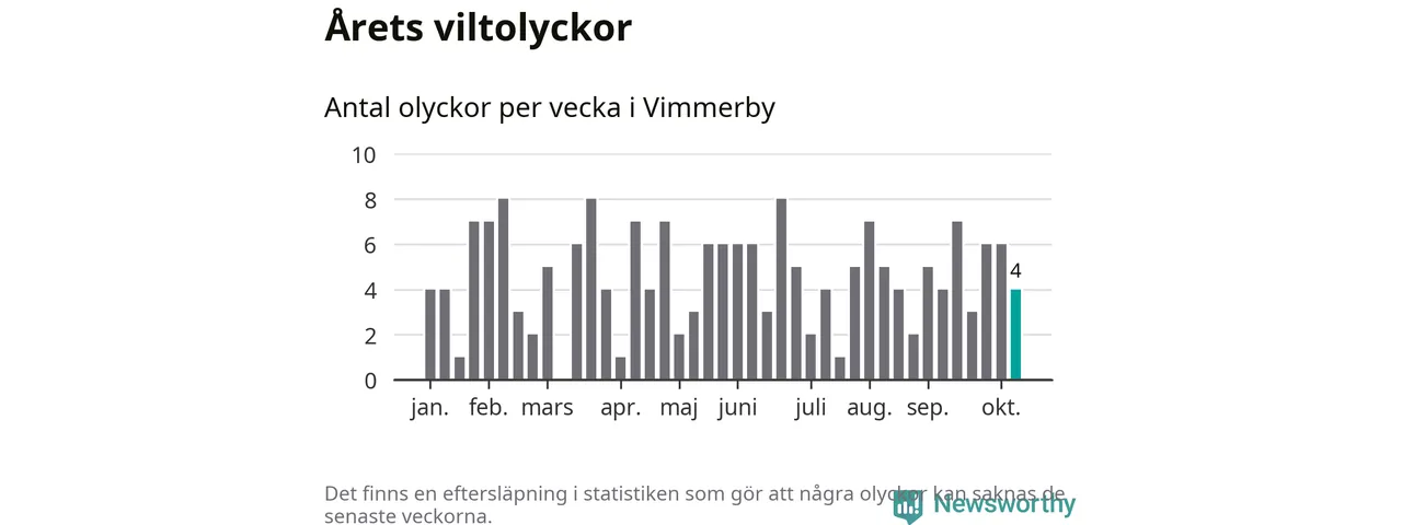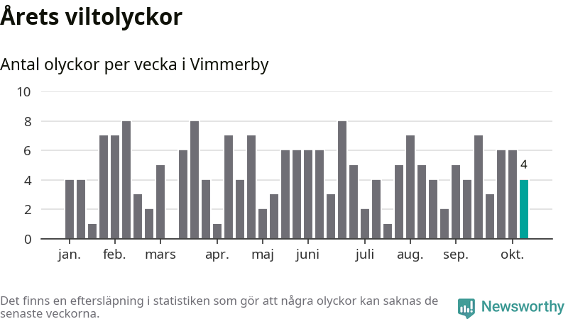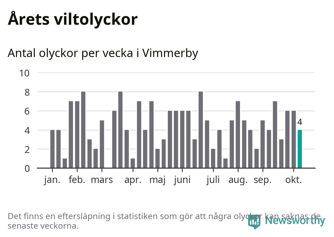 Hittills har fyra viltolyckor rapporterats in i Vimmerby kommun från vecka 42. Se listan här.