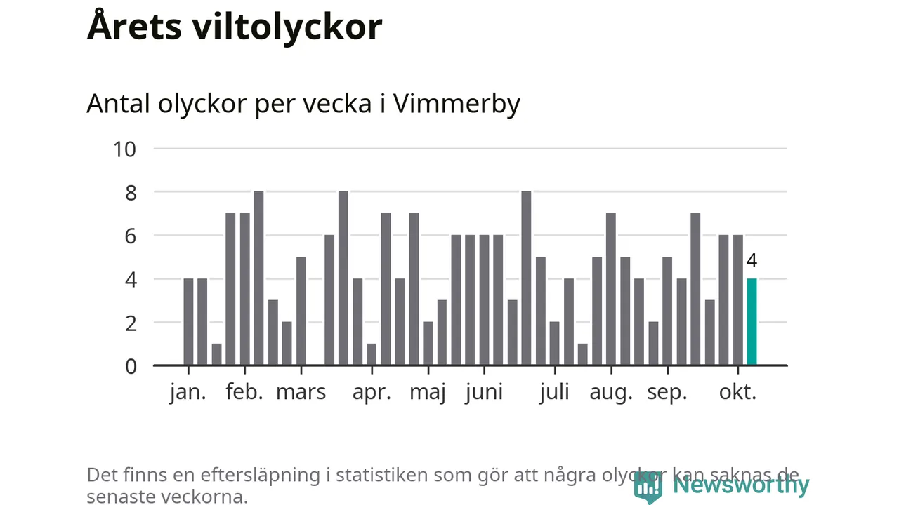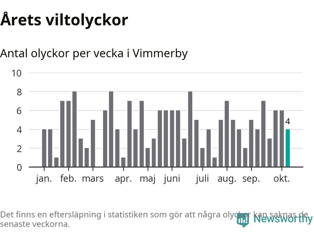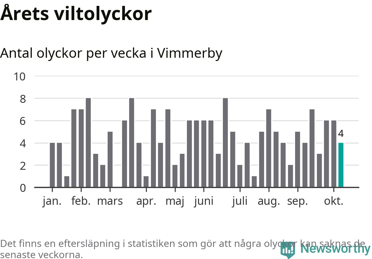 Hittills har fyra viltolyckor rapporterats in i Vimmerby kommun från vecka 42. Se listan här.