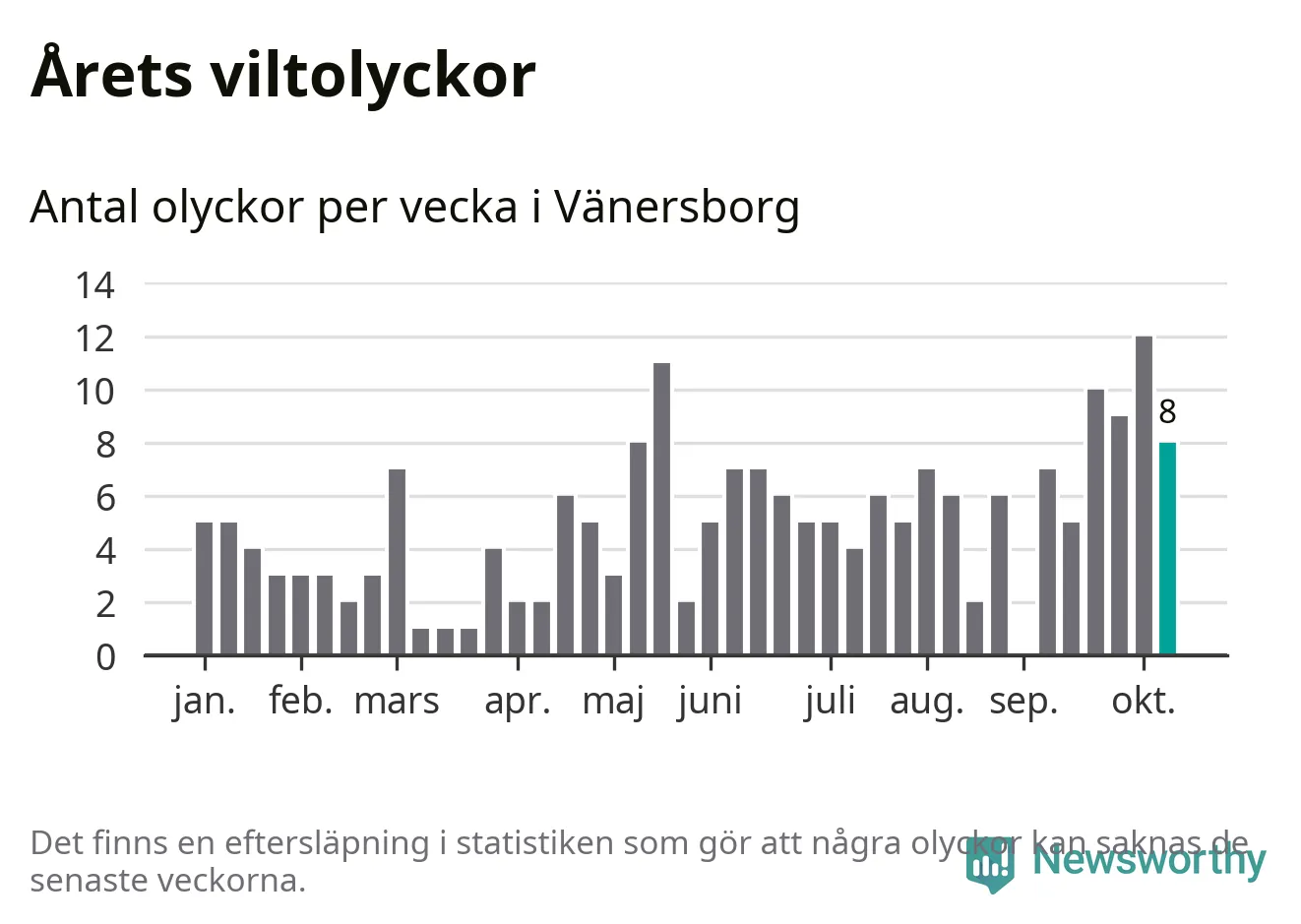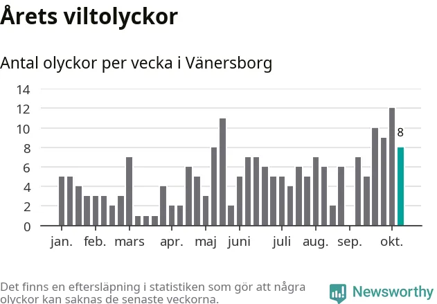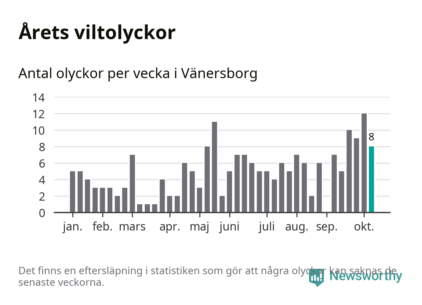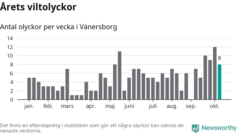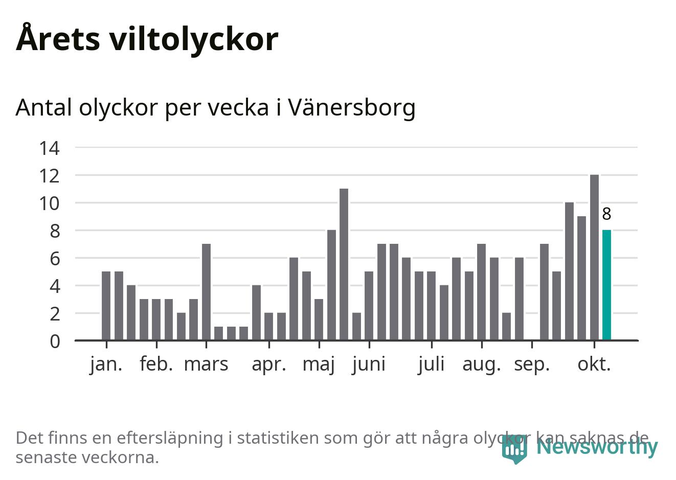 Hittills har åtta viltolyckor rapporterats in i Vänersborgs kommun från vecka 42. Se listan här.