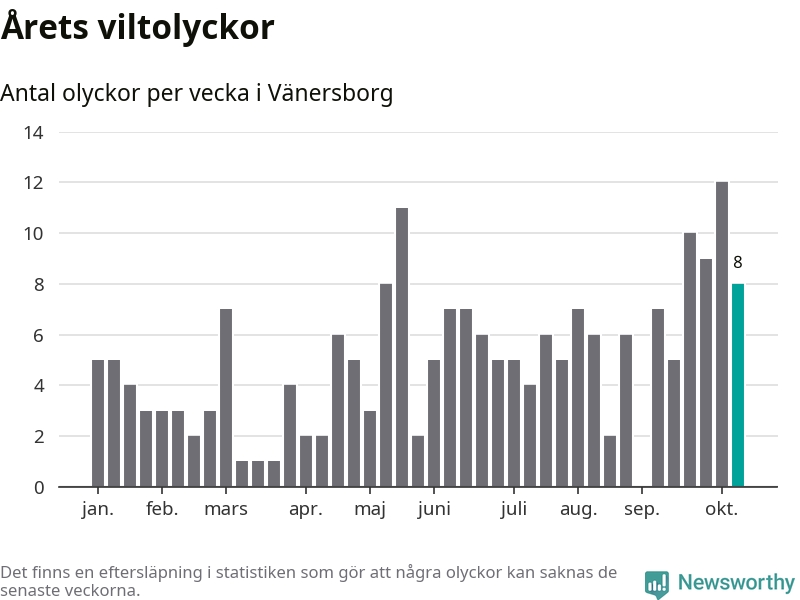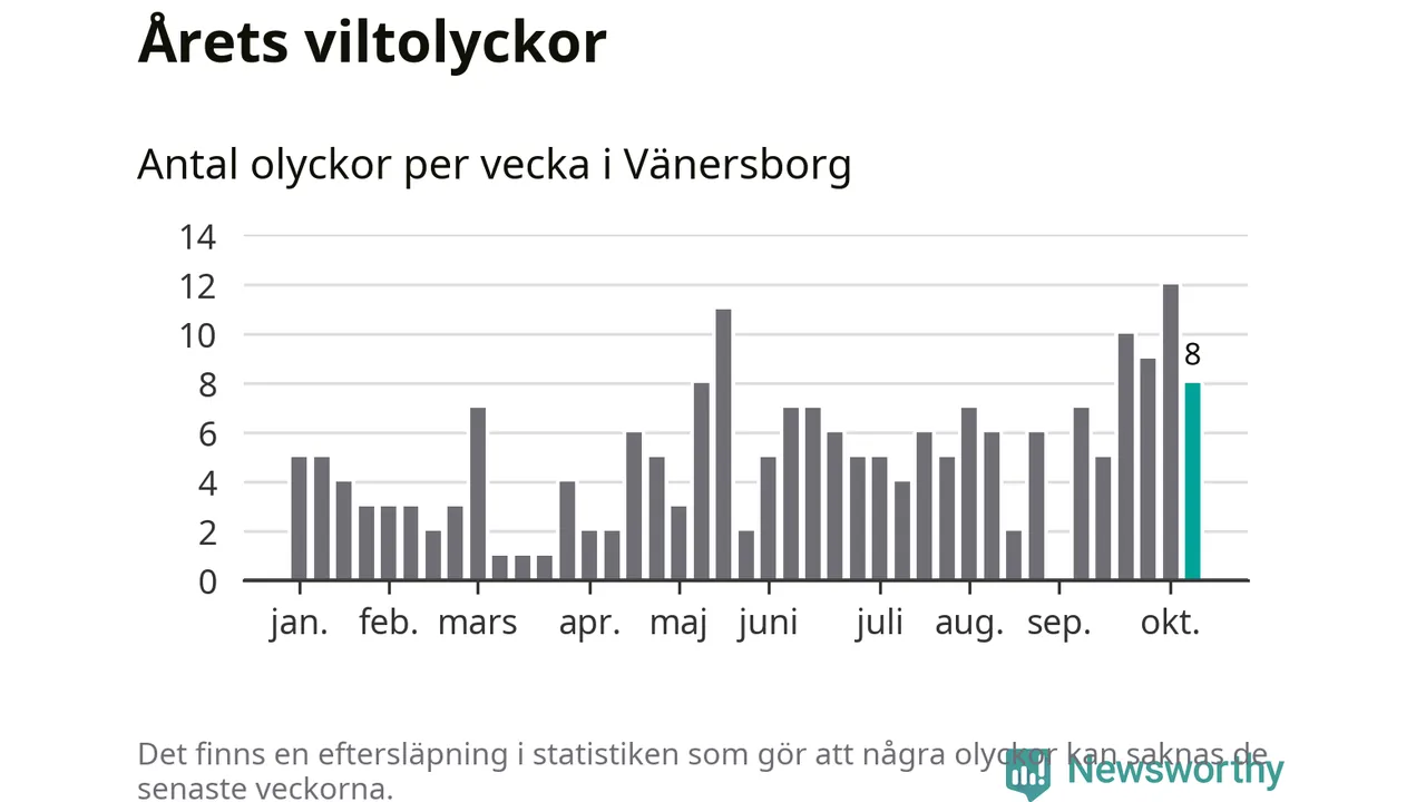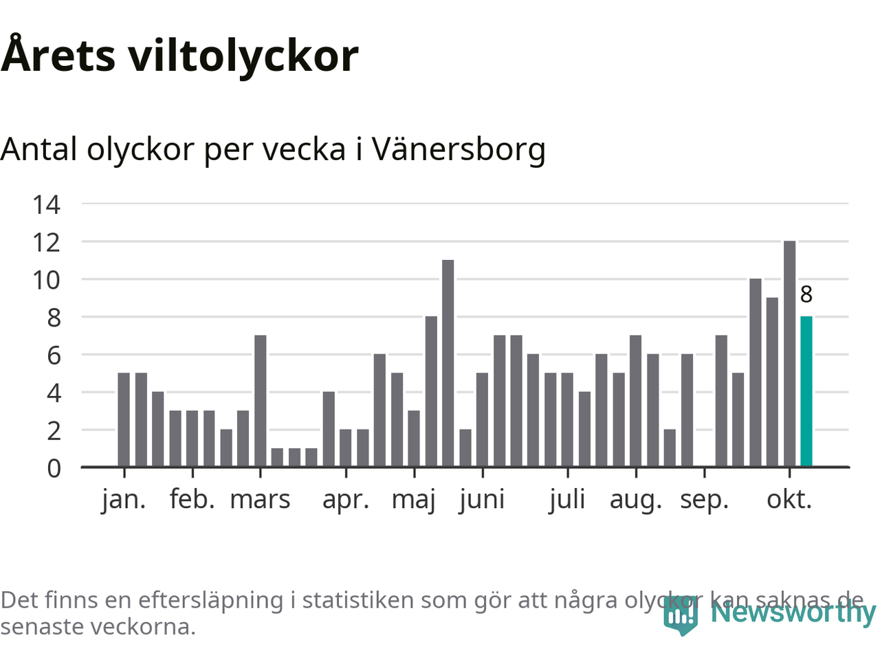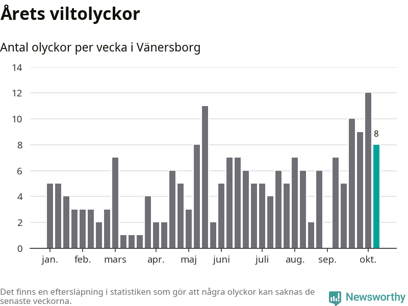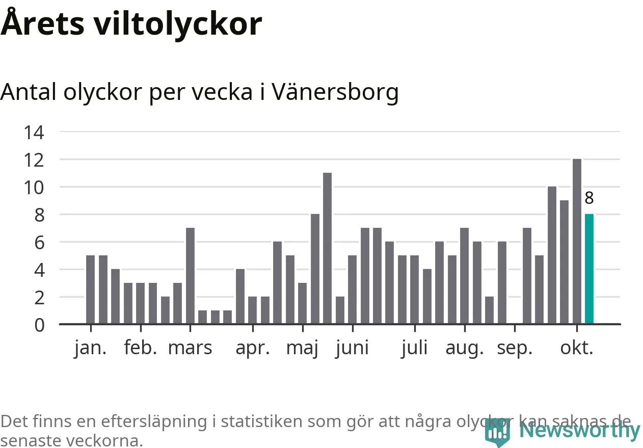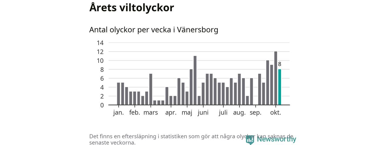 Hittills har åtta viltolyckor rapporterats in i Vänersborgs kommun från vecka 42. Se listan här.