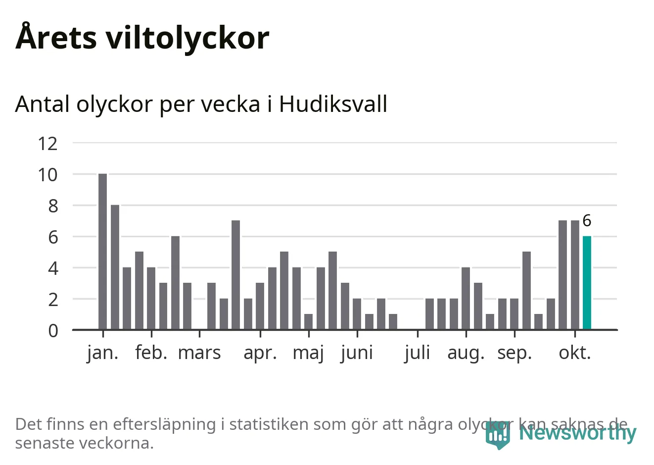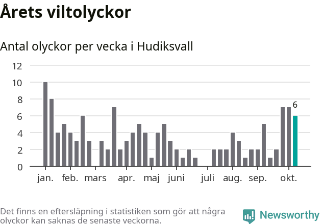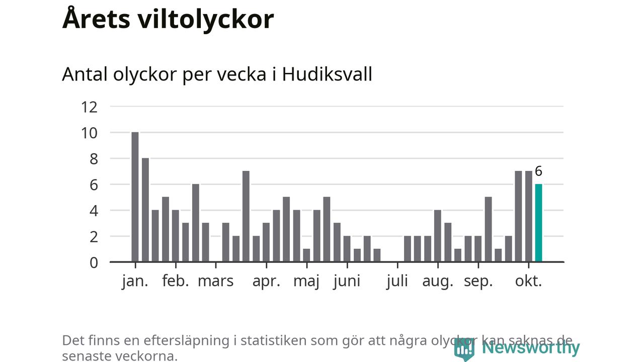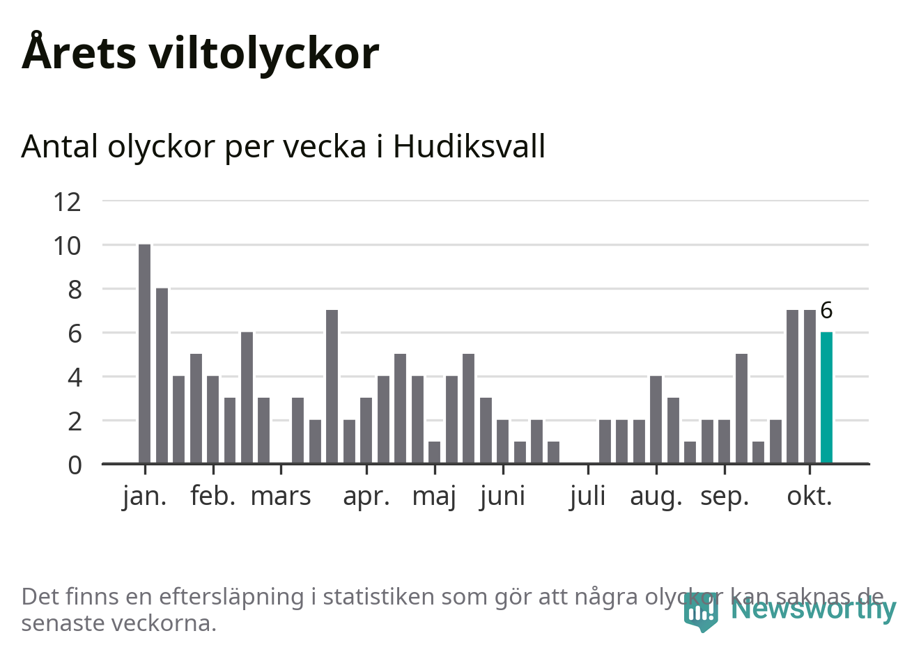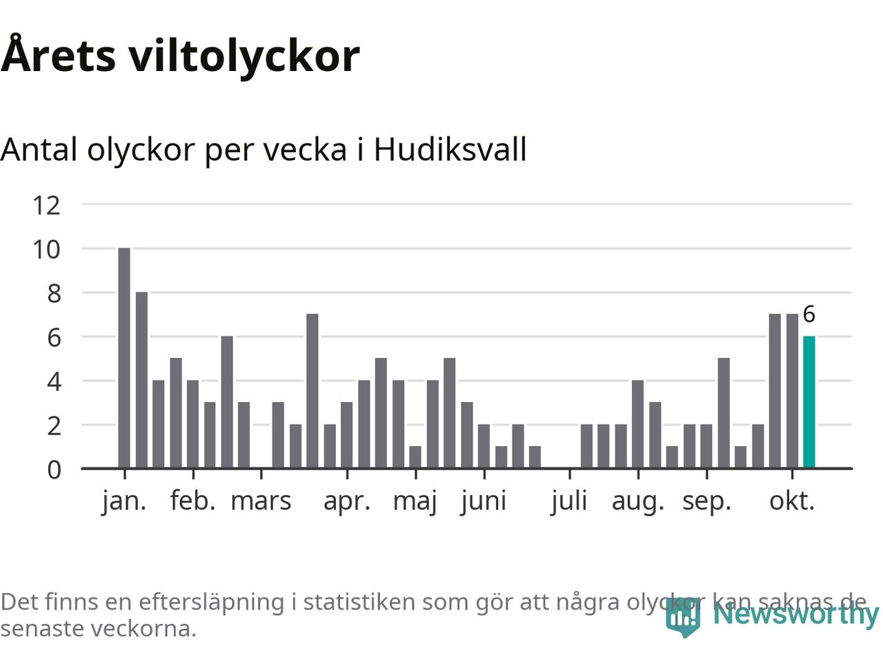 Hittills har sex viltolyckor rapporterats in i Hudiksvalls kommun från vecka 42. Se listan här.