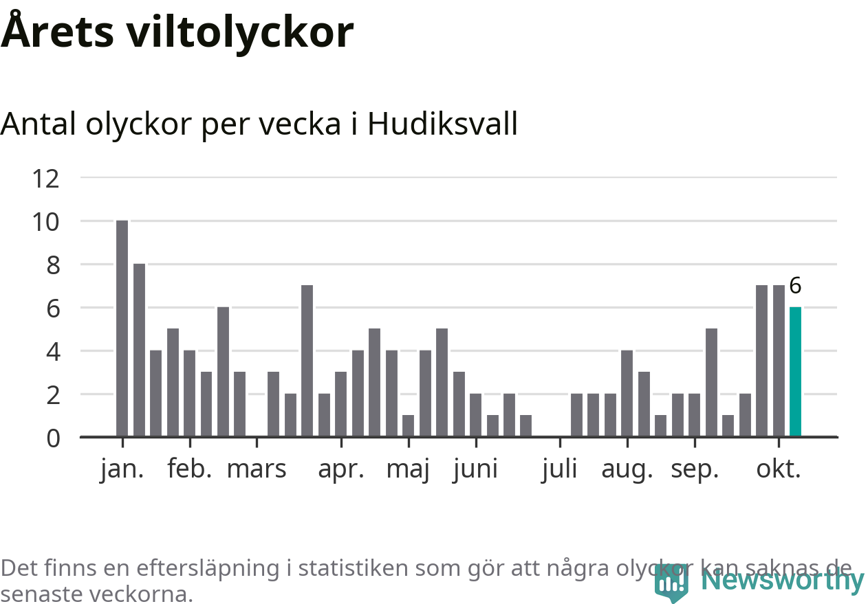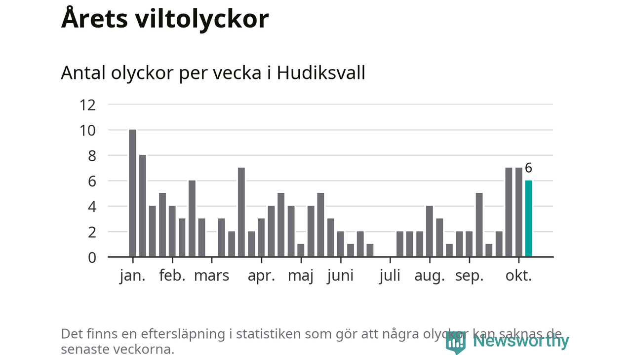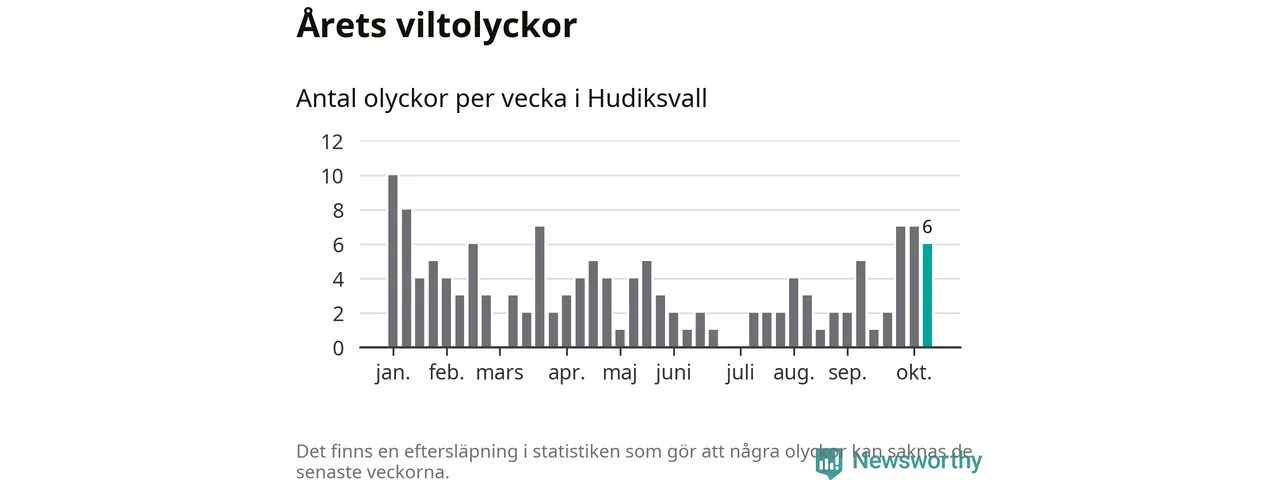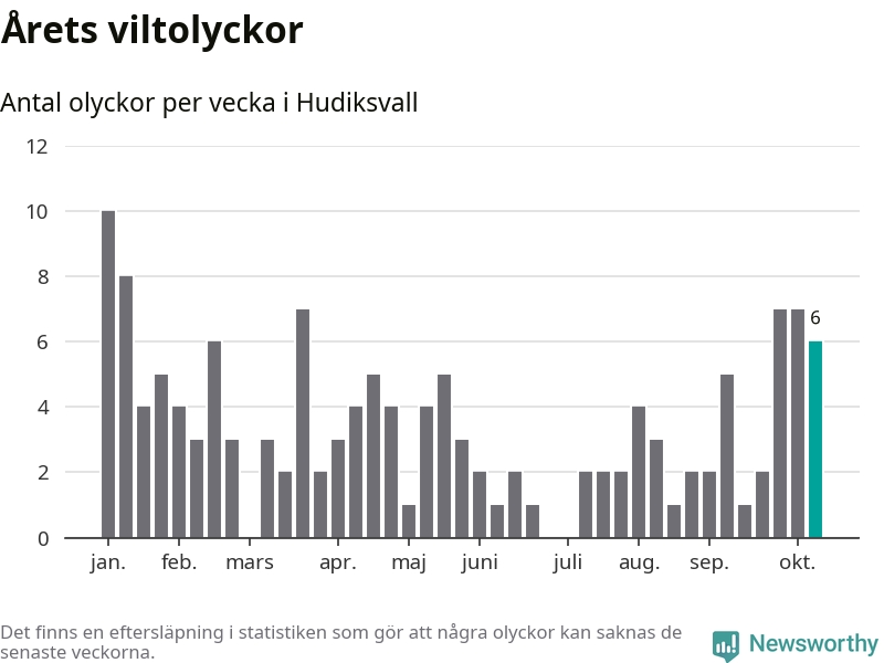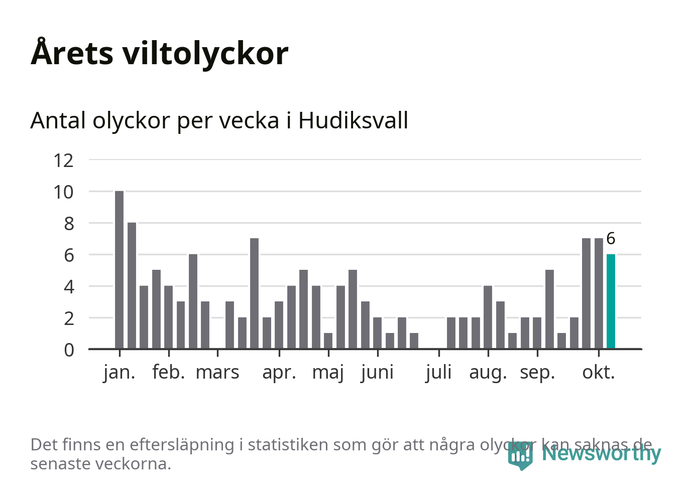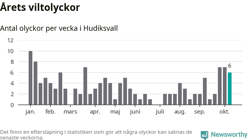 Hittills har sex viltolyckor rapporterats in i Hudiksvalls kommun från vecka 42. Se listan här.