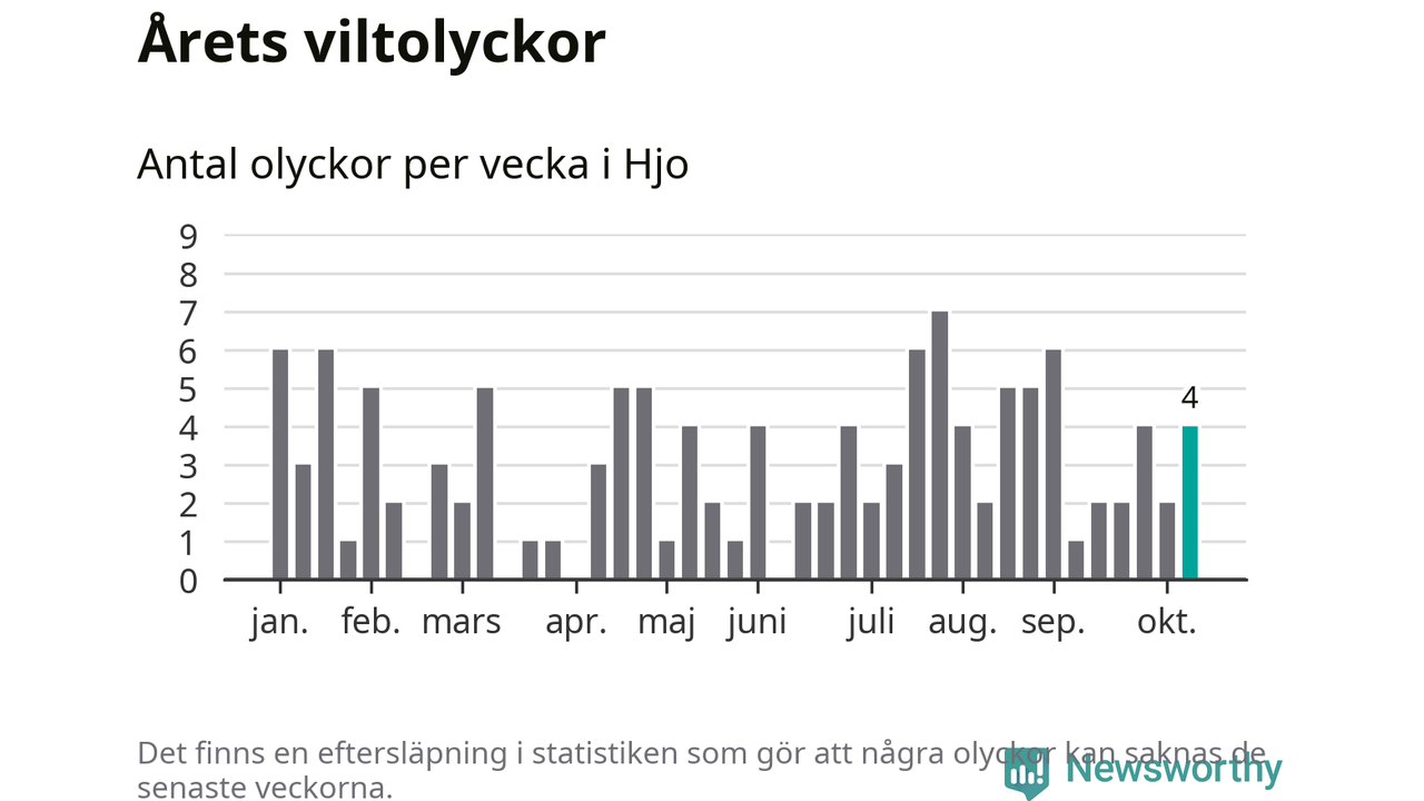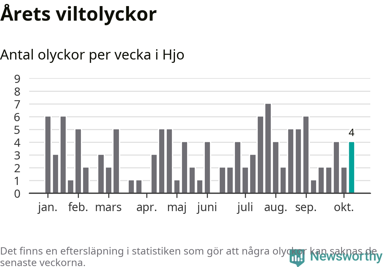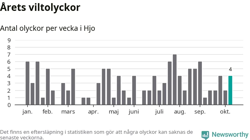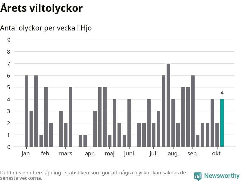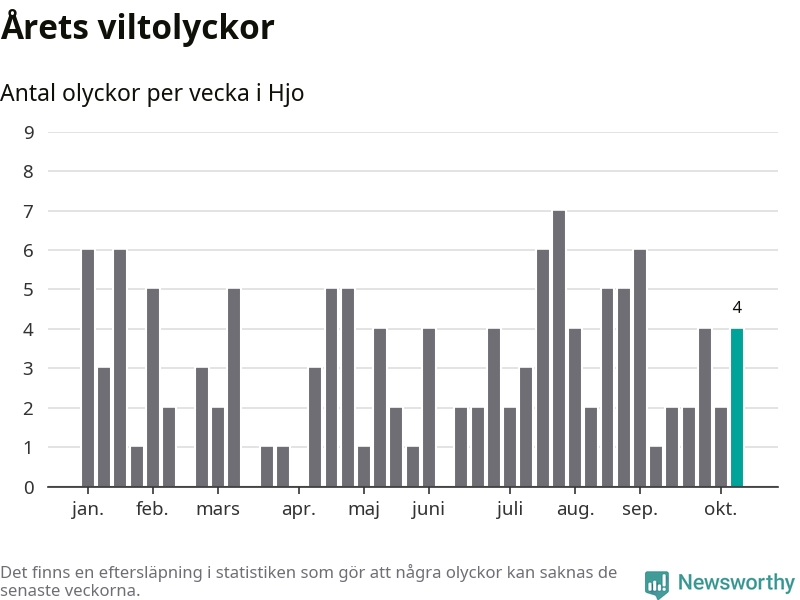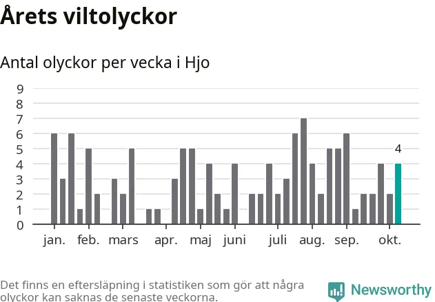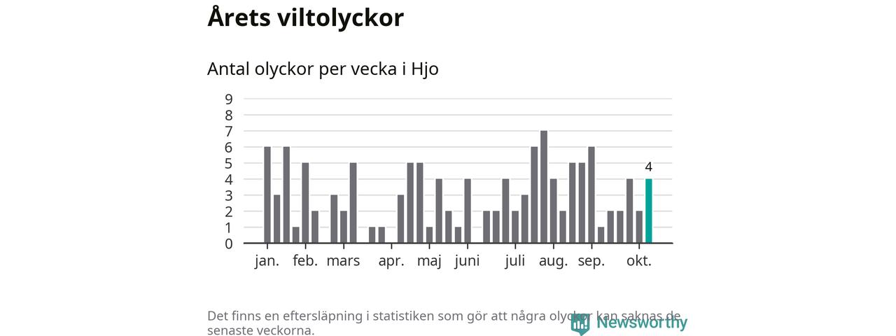 Hittills har fyra viltolyckor rapporterats in i Hjo kommun från vecka 42. Se listan här.