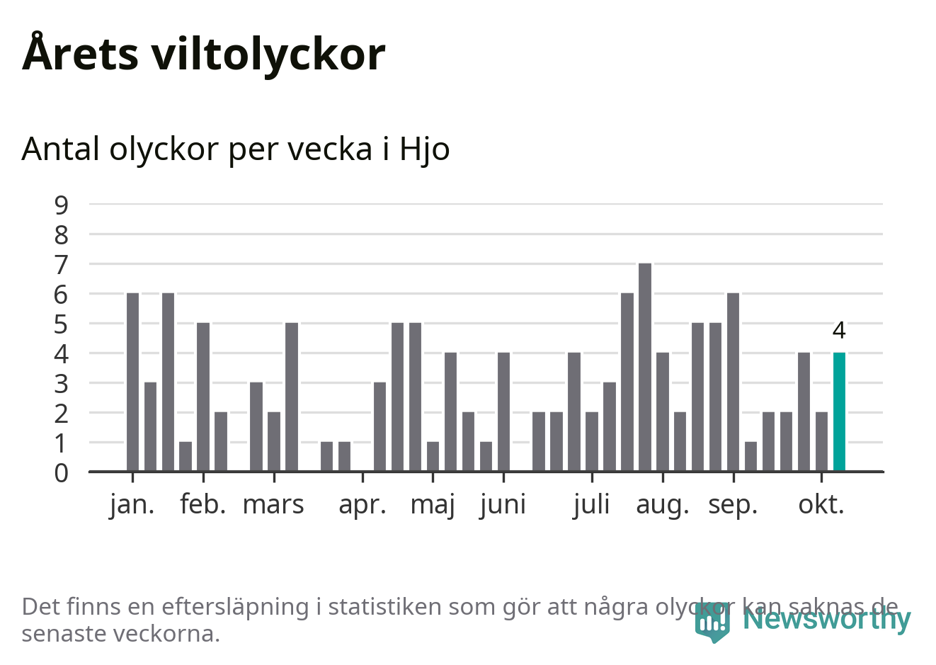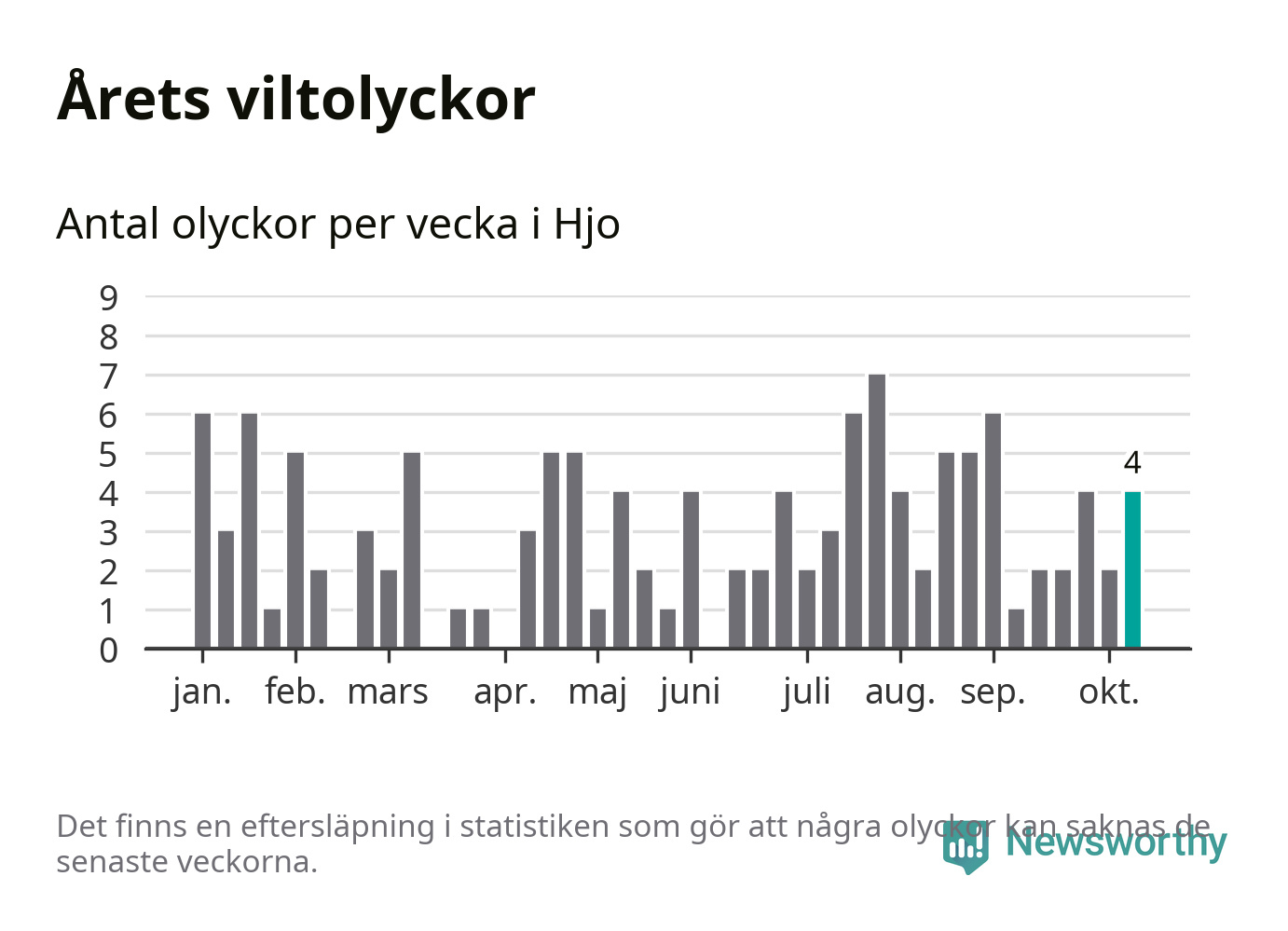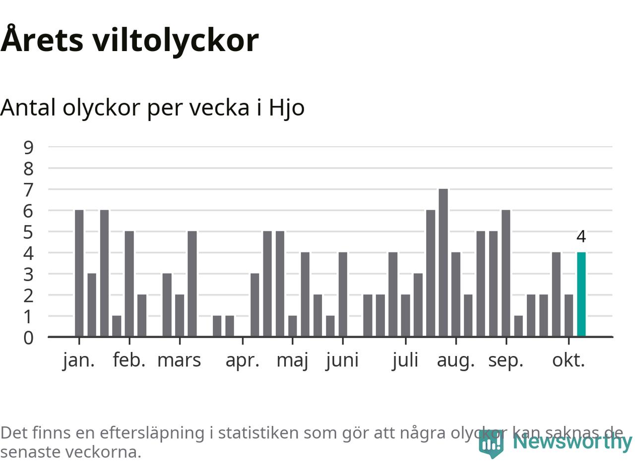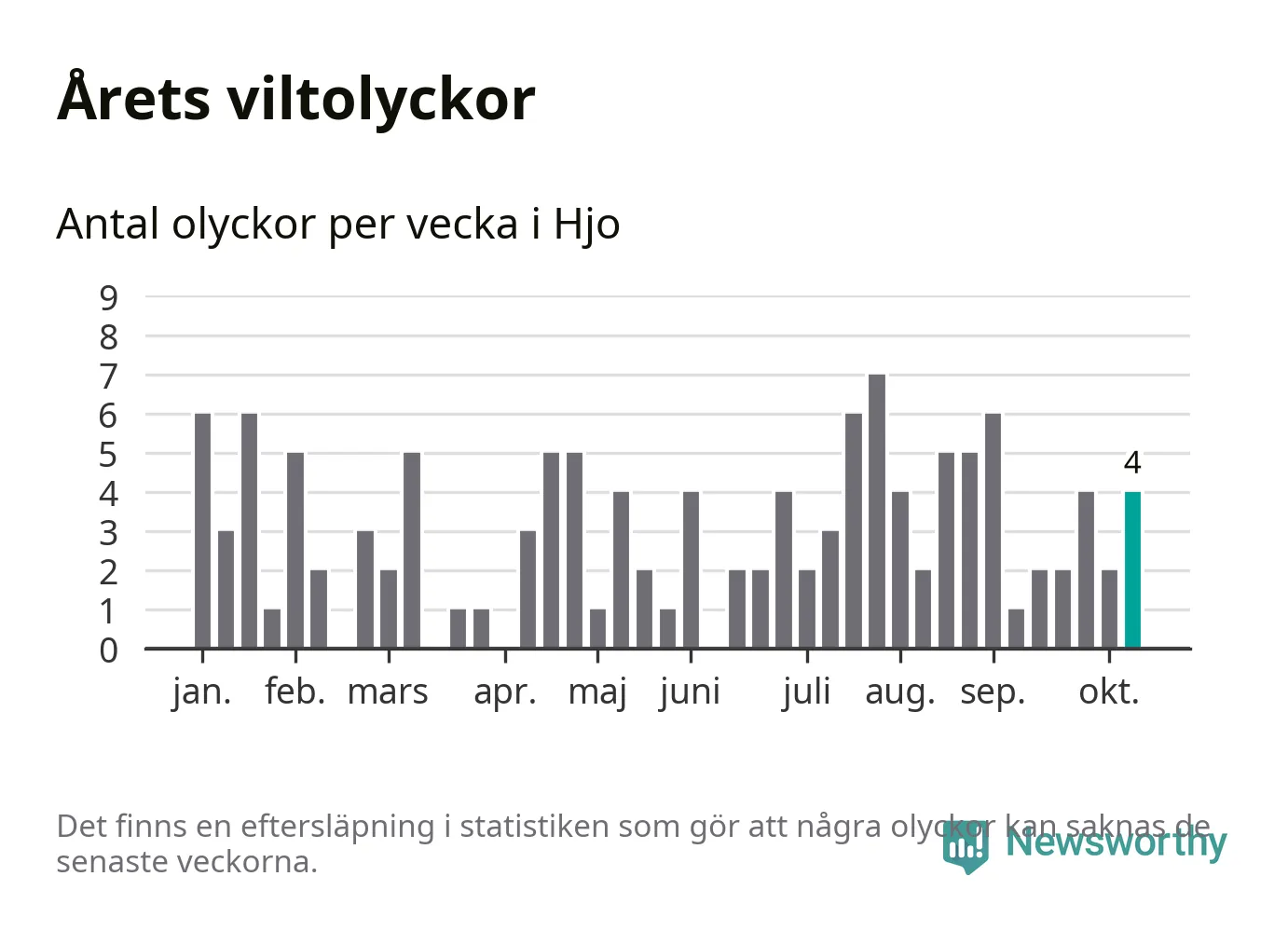 Hittills har fyra viltolyckor rapporterats in i Hjo kommun från vecka 42. Se listan här.