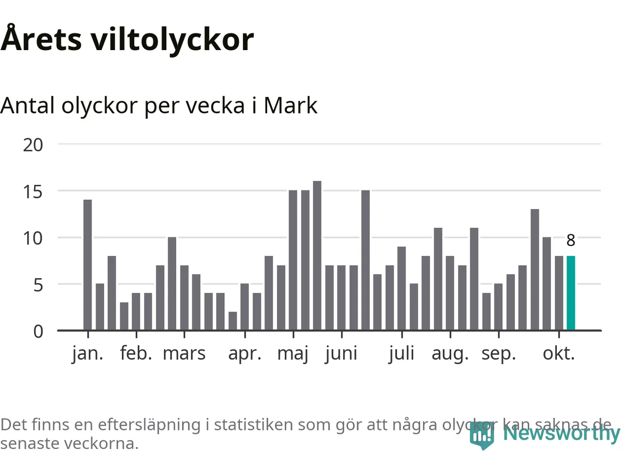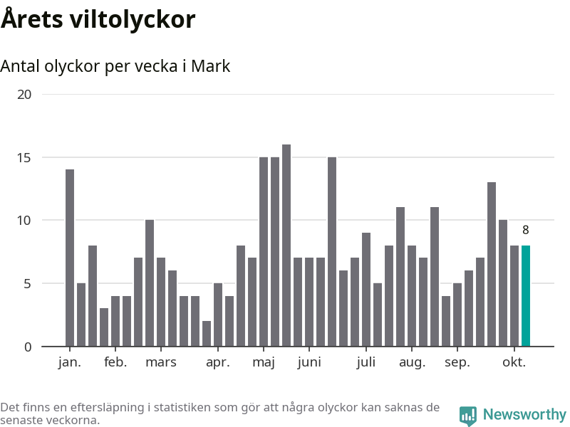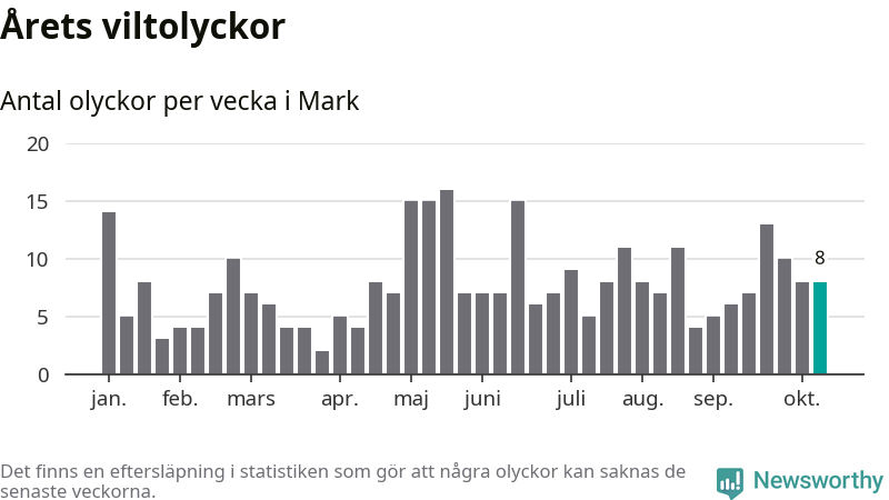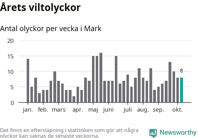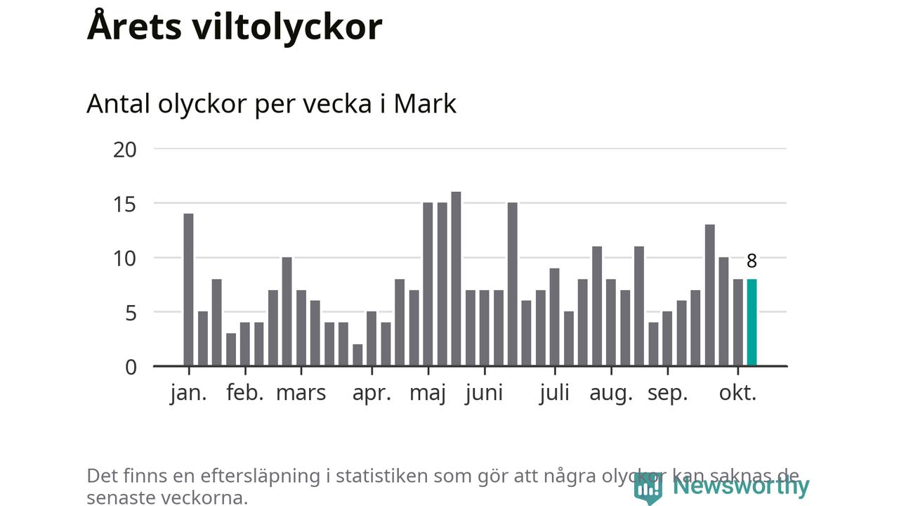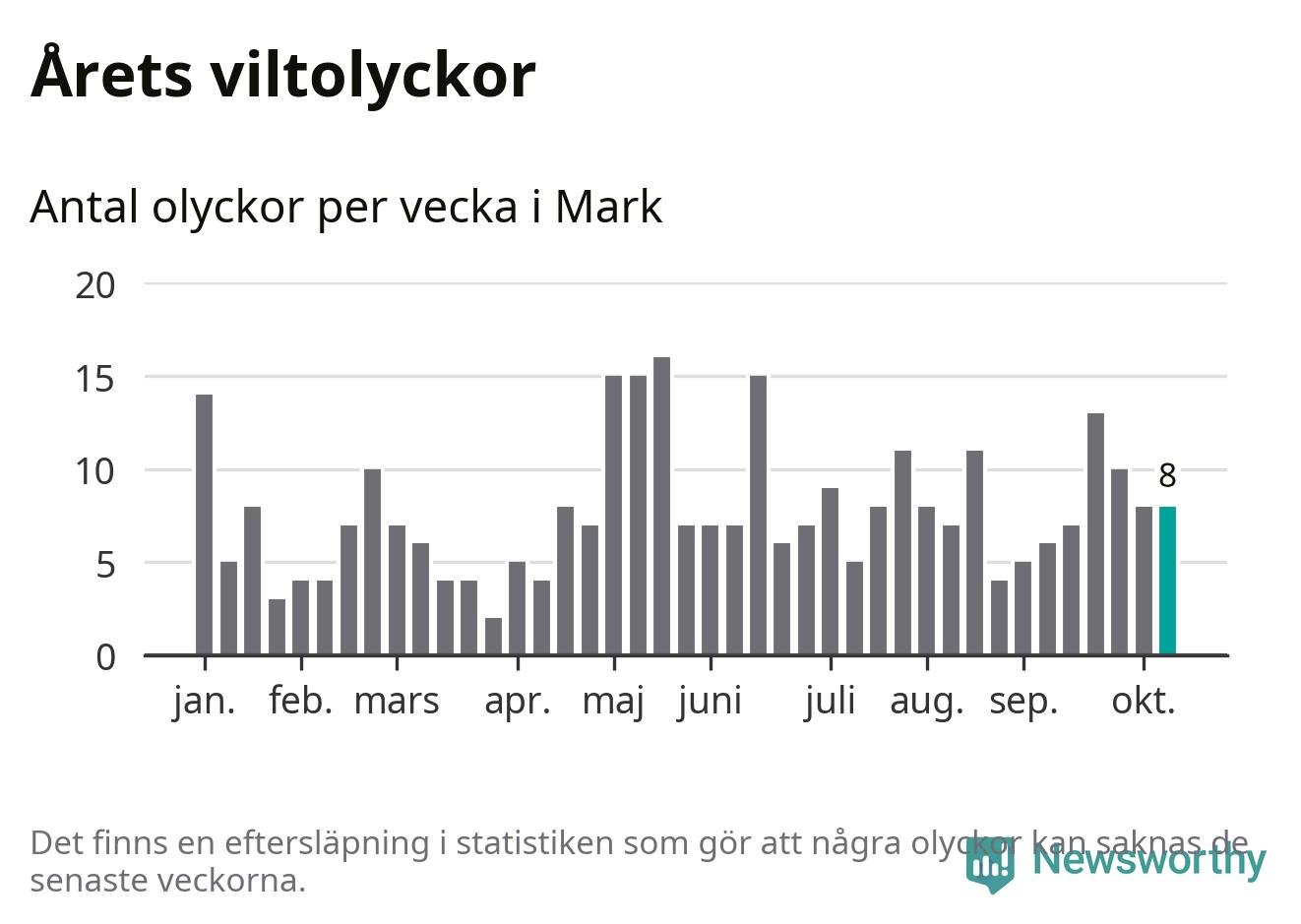 Hittills har åtta viltolyckor rapporterats in i Marks kommun från vecka 42. Se listan här.